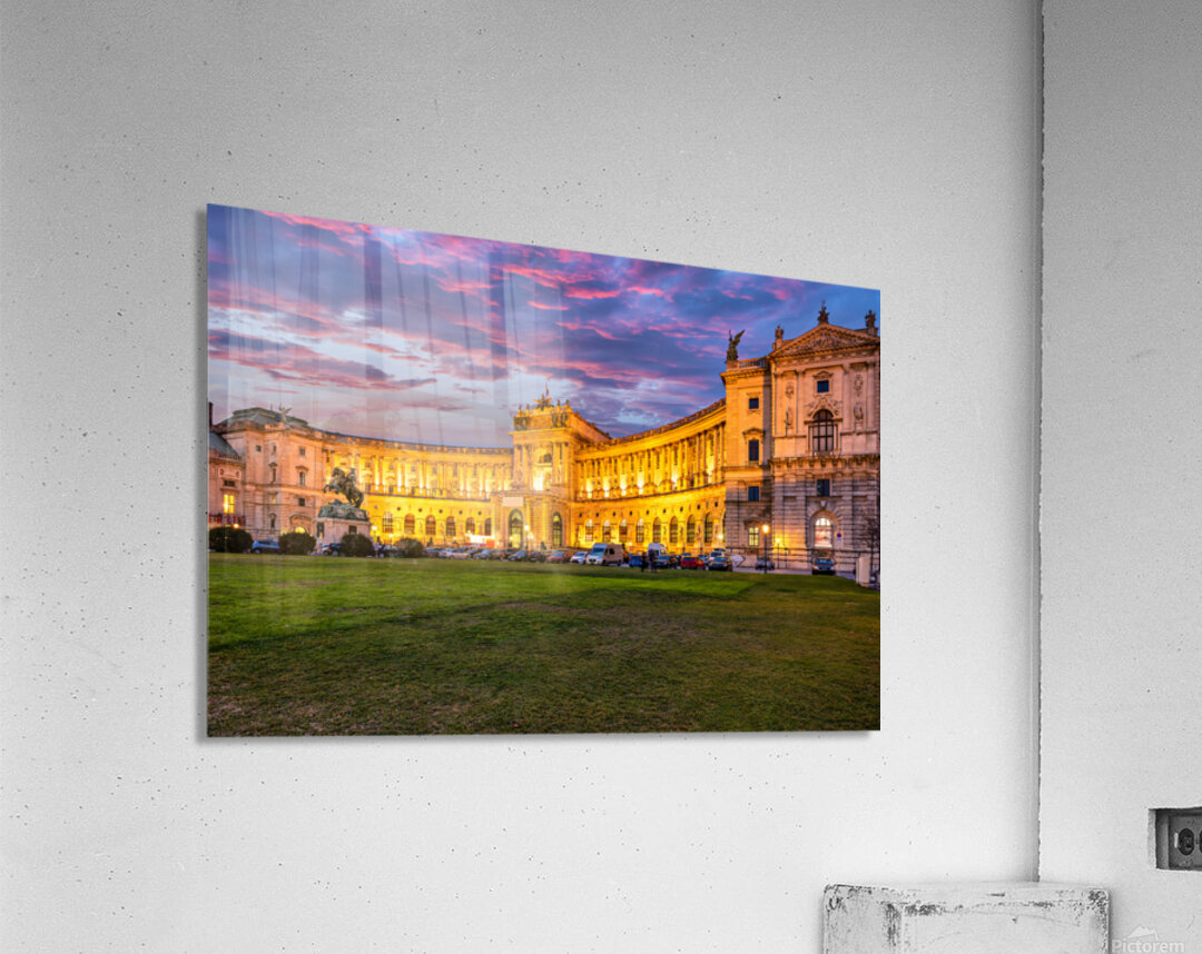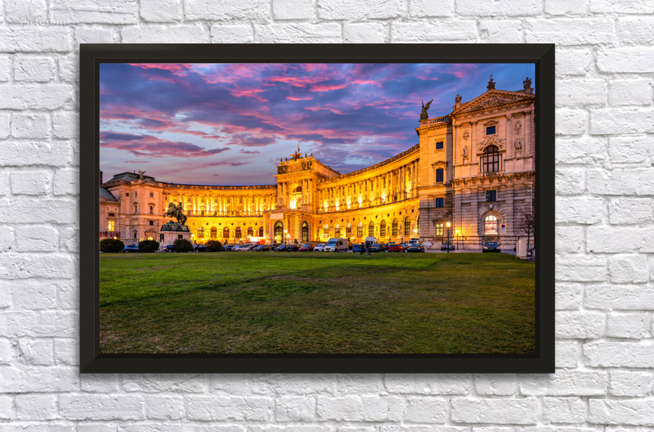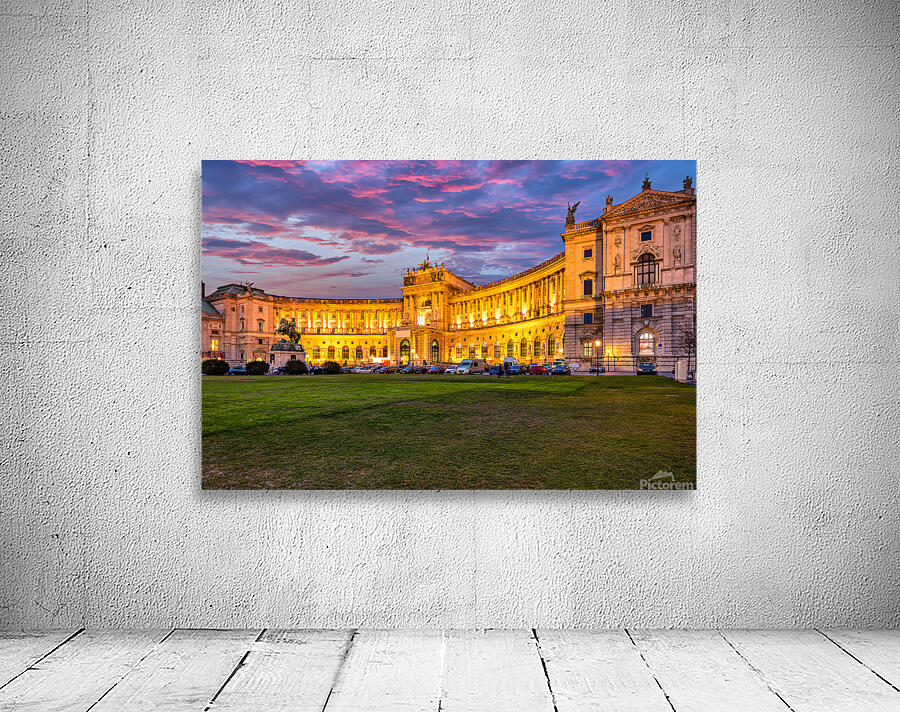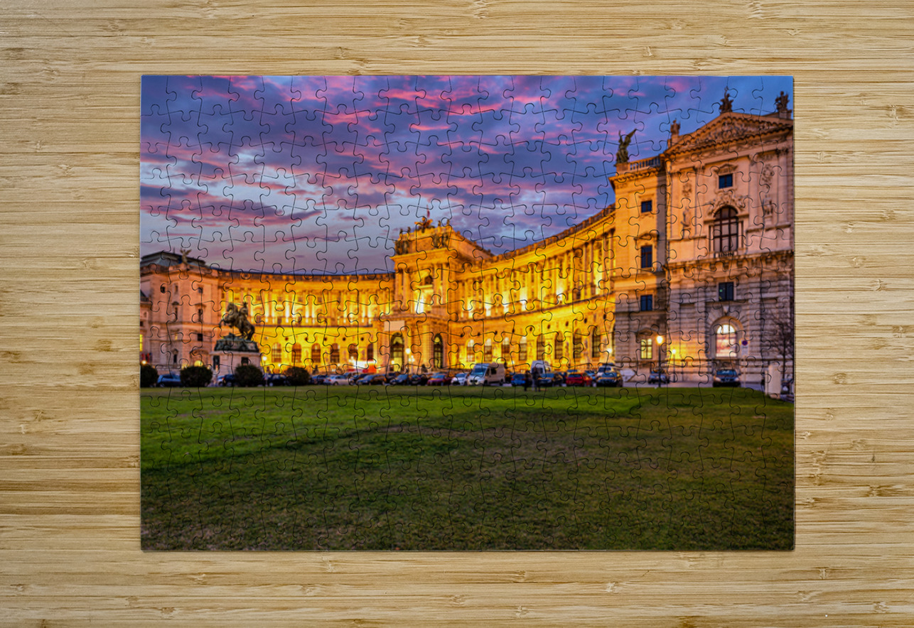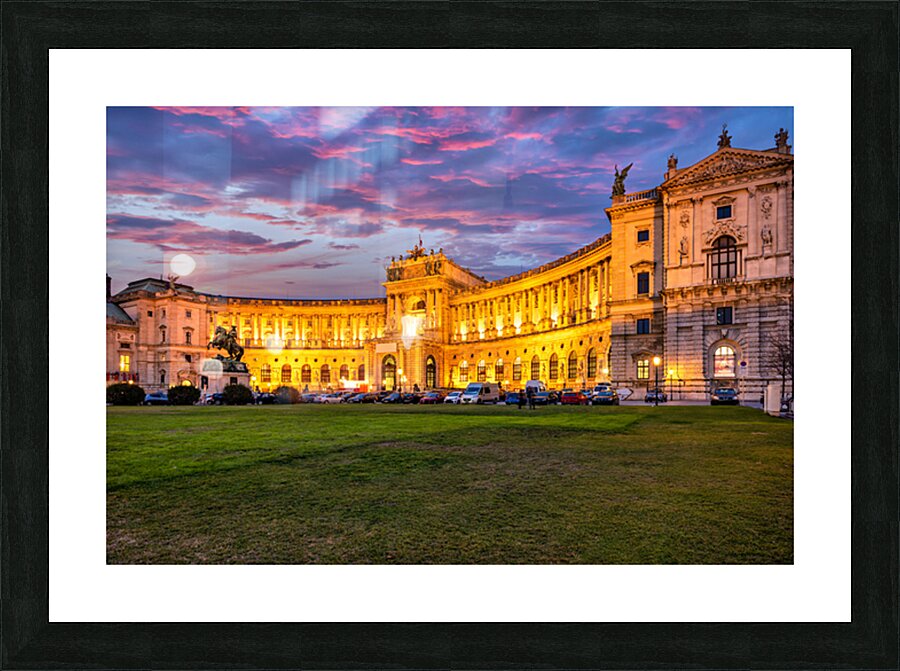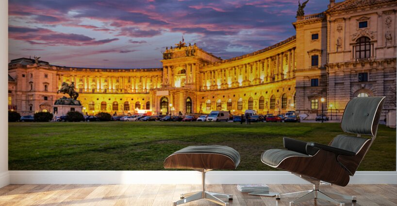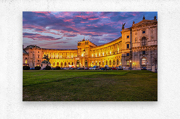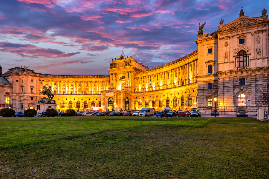 Hofburg Palace in Vienna Austria illuminated at dusk under a vibrant sky with a statue and parked cars showcasing its historic grandeur.