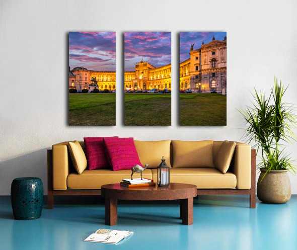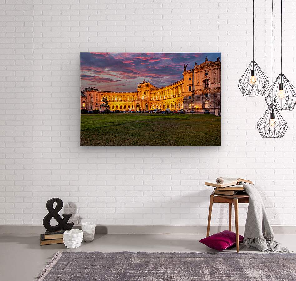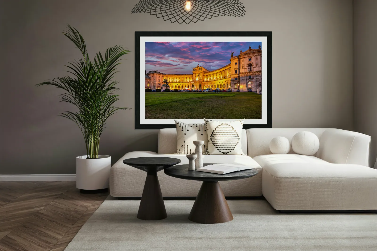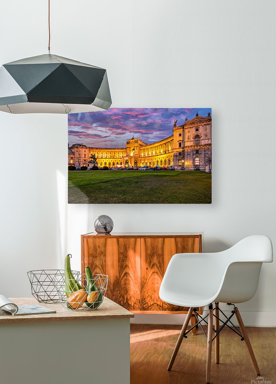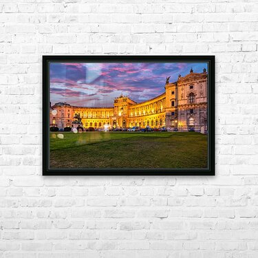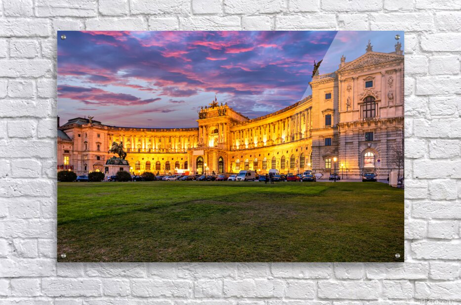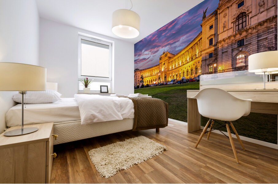 Hofburg Palace in Vienna Austria illuminated at dusk under a vibrant sky with a statue and parked cars showcasing its historic grandeur.