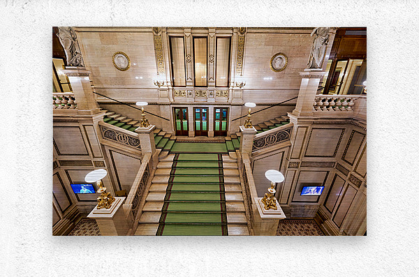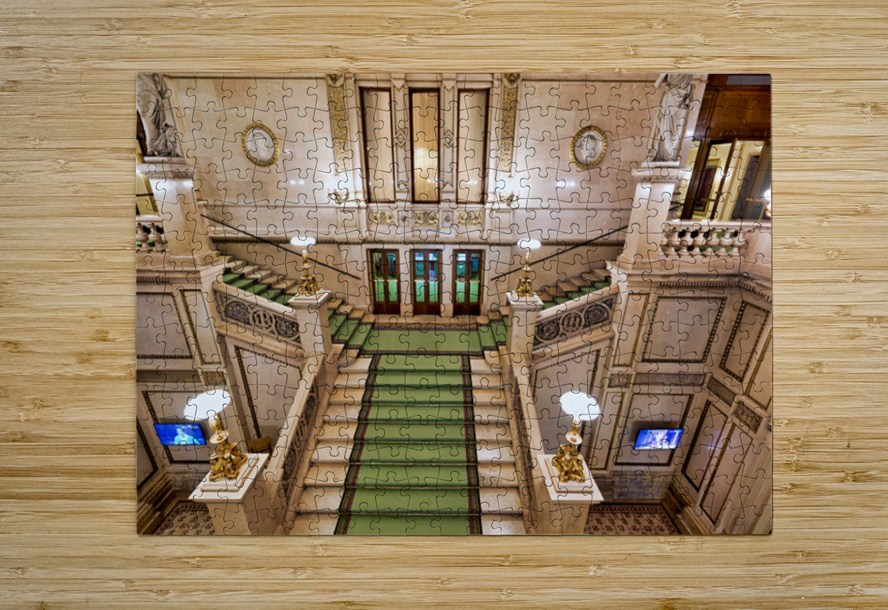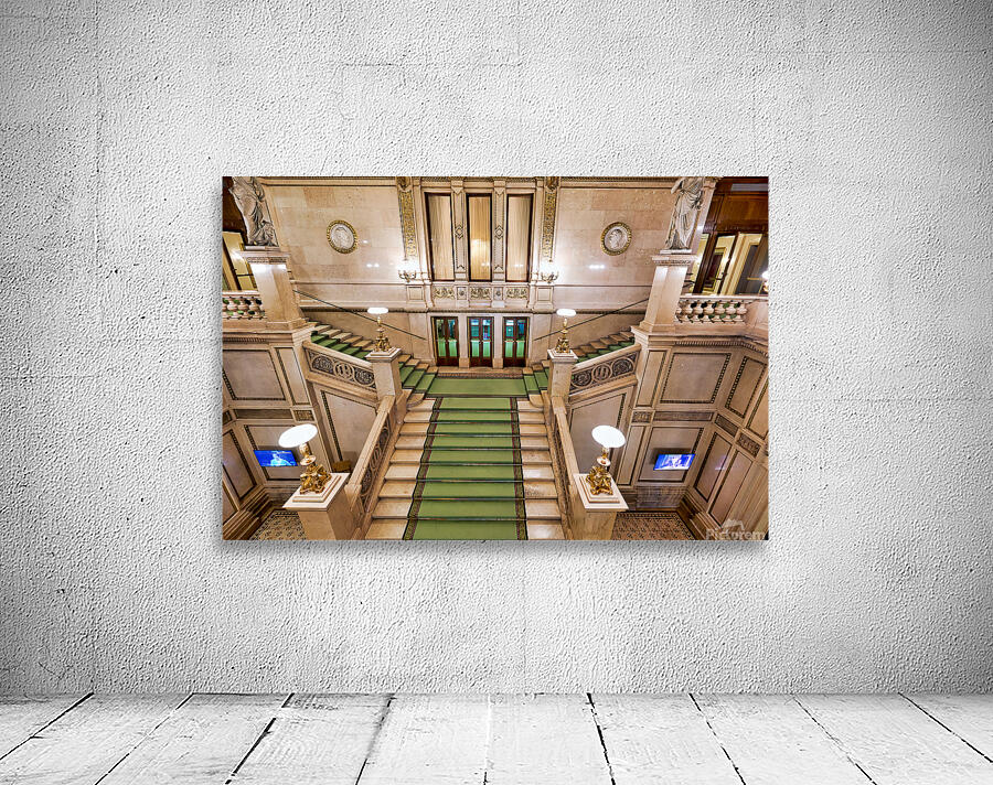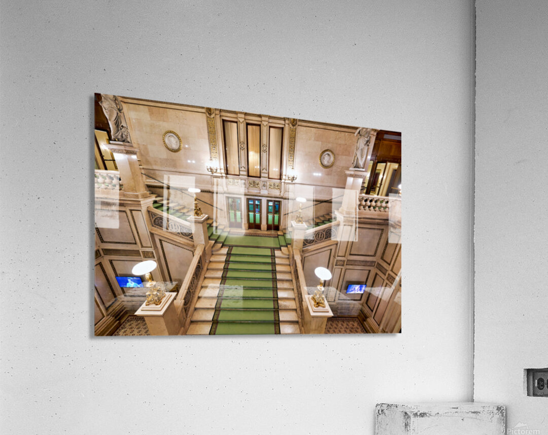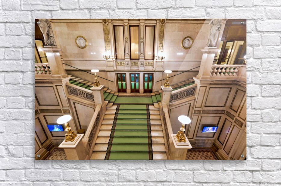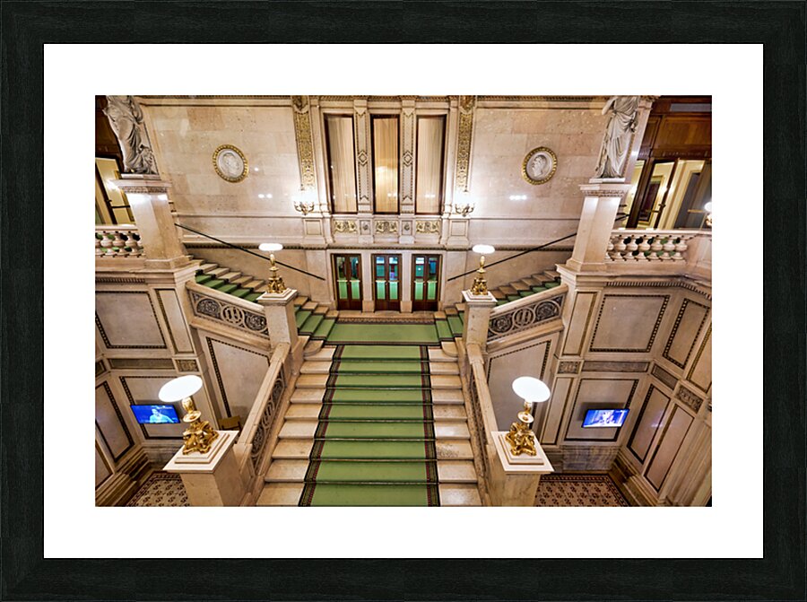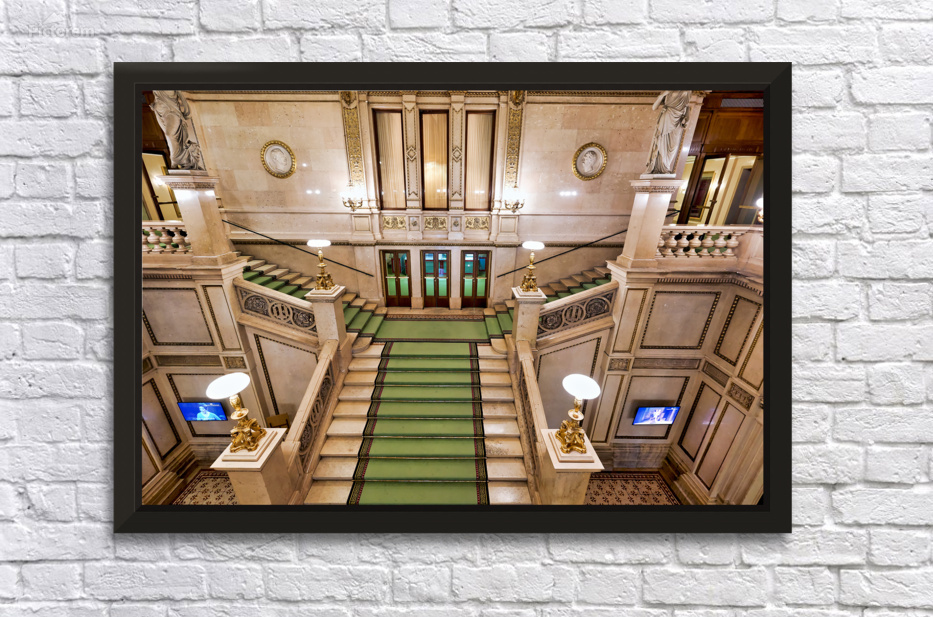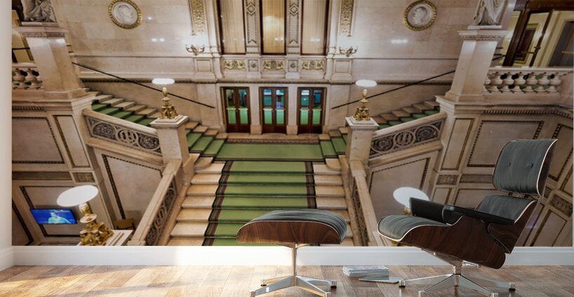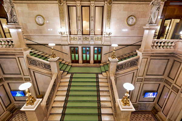 Grand staircase at the Vienna State Opera Wiener Staatsoper in Vienna Austria featuring ornate architecture statues and portraits of figures like Edua