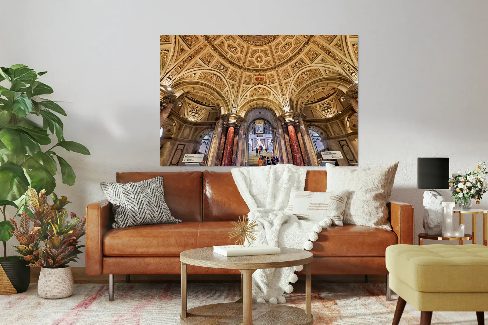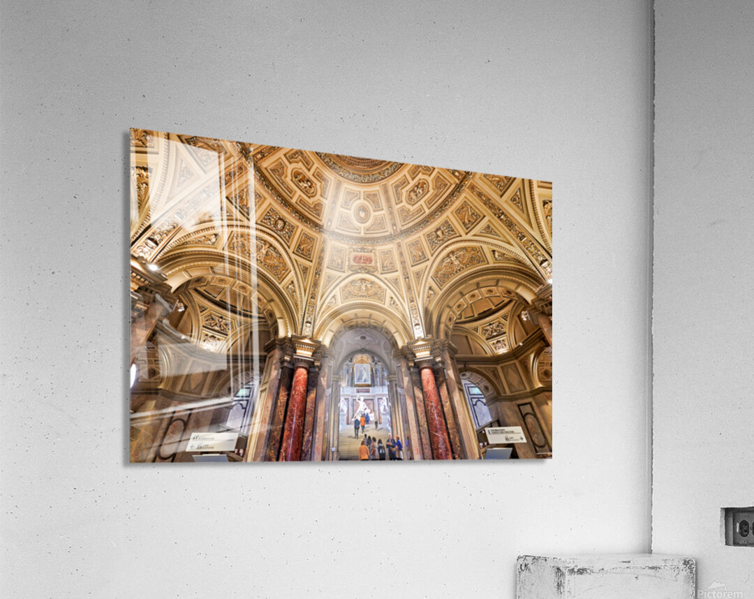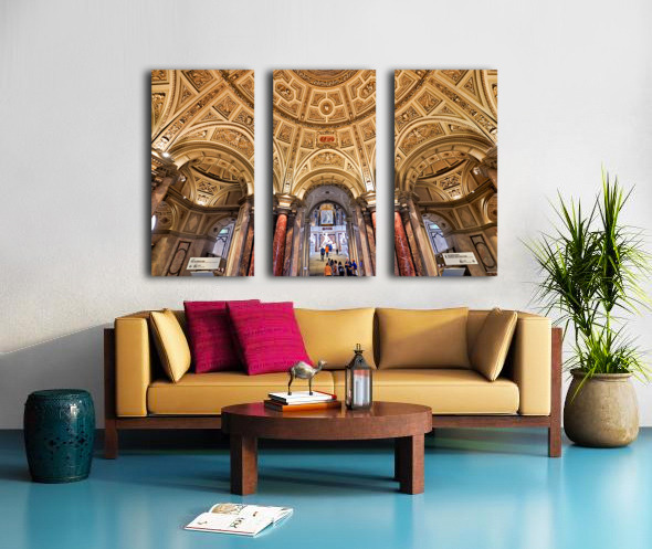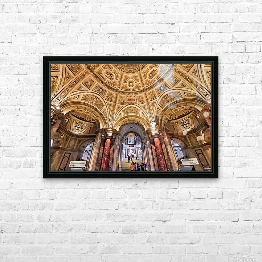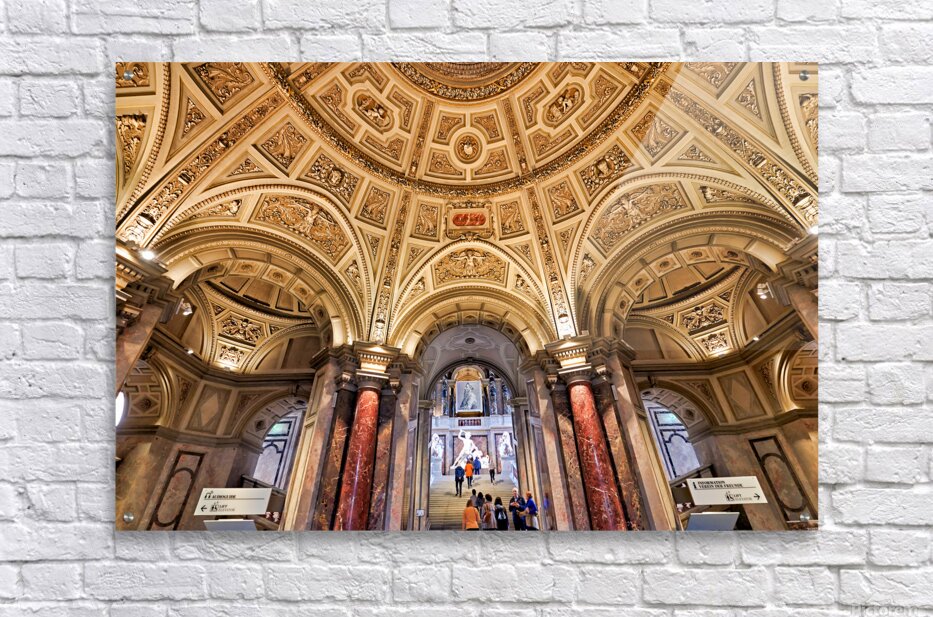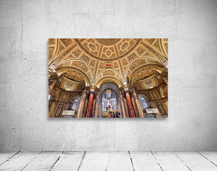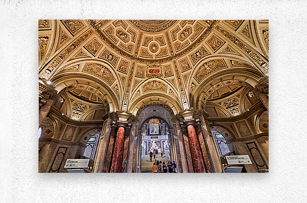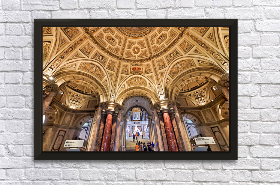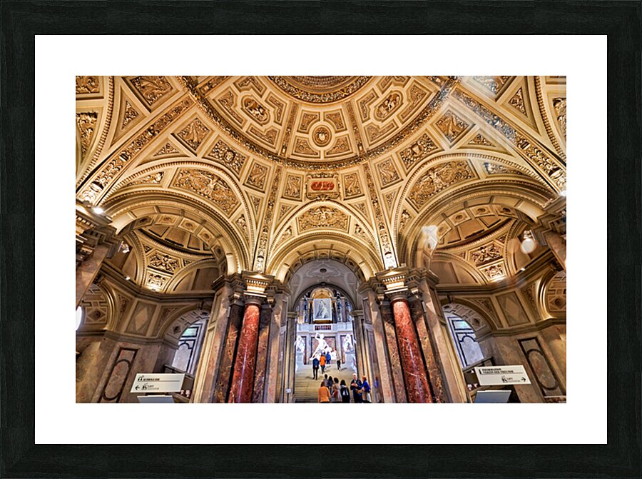 Visitors explore the opulent main hall of the Kunsthistorisches Museum in Vienna Austria admiring its ornate architecture and preparing to view art.