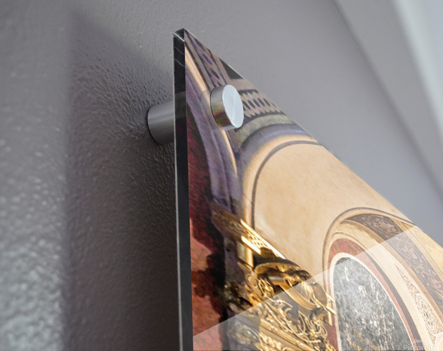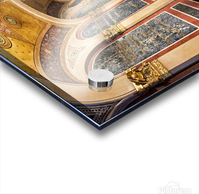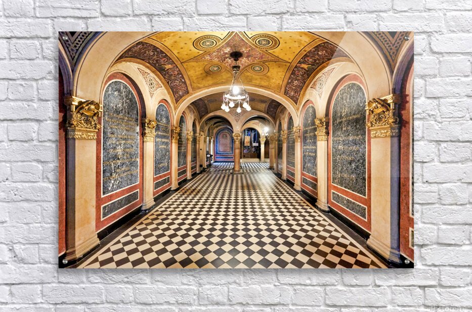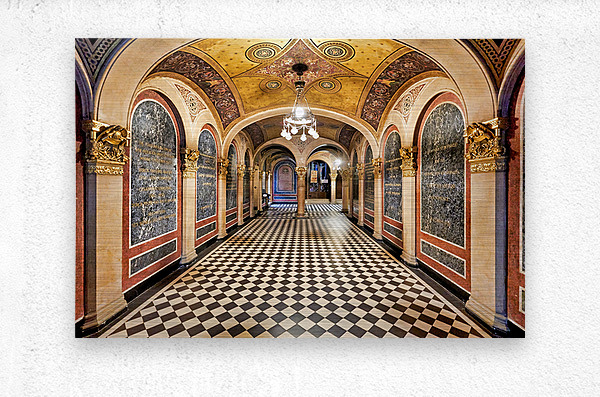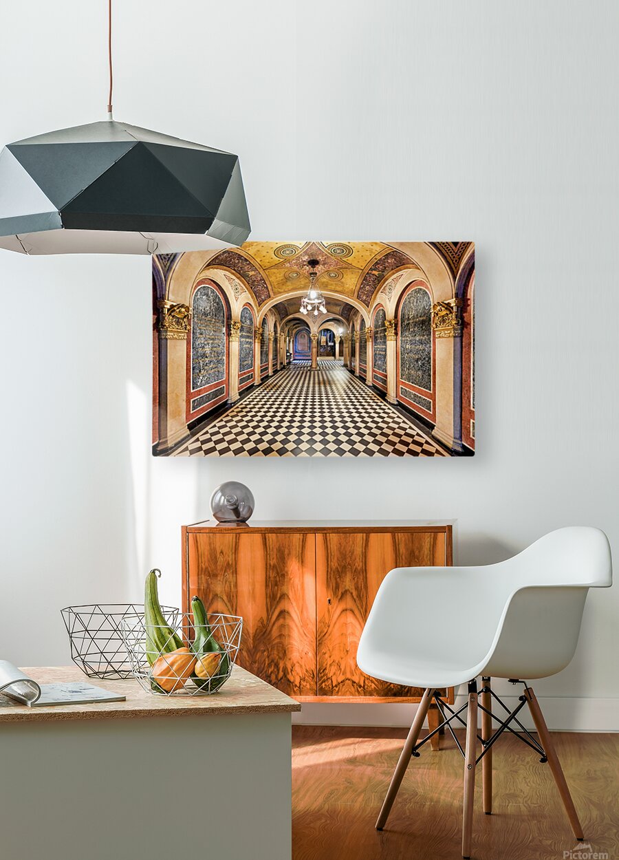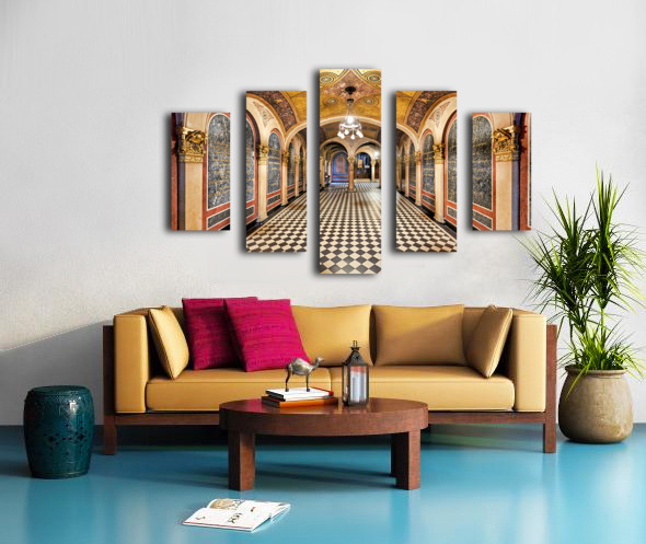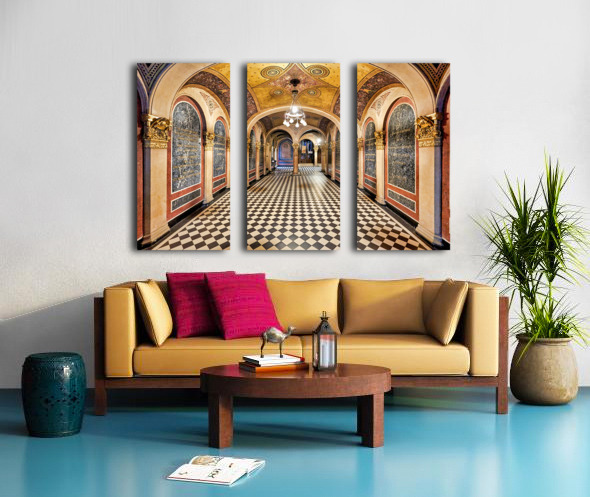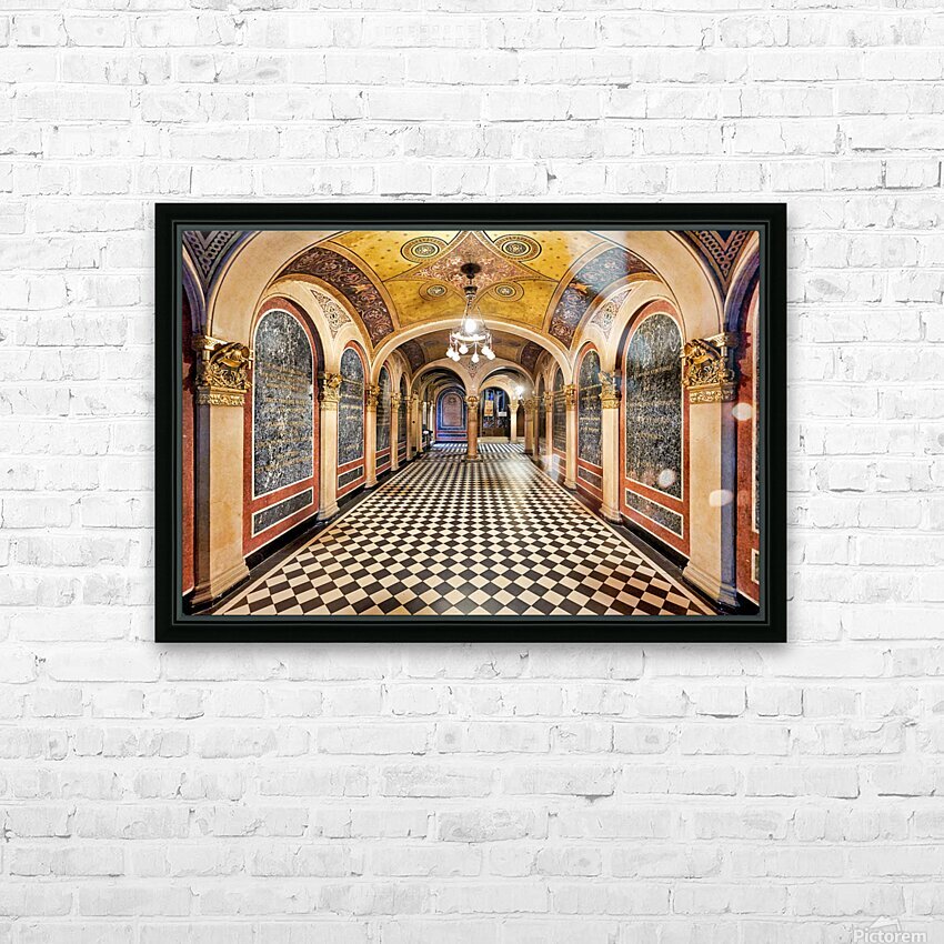 Historic church corridor with ornate arches and checkered floor. Picture Frame Printing