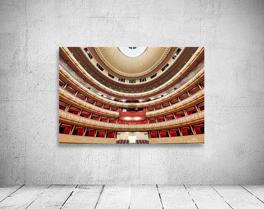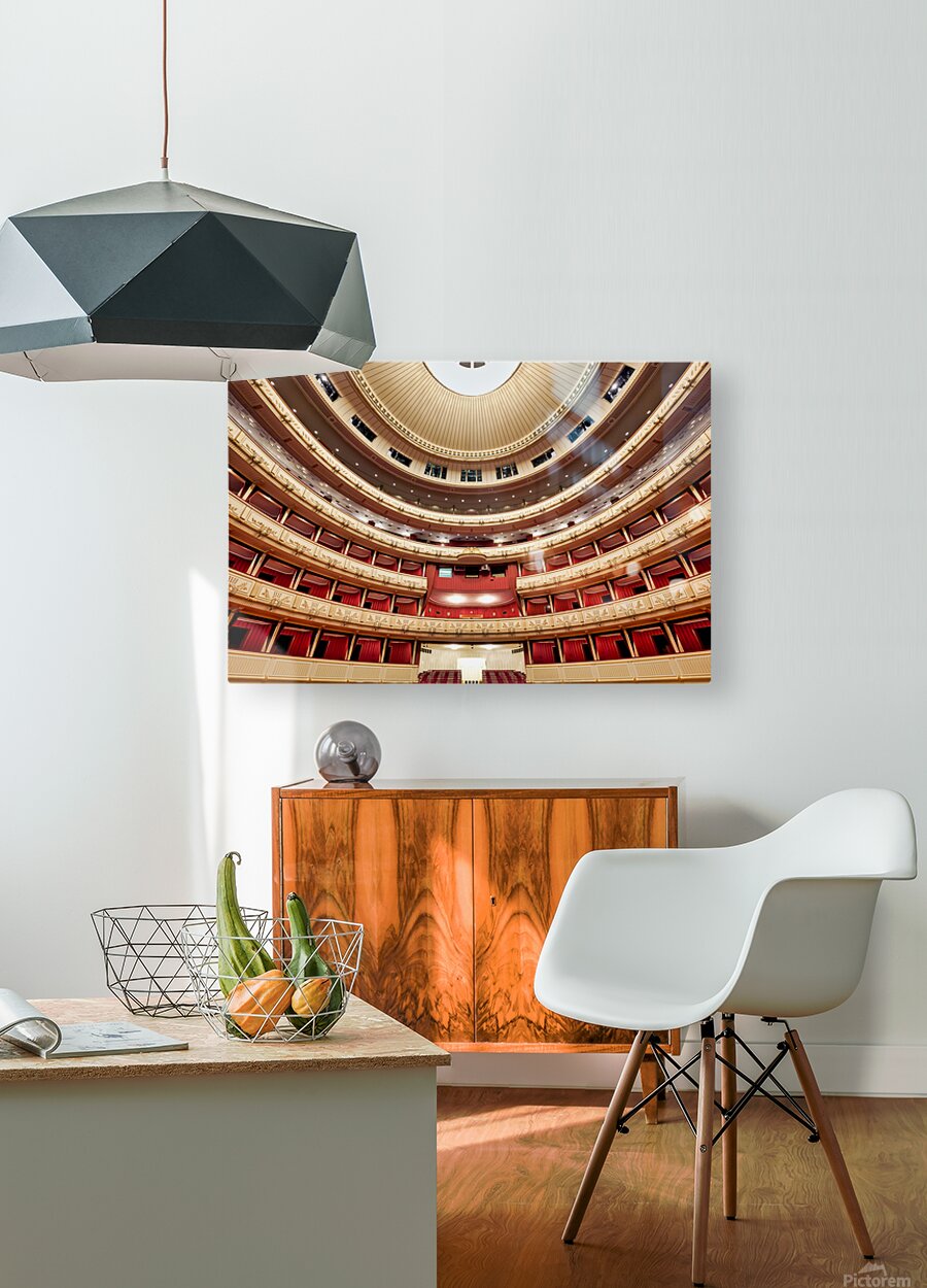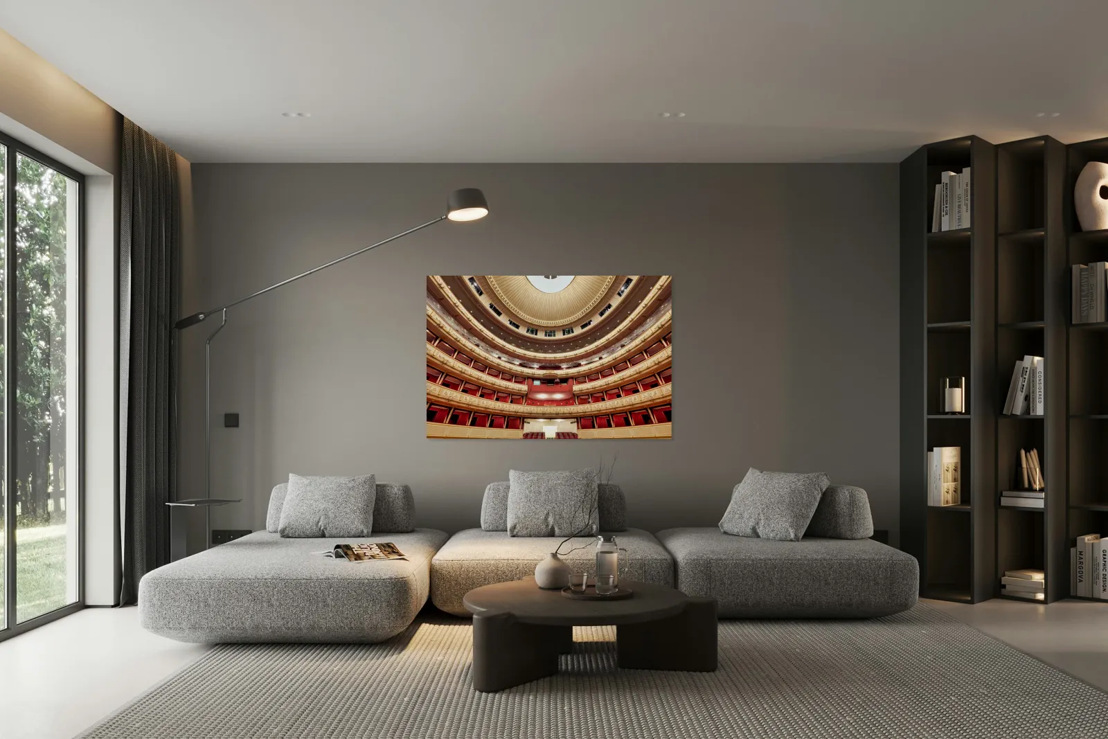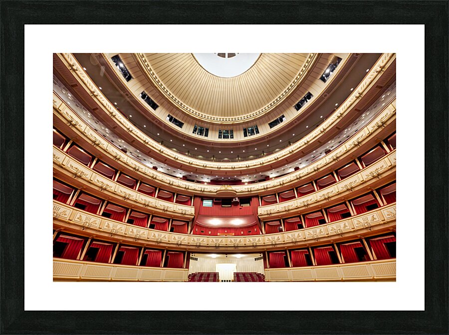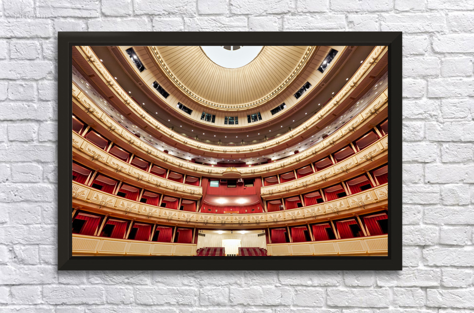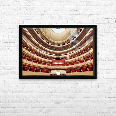"Ornate empty opera house interior with red velvet and gold deco" in a framed print.