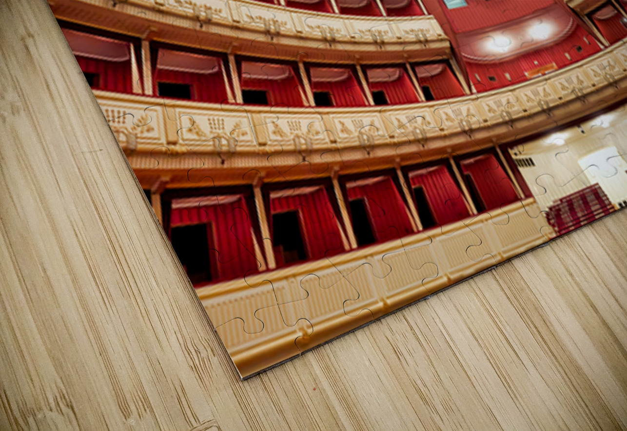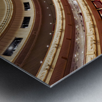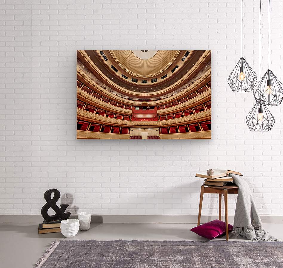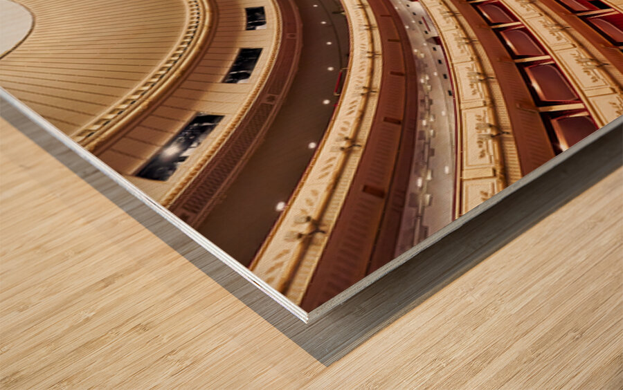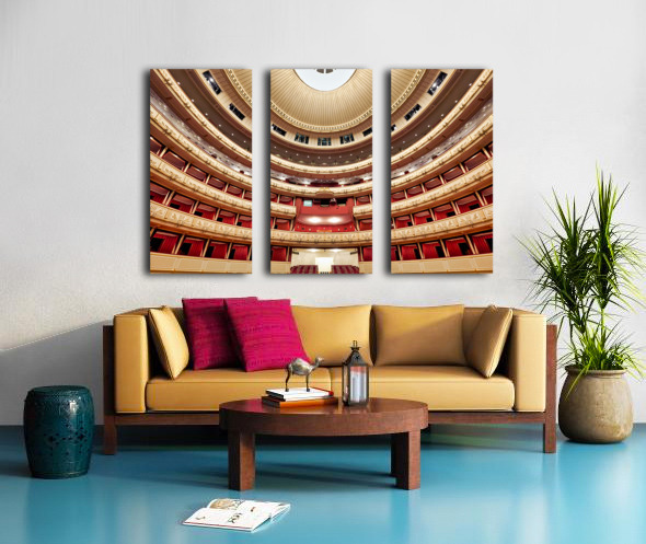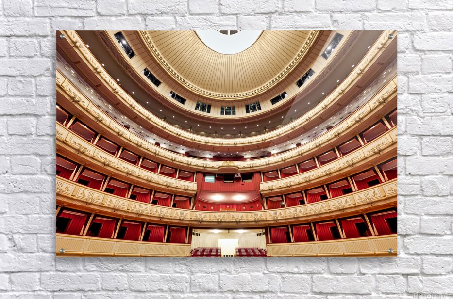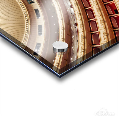 "Ornate empty opera house interior with red velvet and gold deco" in a framed print.