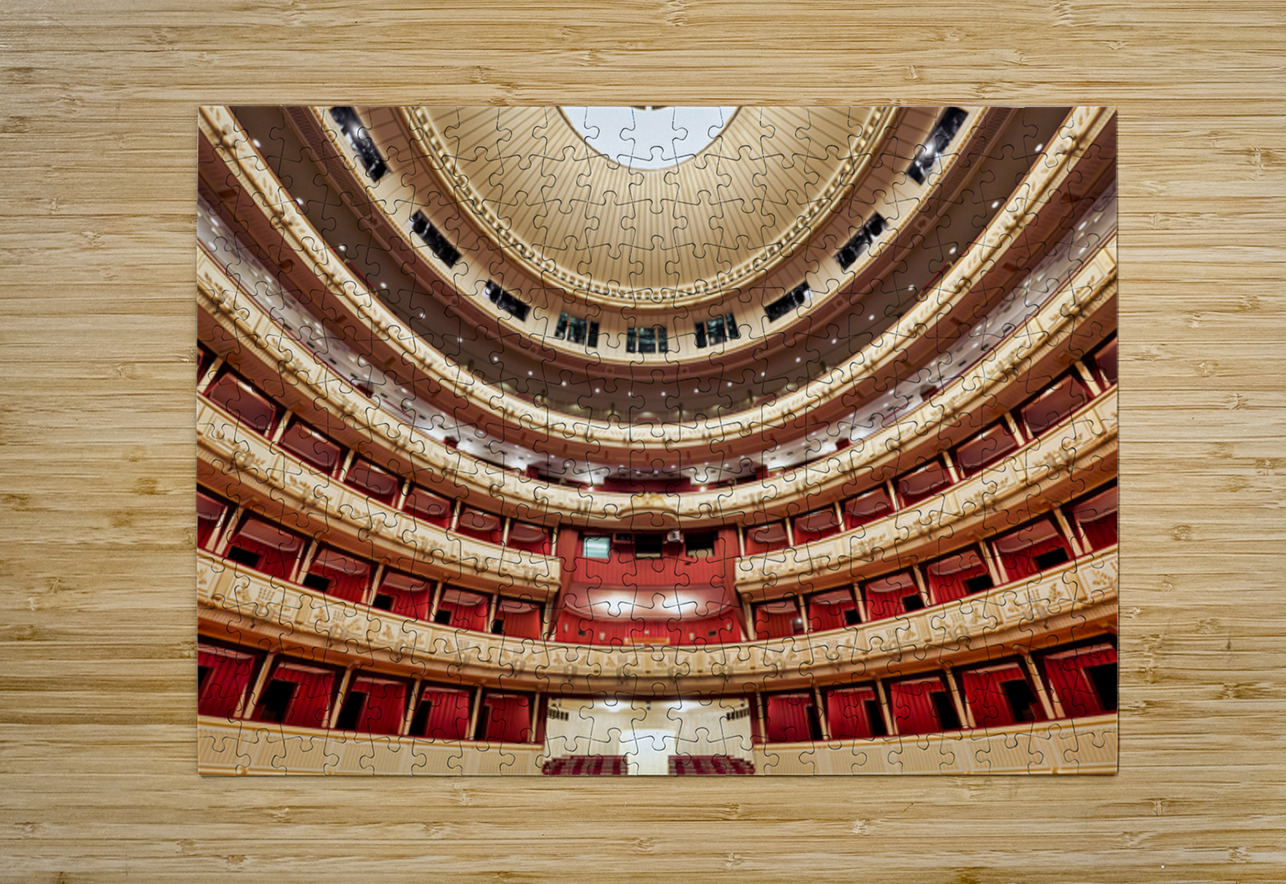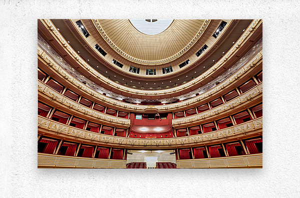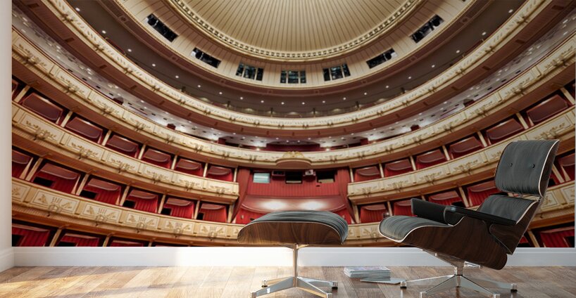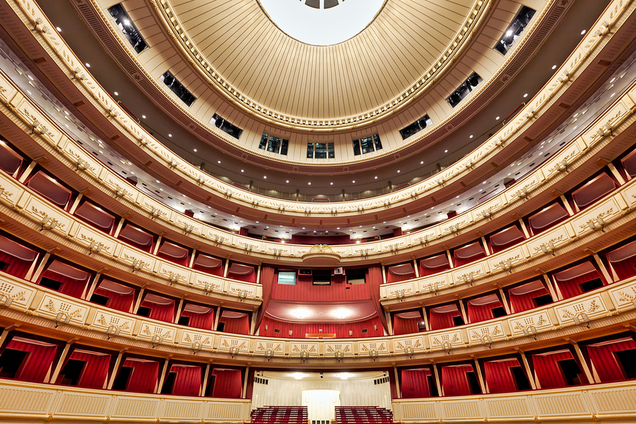 The opulent interior of the Vienna State Opera in Vienna Austria showcasing its grand architecture and empty tiers of boxes ready for a performance.