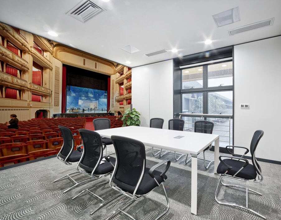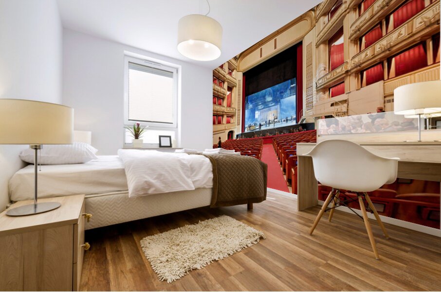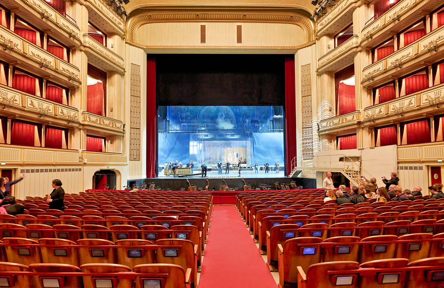 ORNATE OPERA HOUSE INTERIOR WITH STAGE CREW AND AUDIENCE.