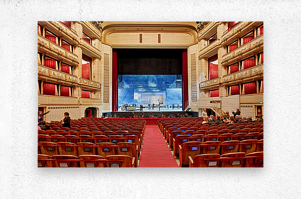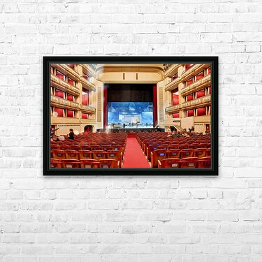 Get this artwork "Ornate opera house interior with stage crew and audience." in a framed print.