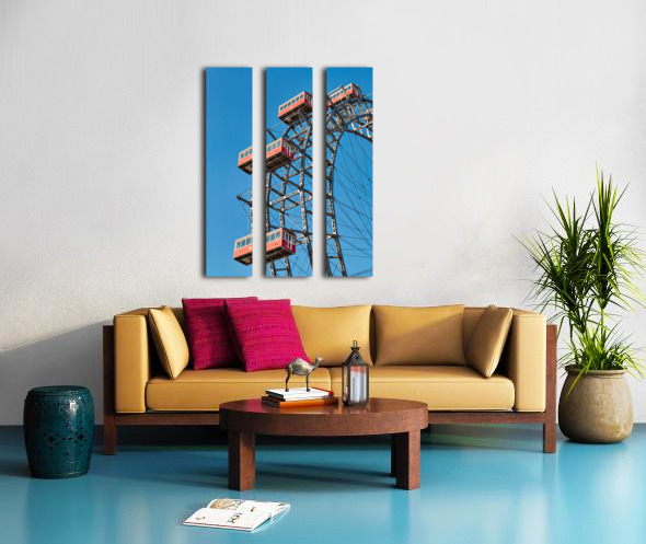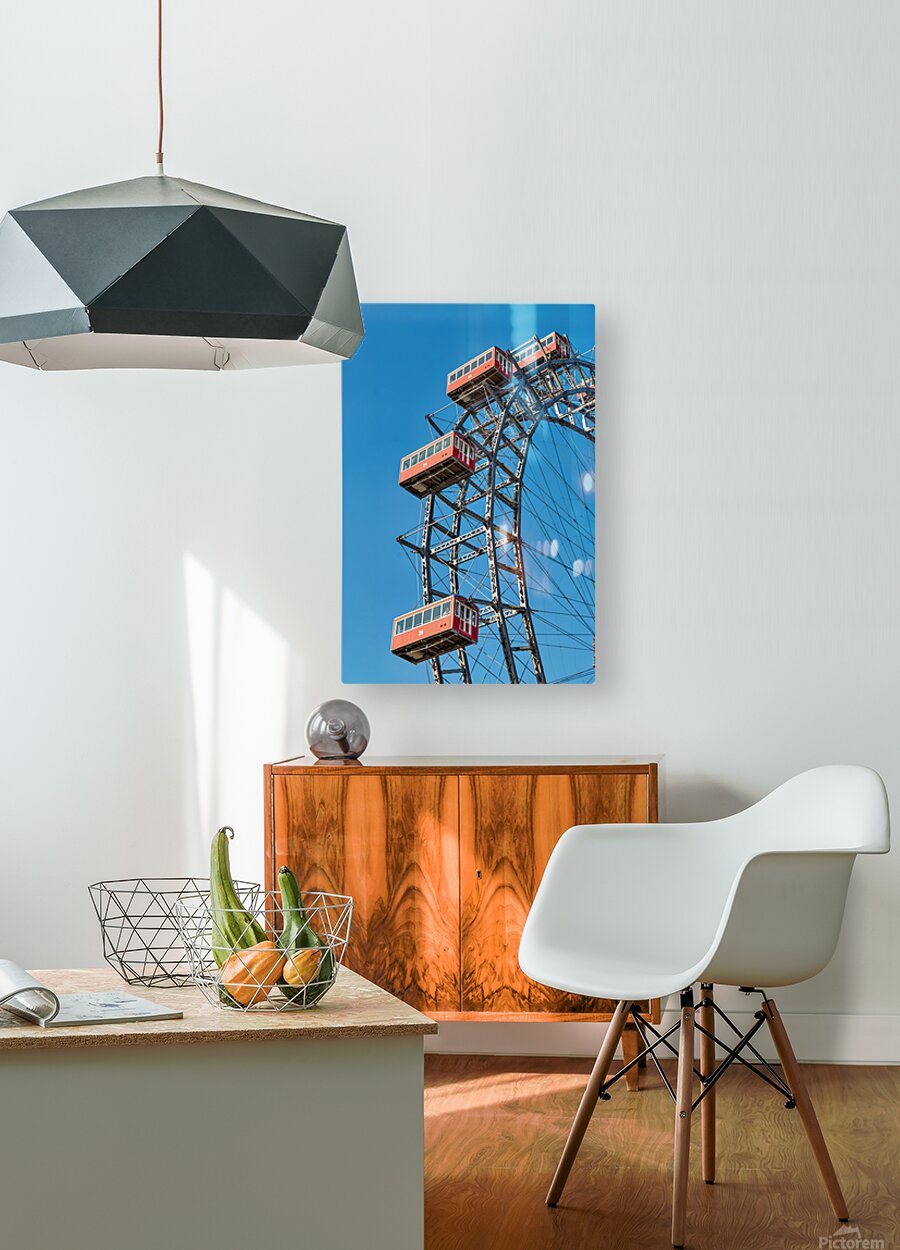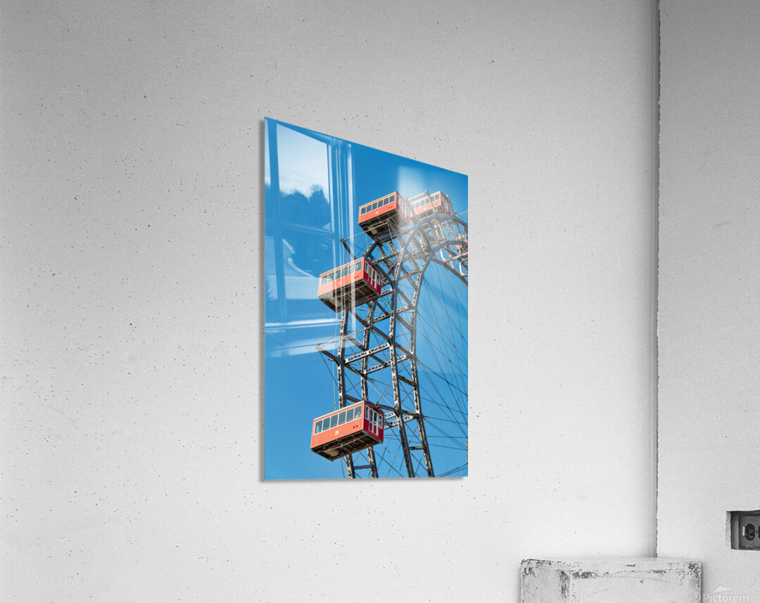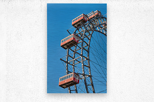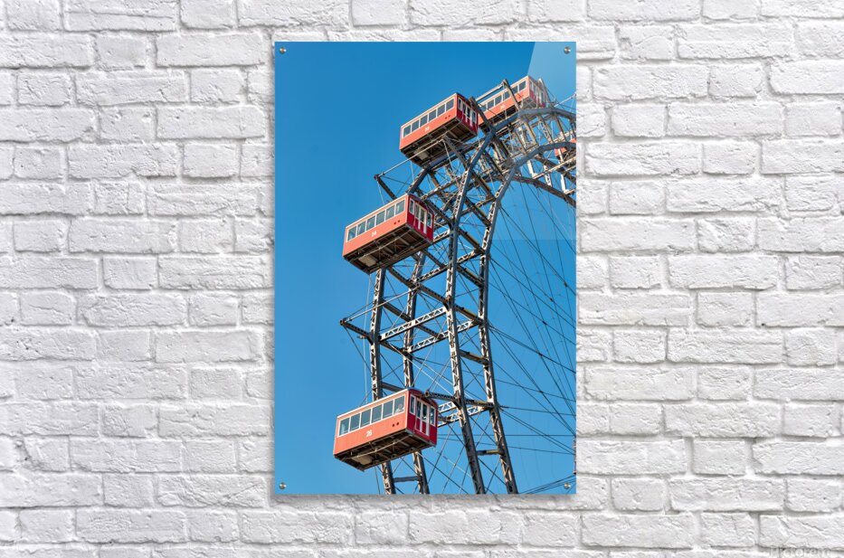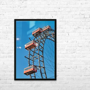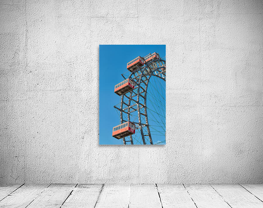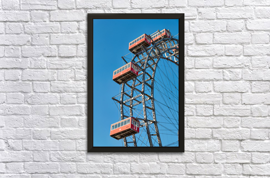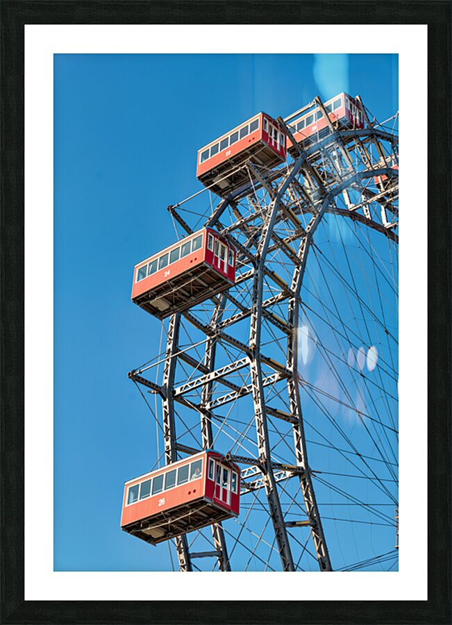 "Ferris wheels red cabins against a clear blue sky." in a framed print.