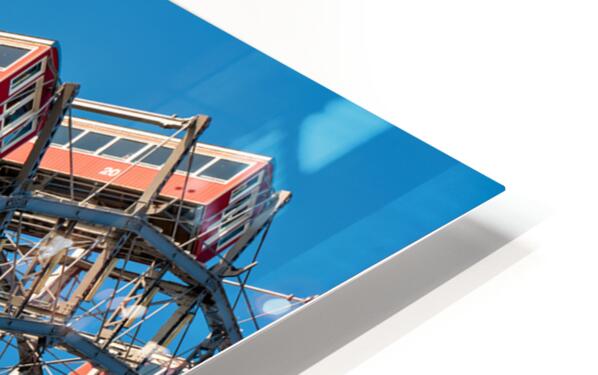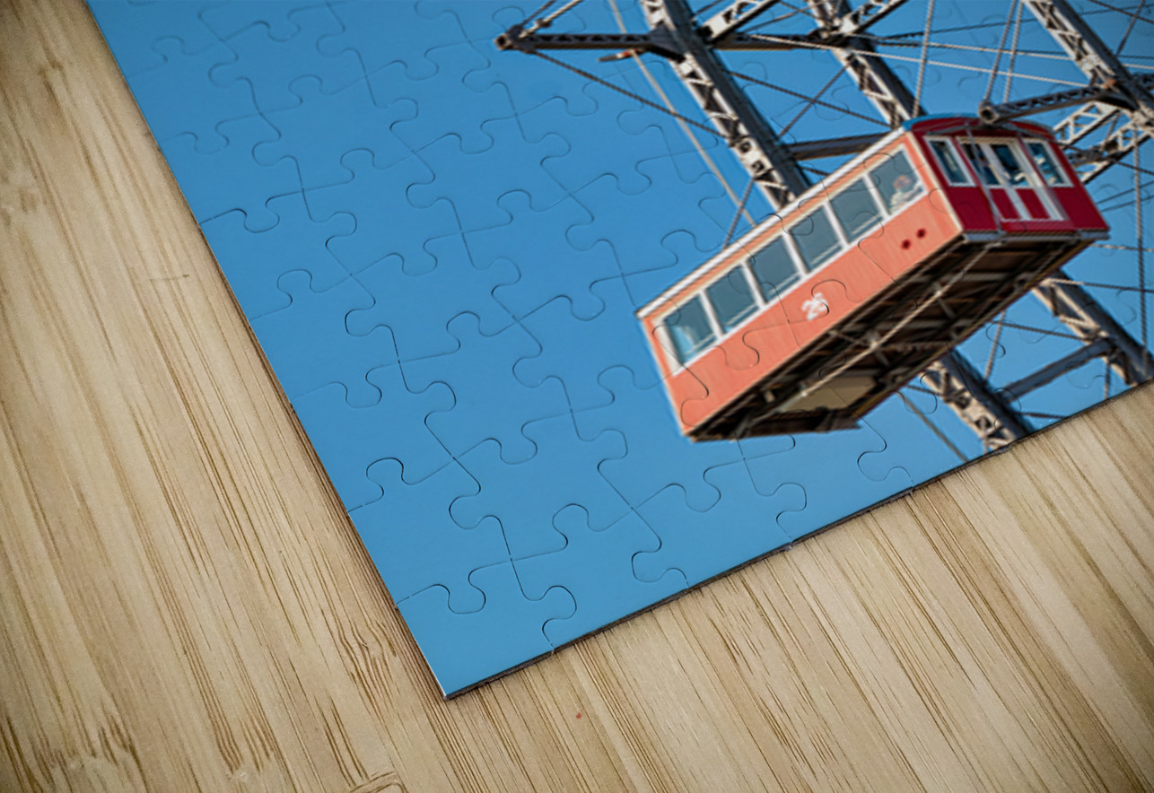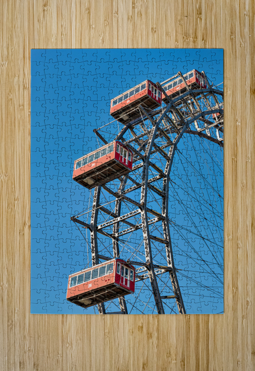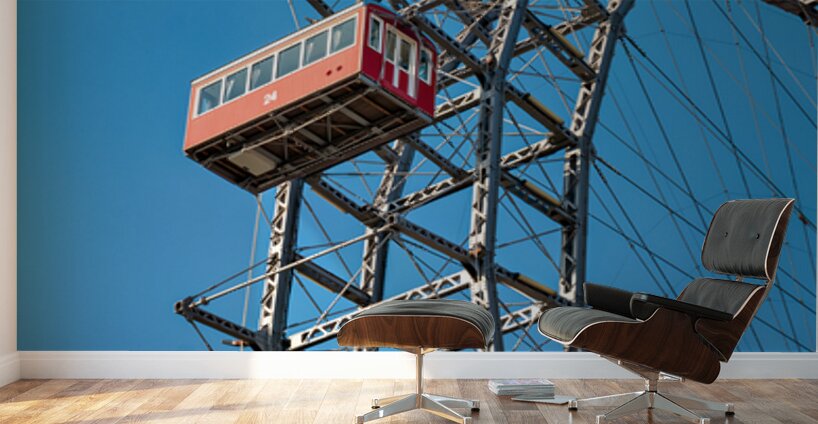 The iconic Wiener Riesenrad Ferris wheel with its red cabins against a clear blue sky offering panoramic views of Vienna Austria.