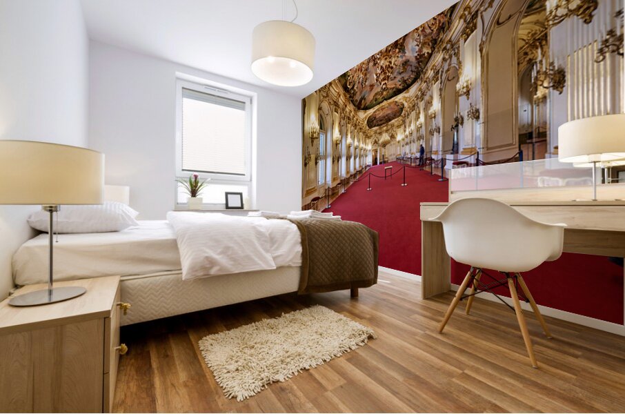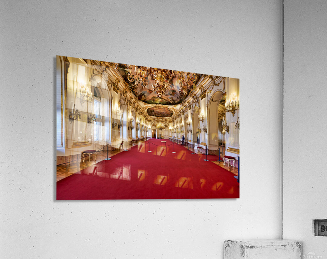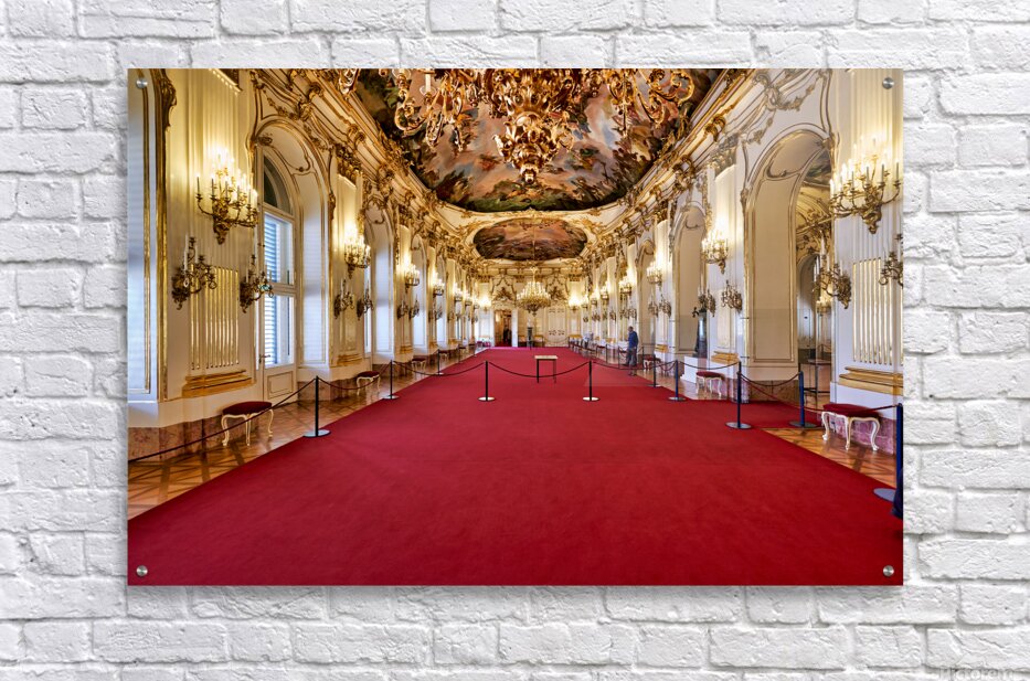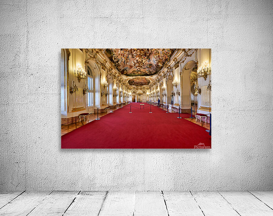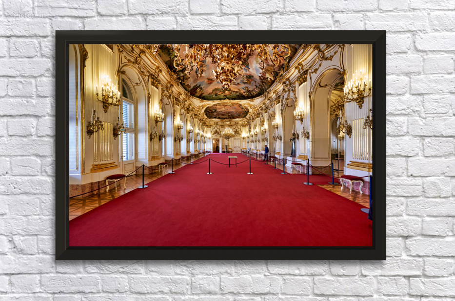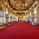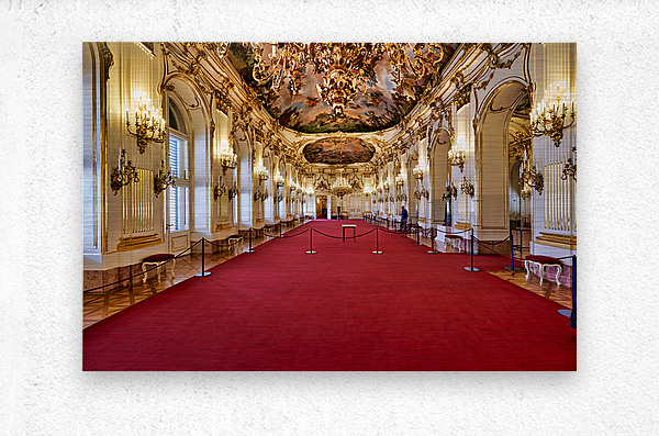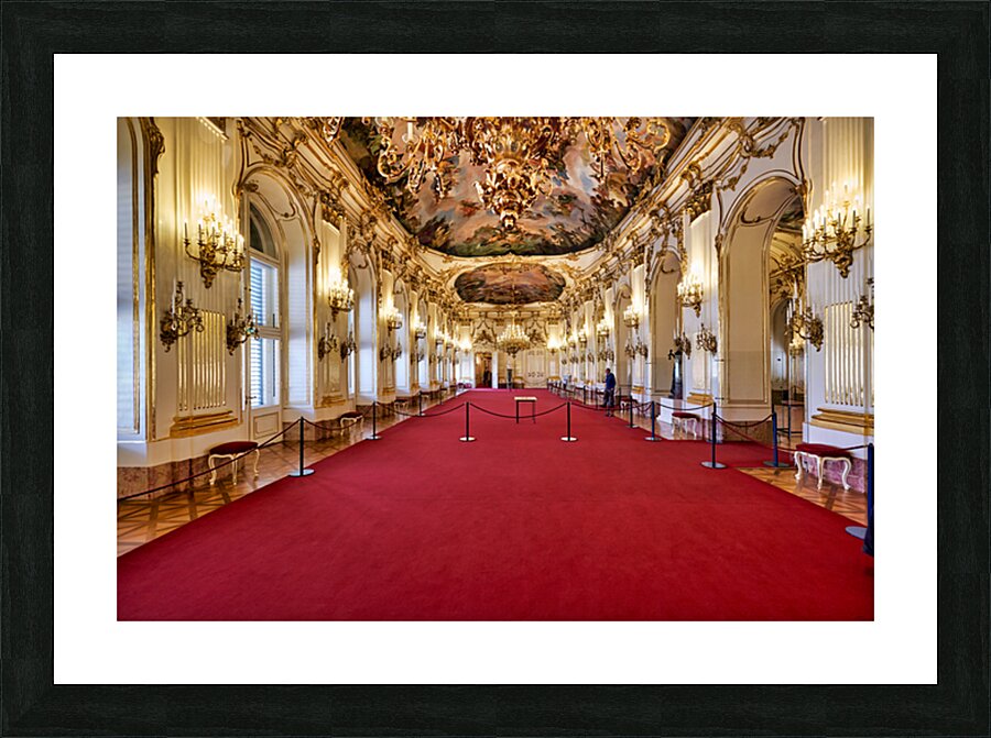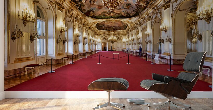 A visitor walks through the opulent Great Gallery of Schönbrunn Palace in Vienna Austria admiring the Baroque architecture and frescoes.
