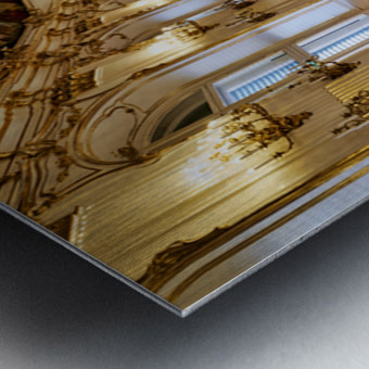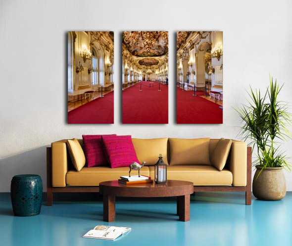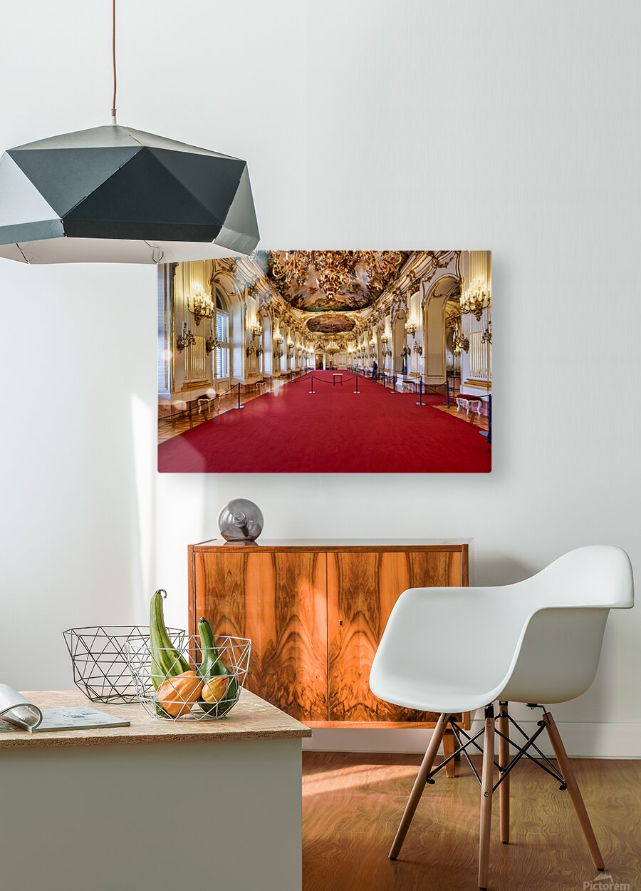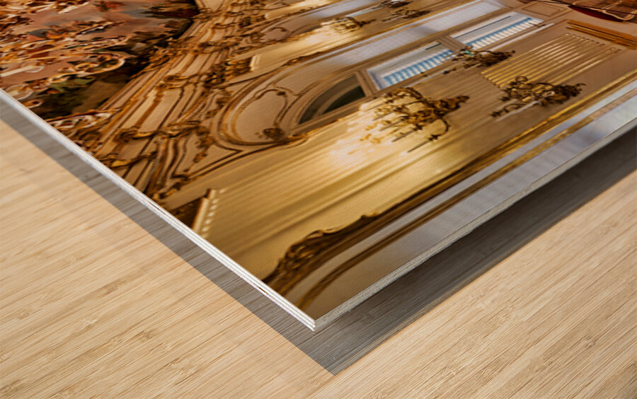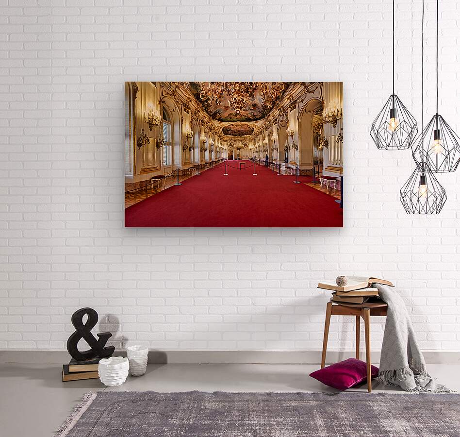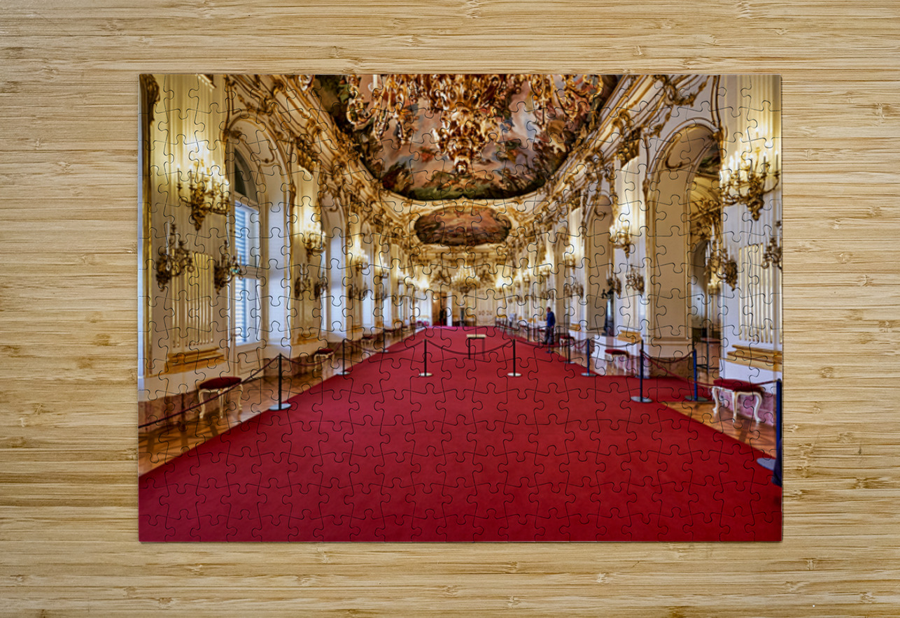 A visitor walks through the opulent Great Gallery of Schönbrunn Palace in Vienna Austria admiring the Baroque architecture and frescoes.