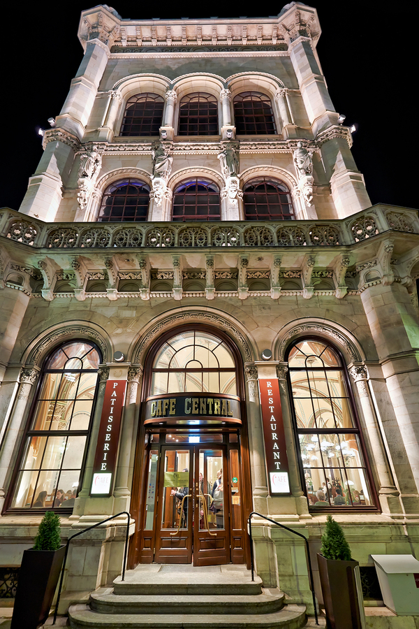 The iconic Cafe Central in Vienna Austria illuminated at night. Patrons enjoy the historic ambiance of this famous coffeehouse and restaurant.