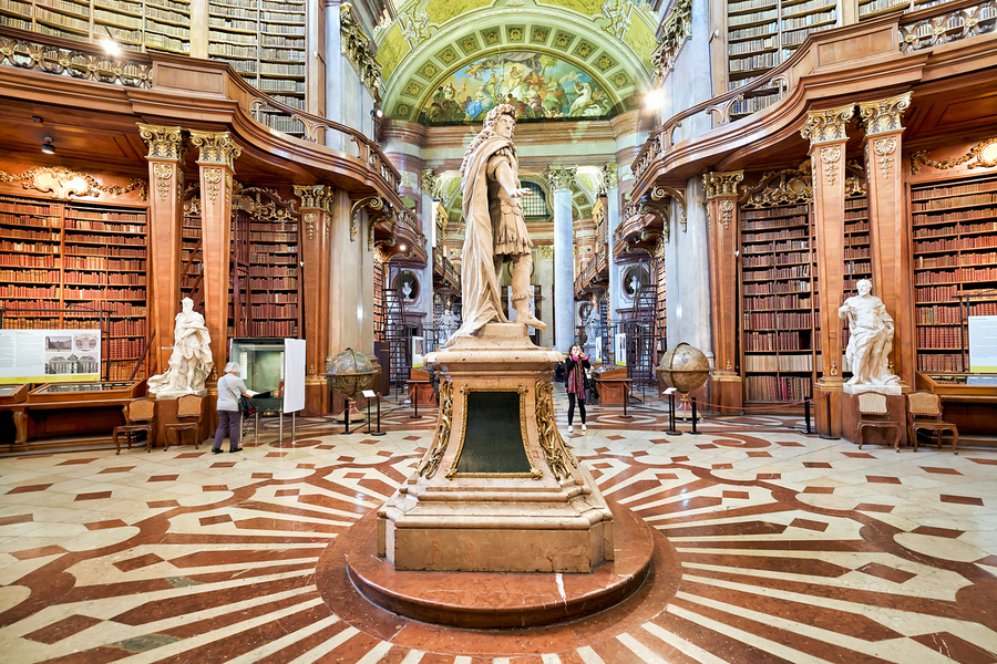 Visitors explore the magnificent State Hall of the Austrian National Library in Vienna admiring its Baroque architecture vast book collection and stat