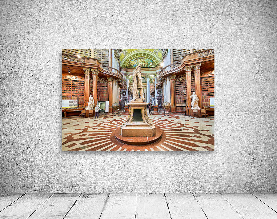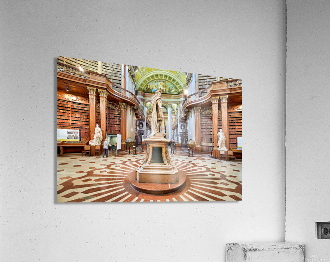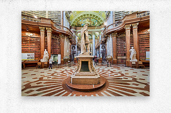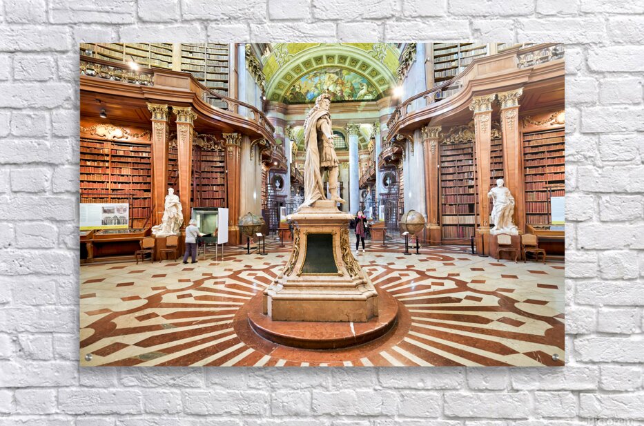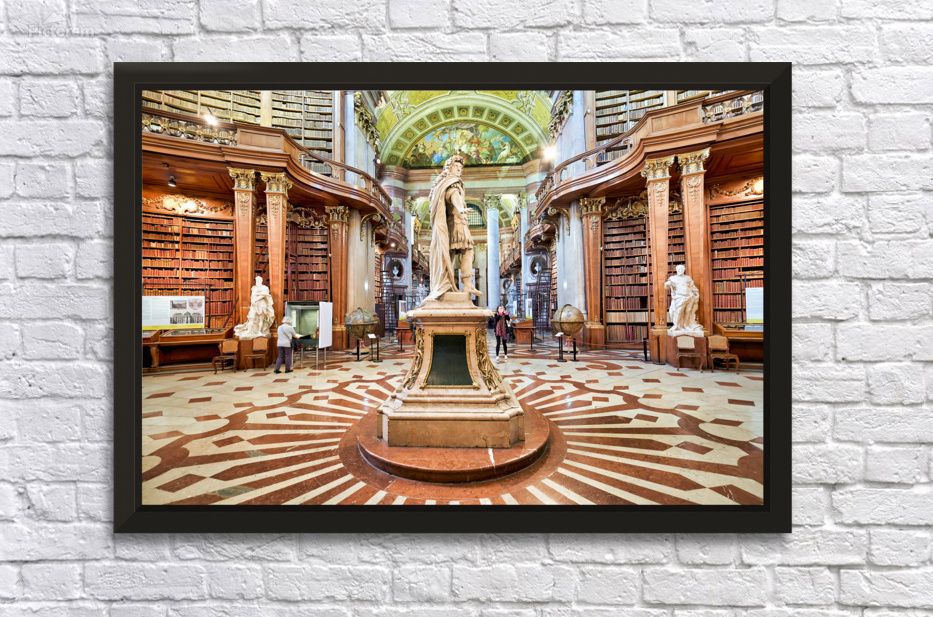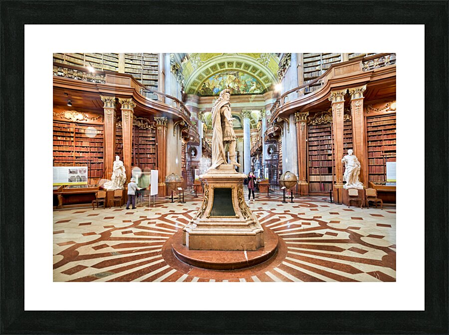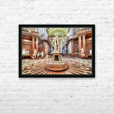 "Magnificent baroque library interior with statues books and vi" in a framed print.
