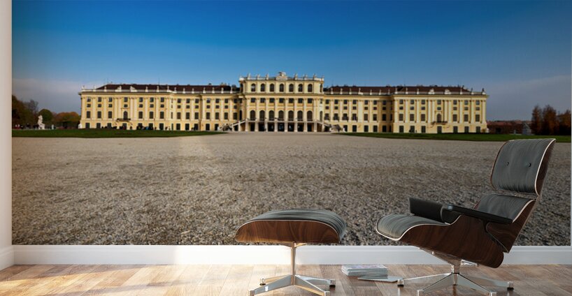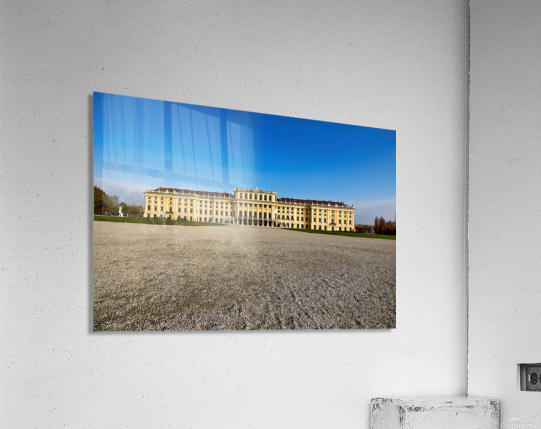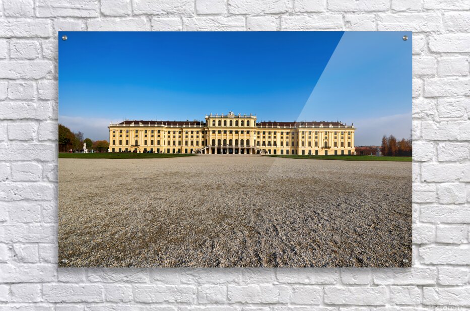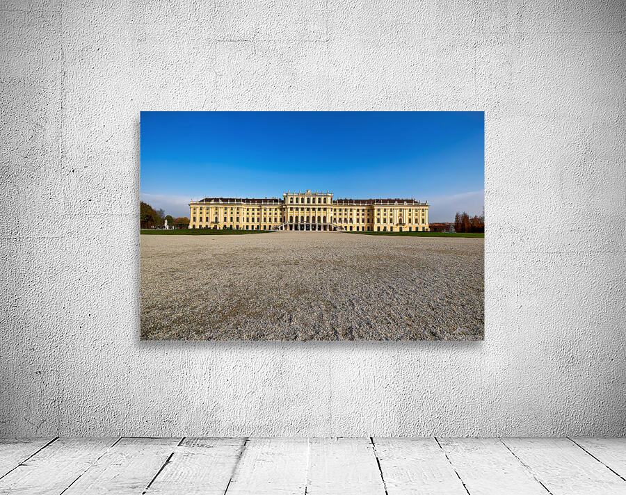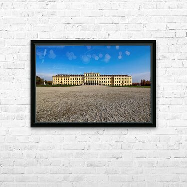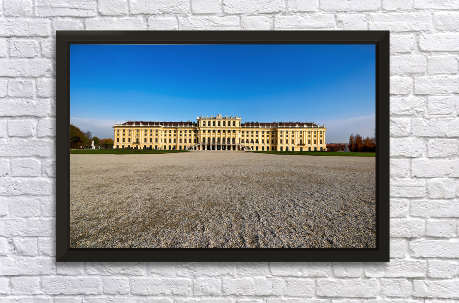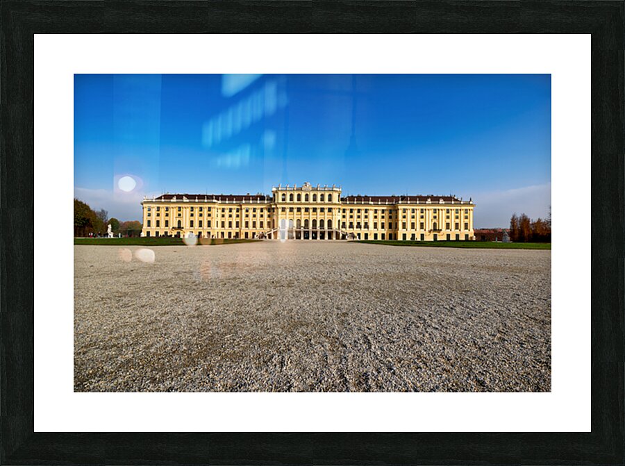 "Schönbrunn Palace Vienna Austria under a clear blue sky." in a framed print.