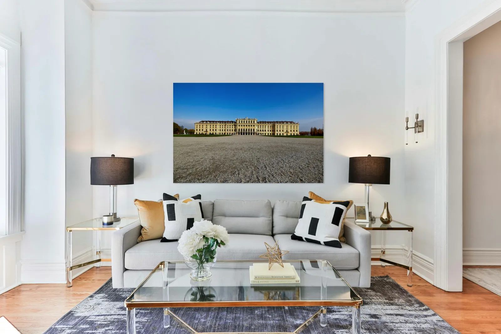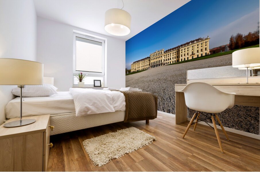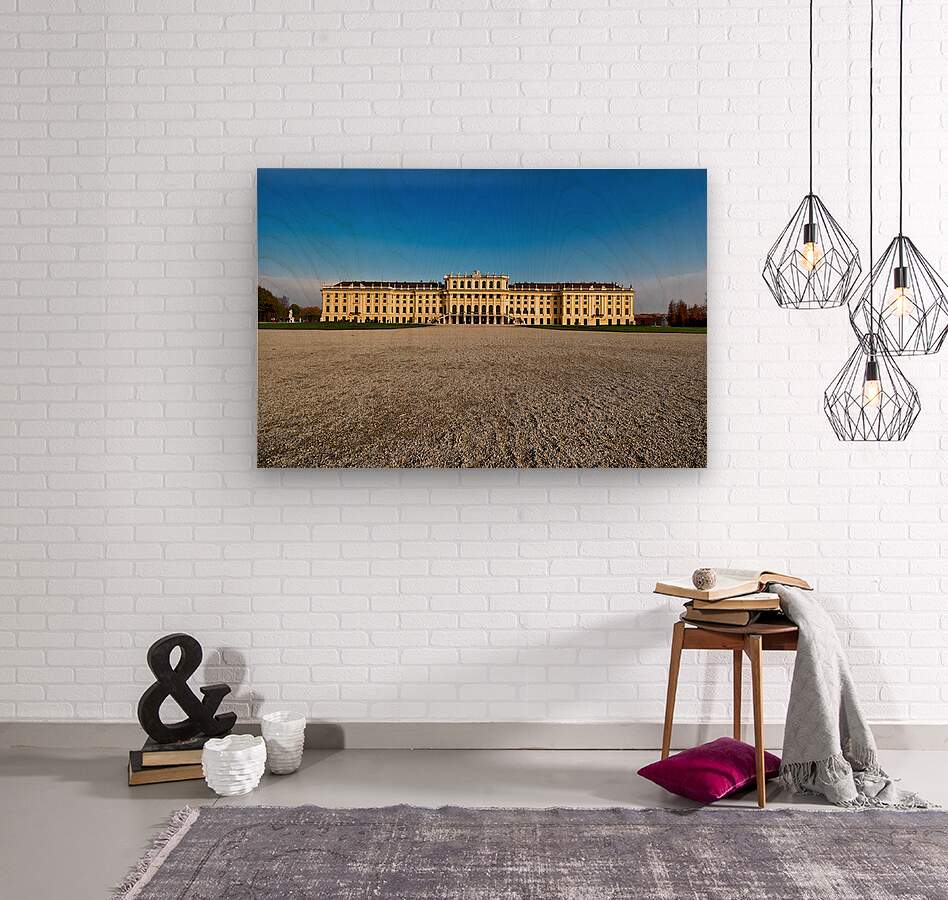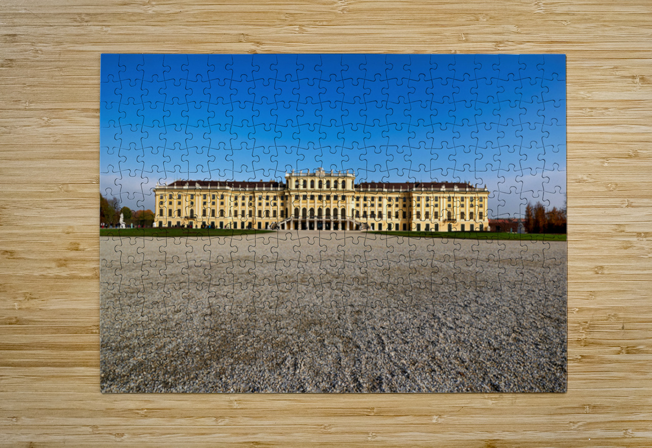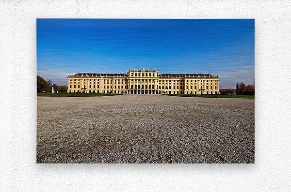 "Schönbrunn Palace Vienna Austria under a clear blue sky." in a framed print.