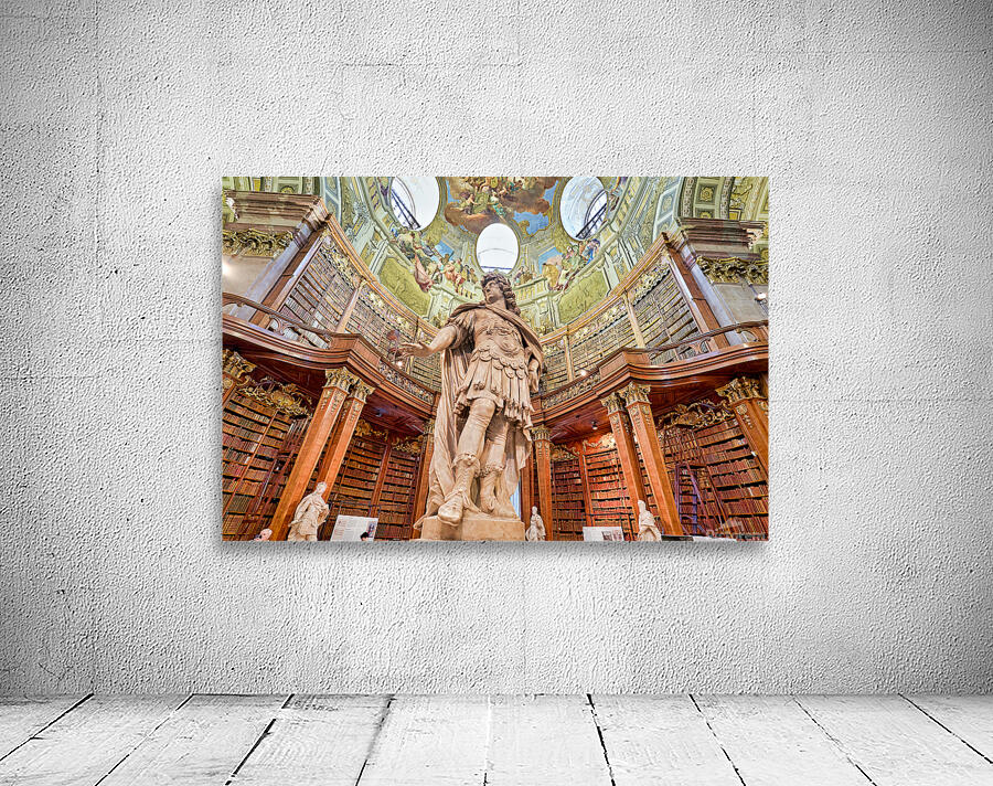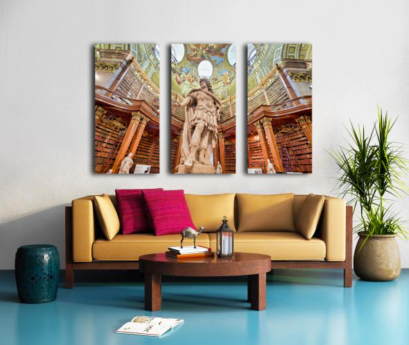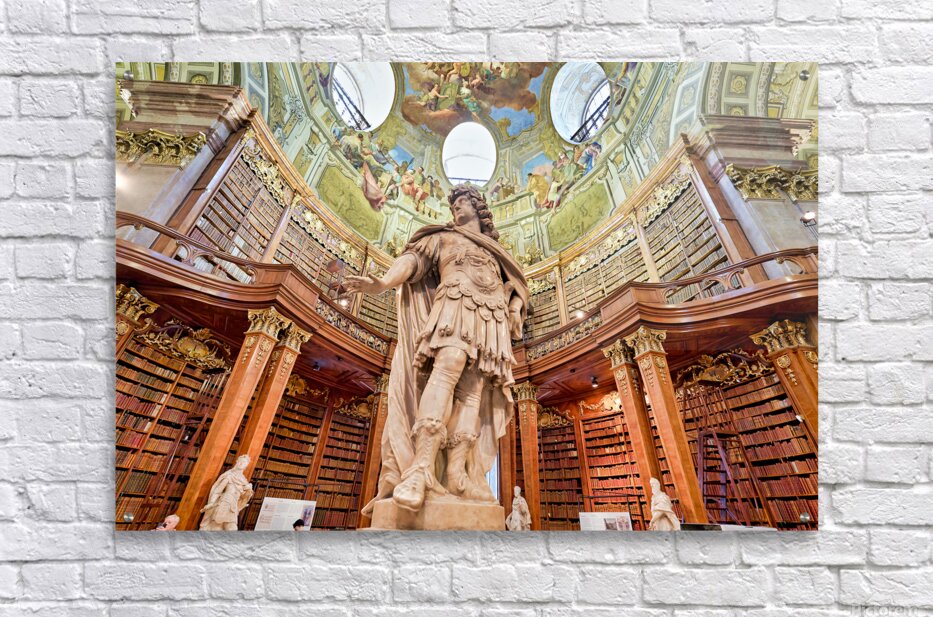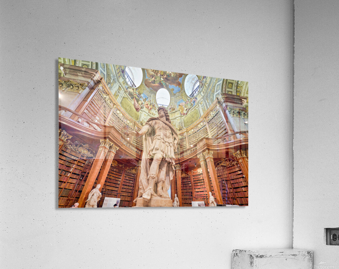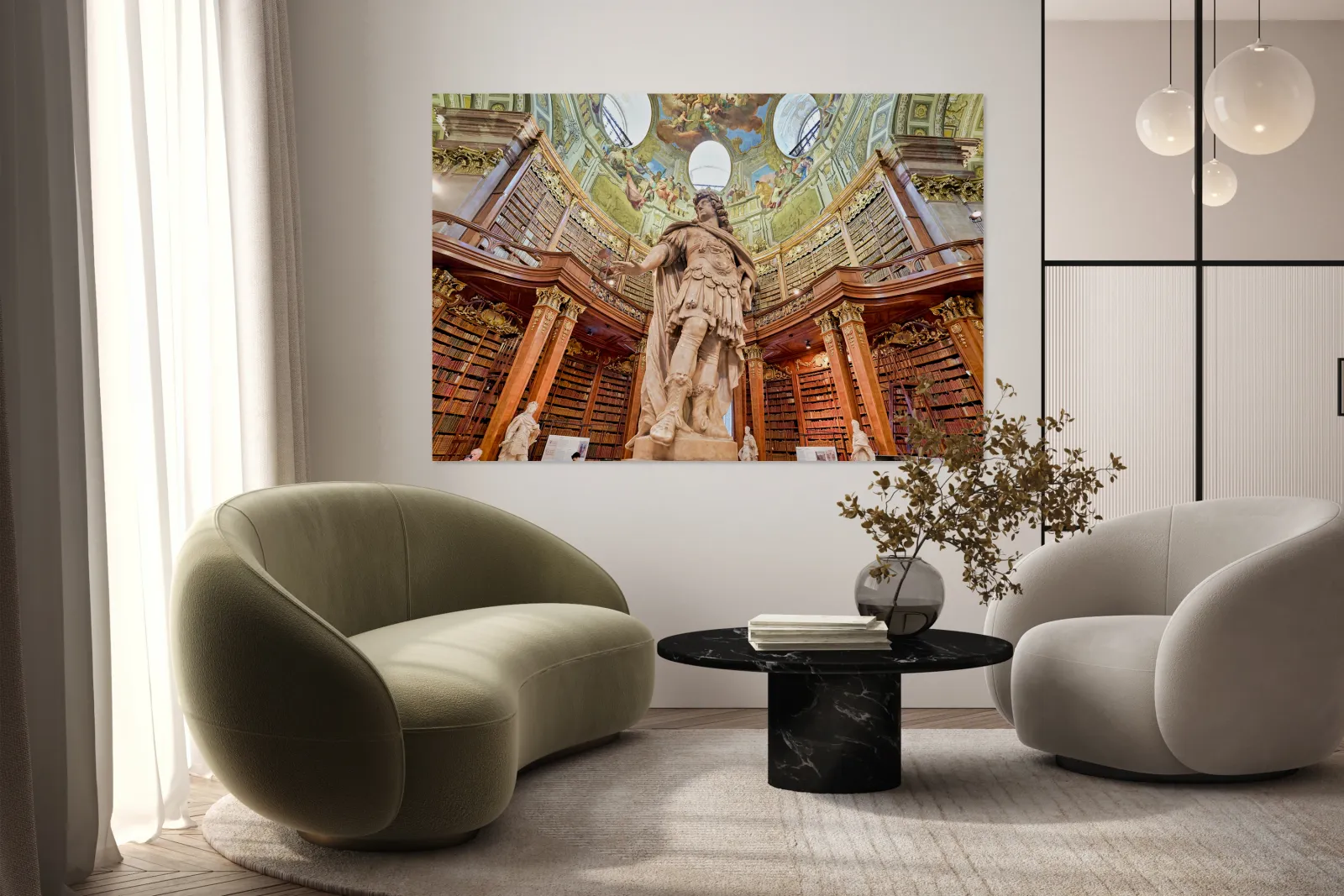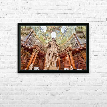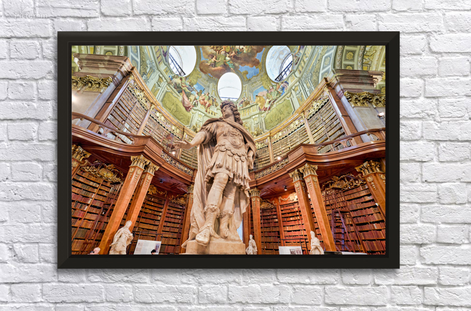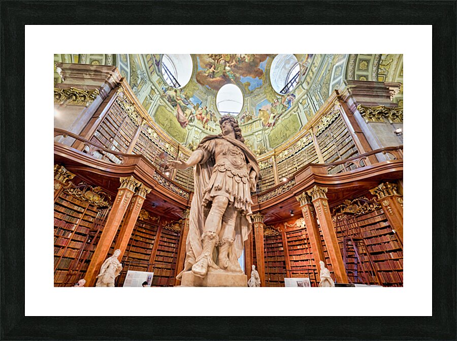 "Grand baroque library with statue and painted ceiling." in a framed print.