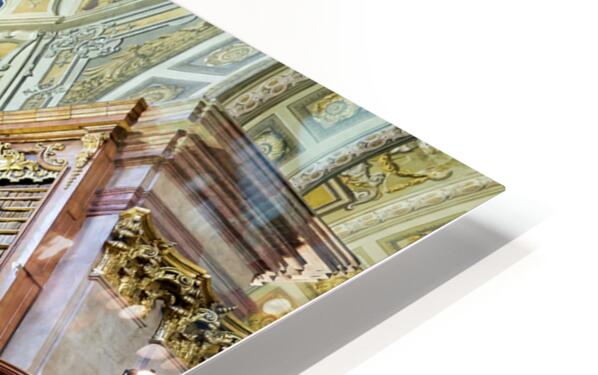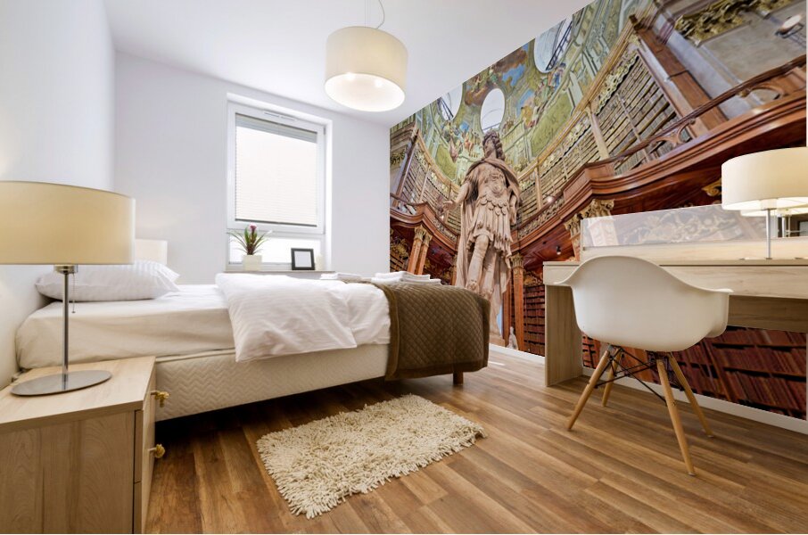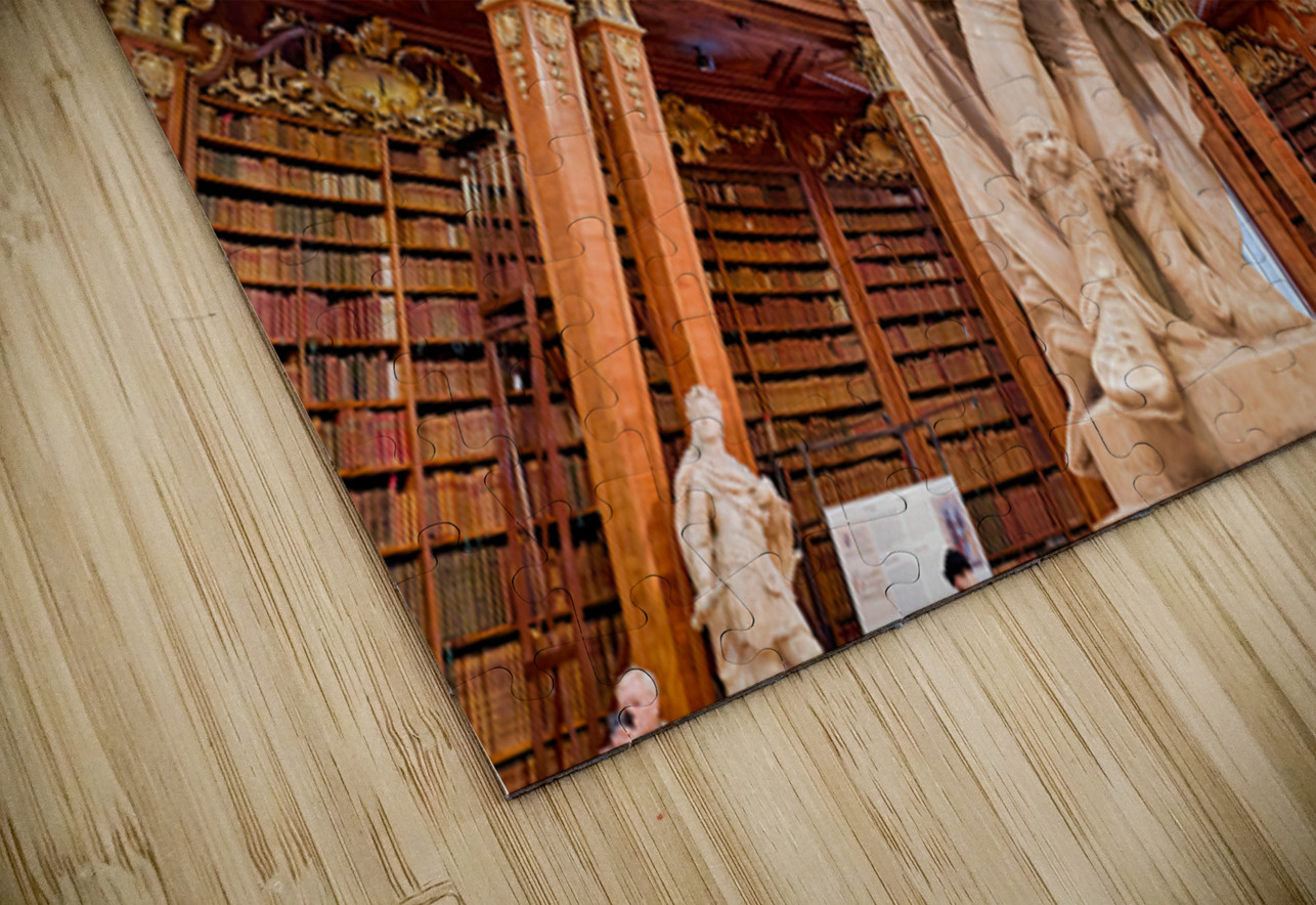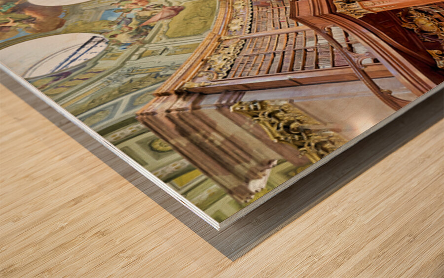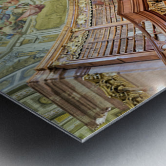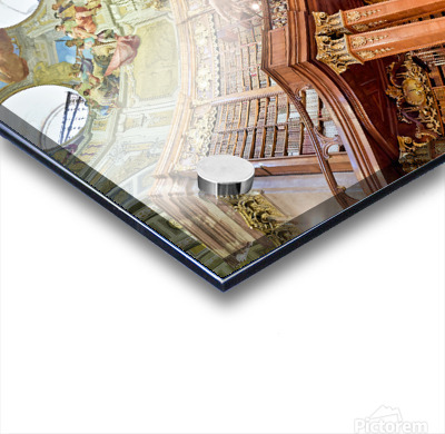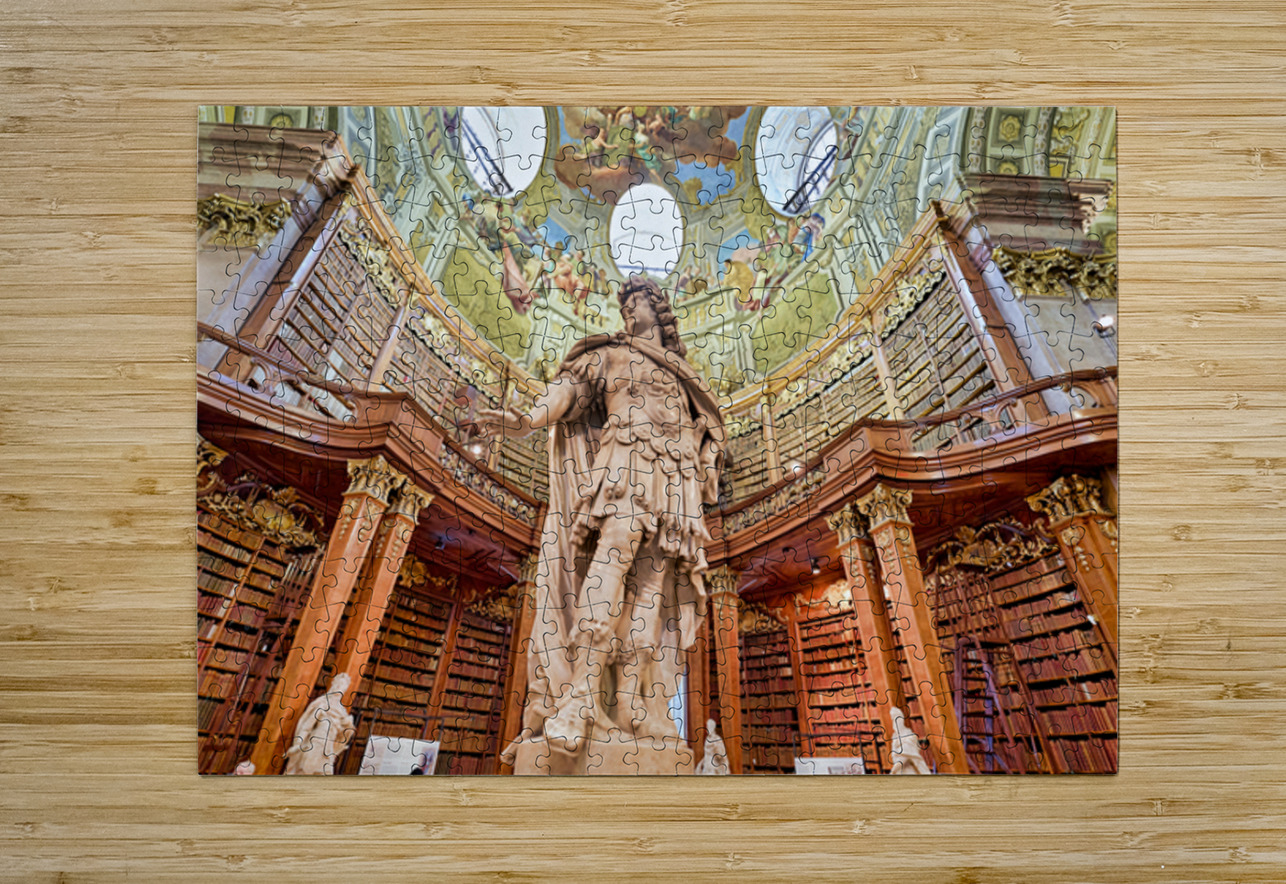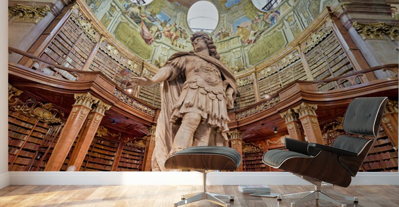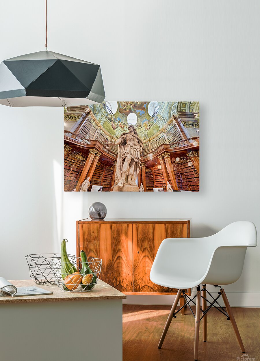 "Grand baroque library with statue and painted ceiling." in a framed print.