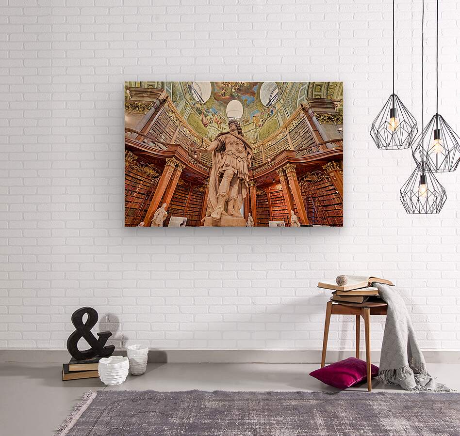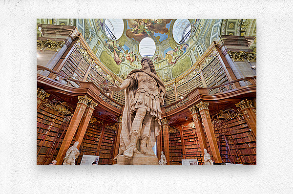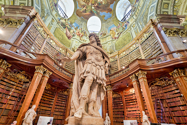 Emperor Charles VIs statue dominates the opulent State Hall of the Austrian National Library in Vienna Austria a Baroque masterpiece housing vast coll