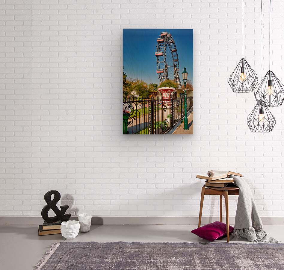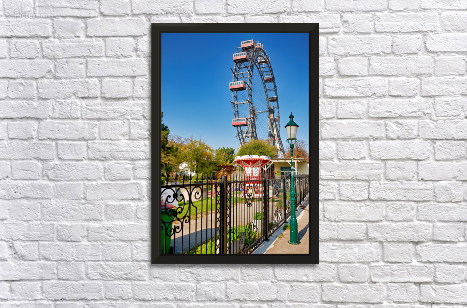 "Prater Ferris wheel and carousel under a clear blue sky." in a framed print.