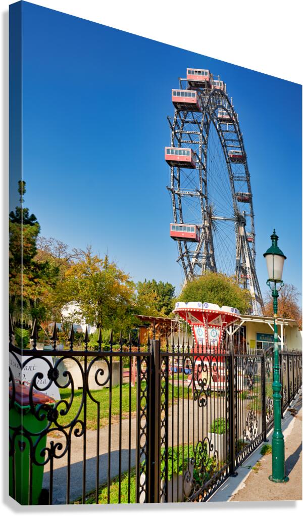 Get this artwork "Prater Ferris wheel and carousel under a clear blue sky." in a framed print.