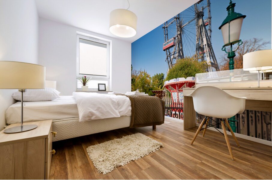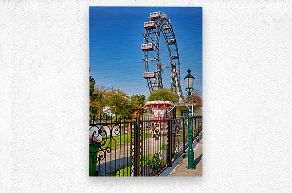 ABOUT THIS ARTWORK: PRATER FERRIS WHEEL AND CAROUSEL UNDER A CLEAR BLUE SKY.