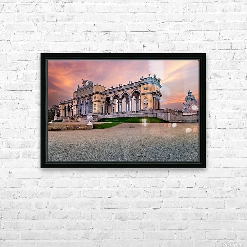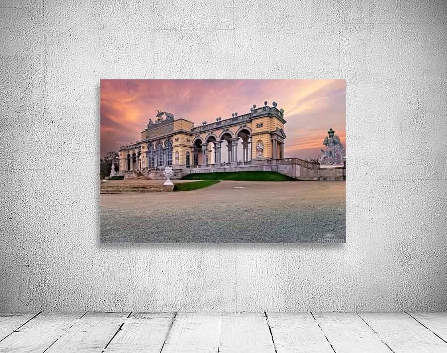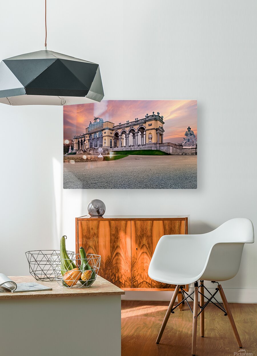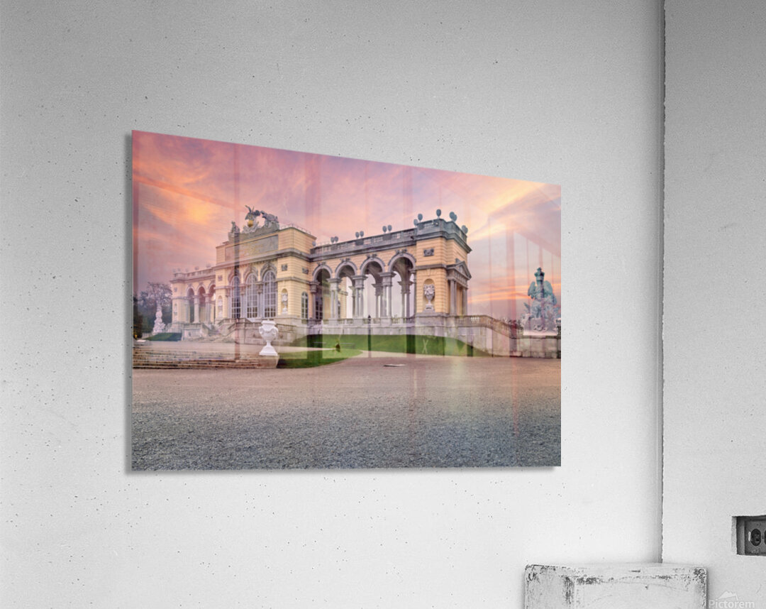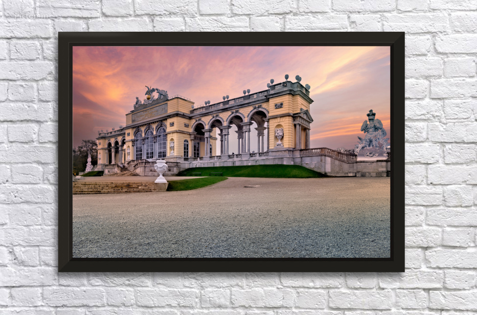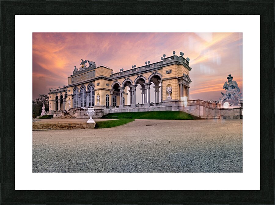 "Ornate Gloriette palace in Vienna at sunset." in a framed print.