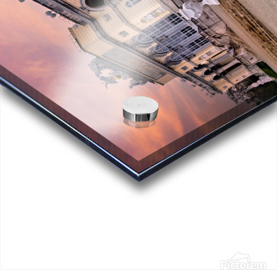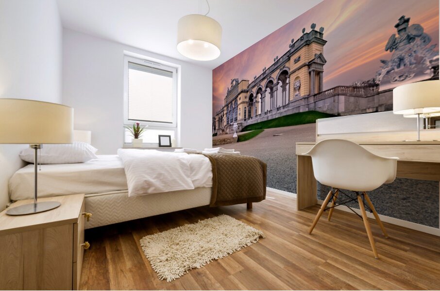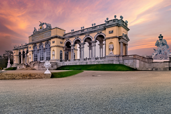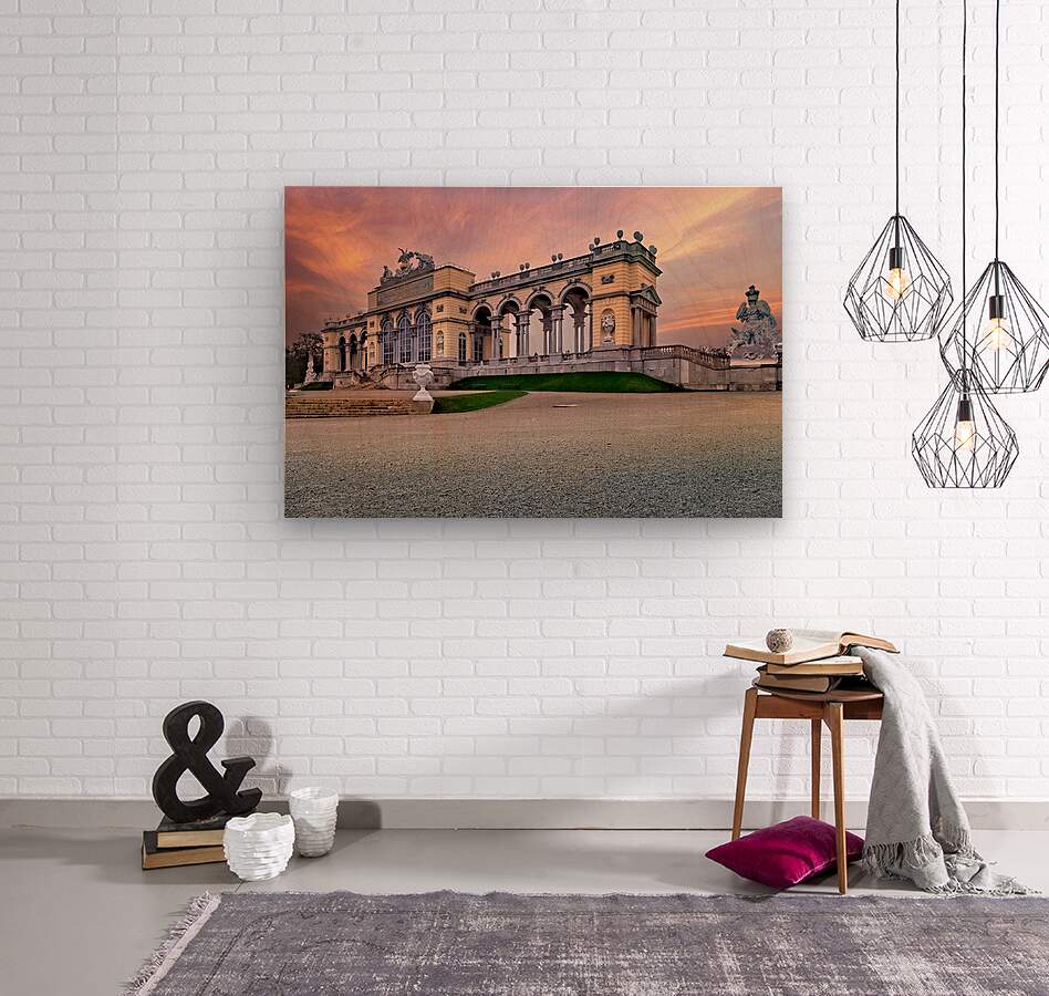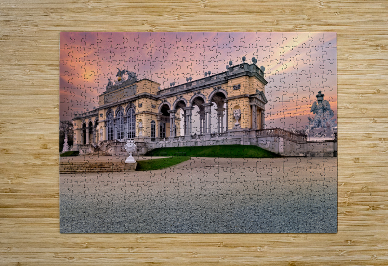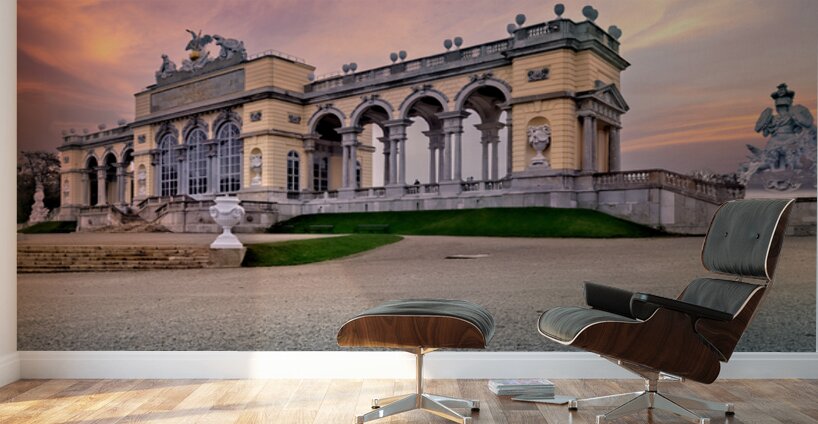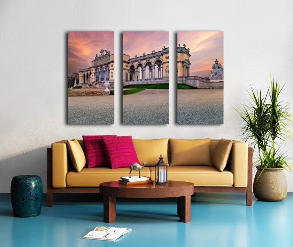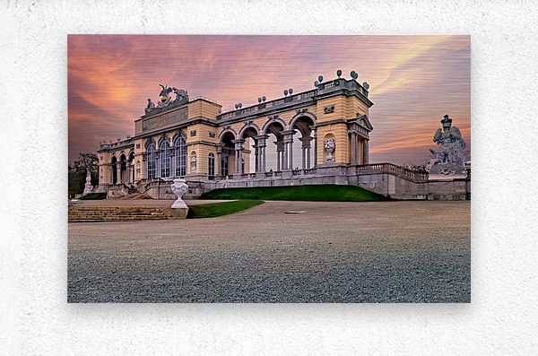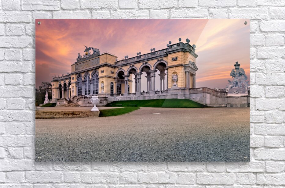 "Ornate Gloriette palace in Vienna at sunset." in a framed print.