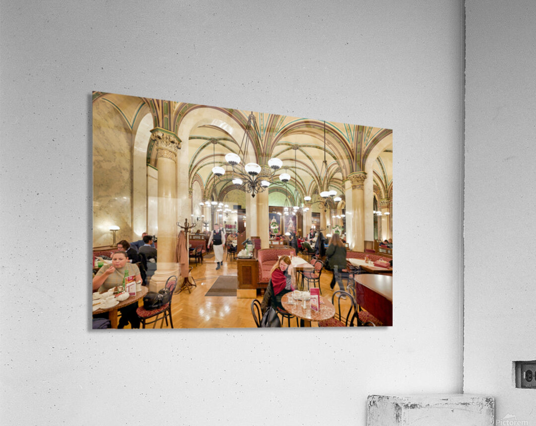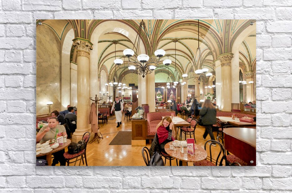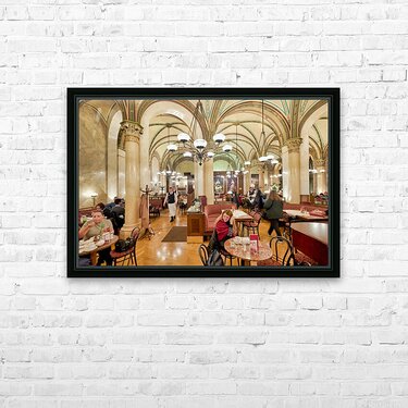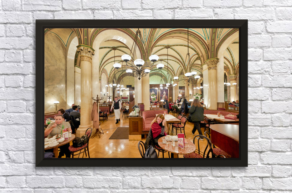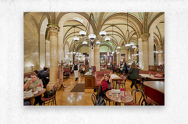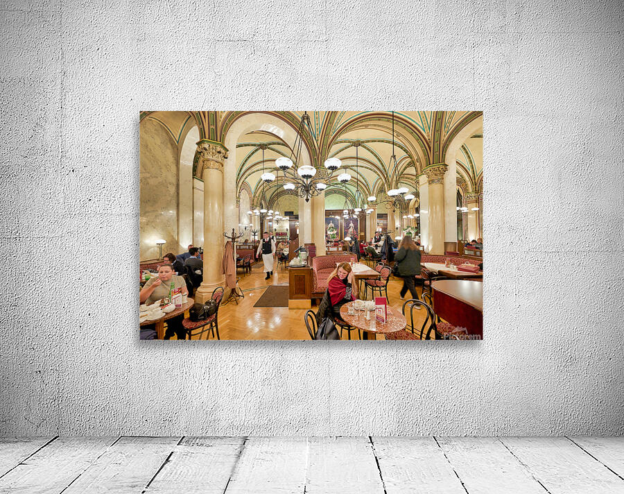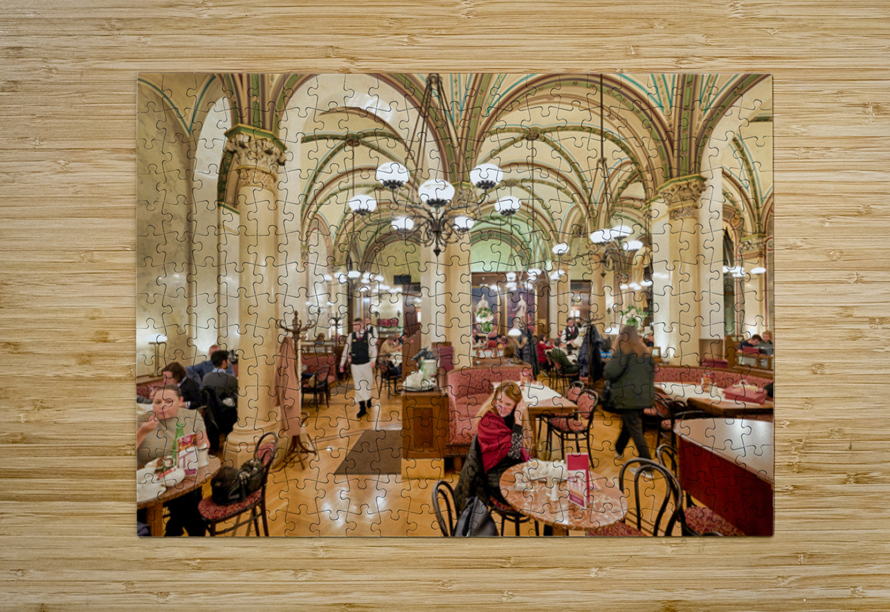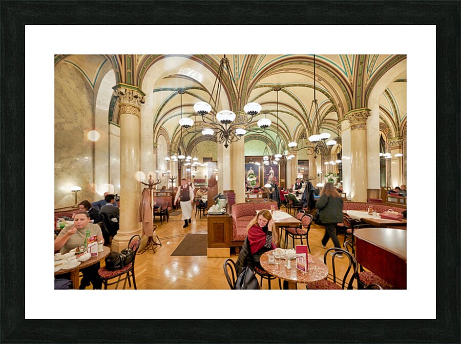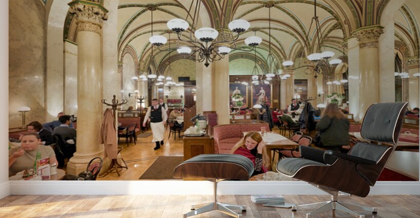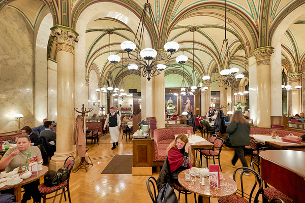 Patrons and waiters in a grand historic cafe likely Cafe Central in Vienna Austria enjoying the ornate architecture and traditional atmosphere.