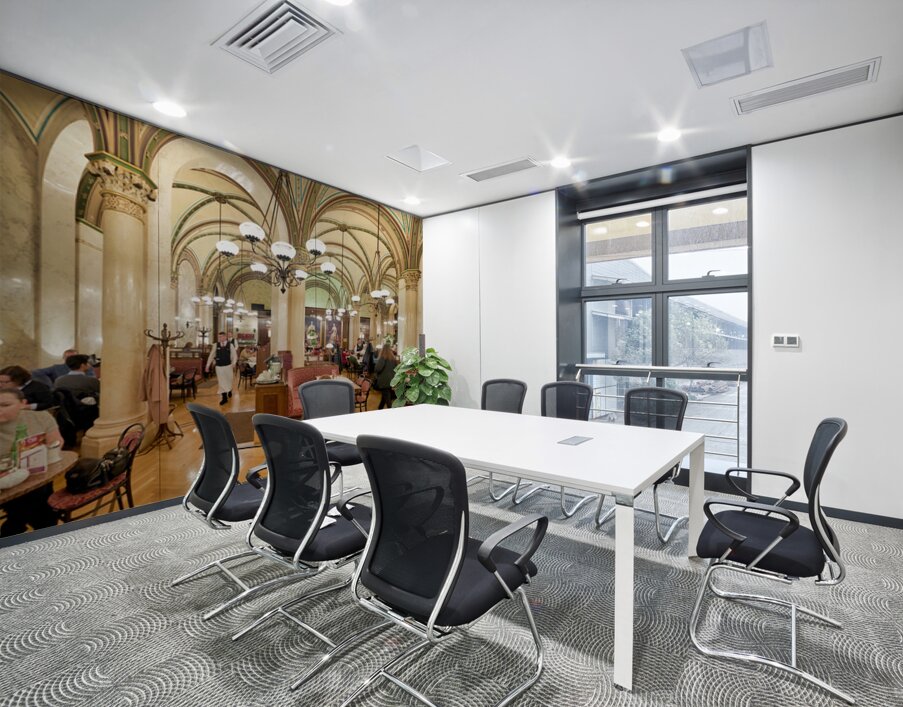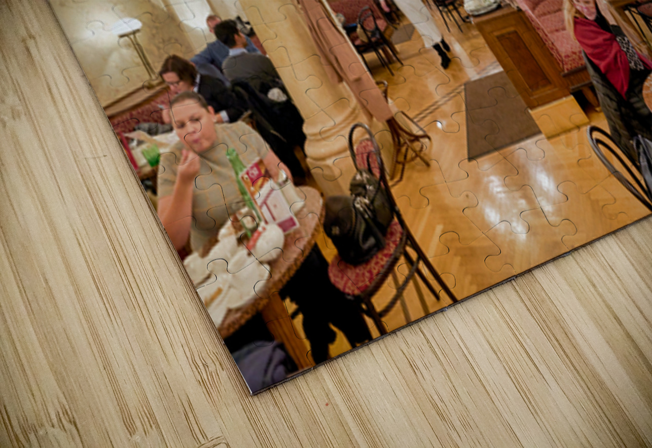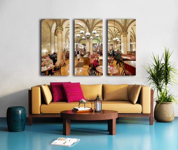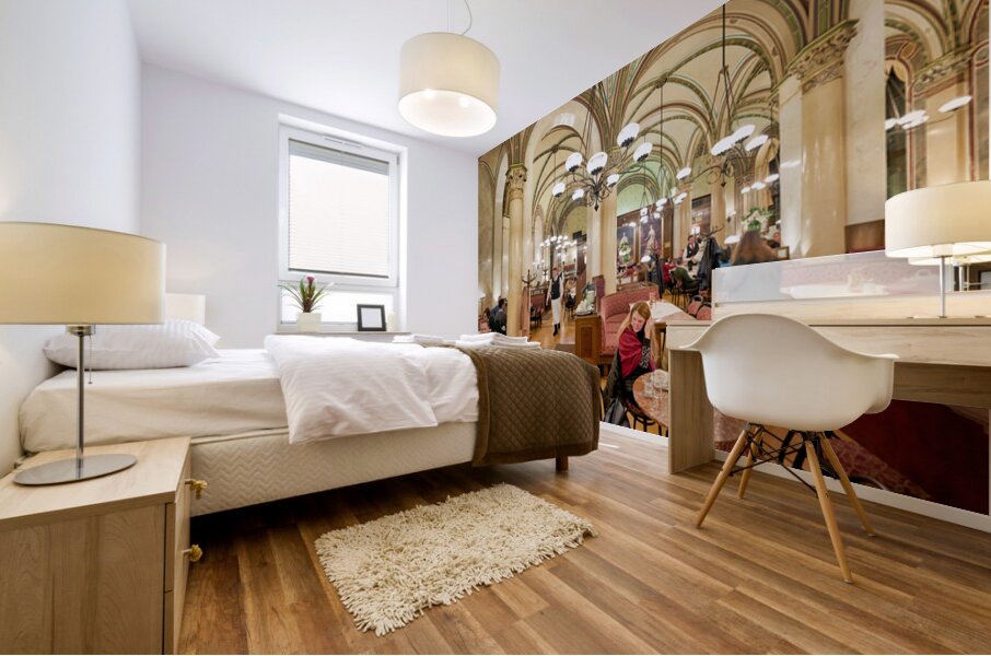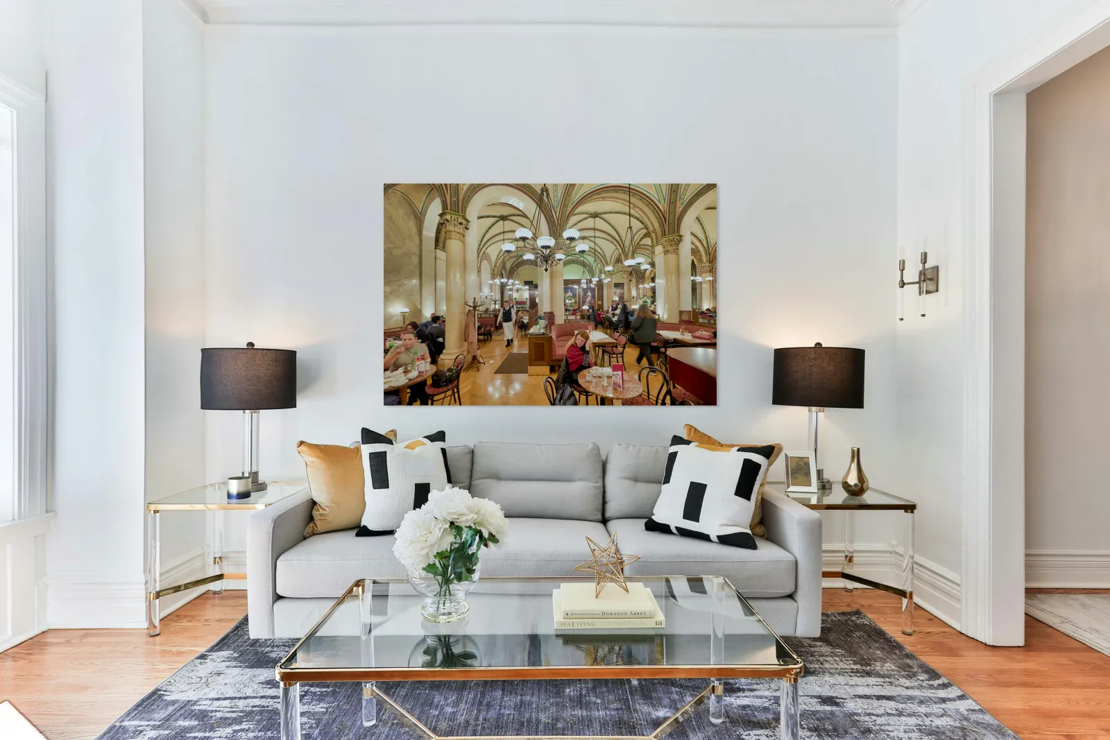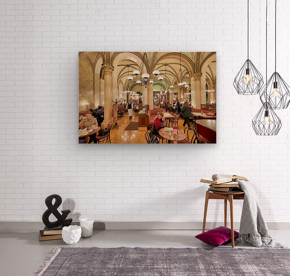 Patrons and waiters in a grand historic cafe likely Cafe Central in Vienna Austria enjoying the ornate architecture and traditional atmosphere.