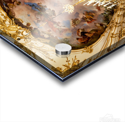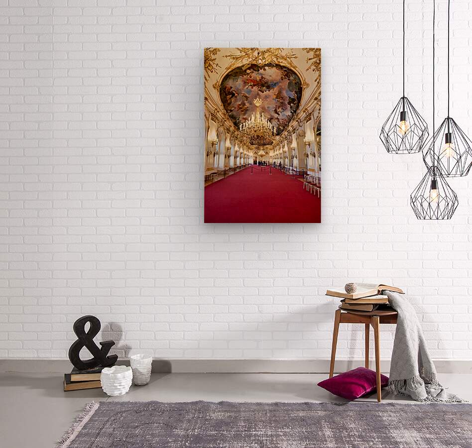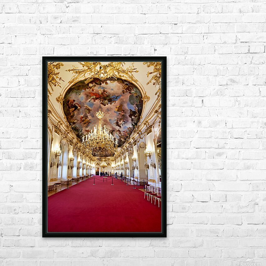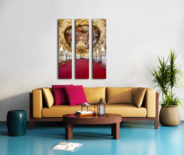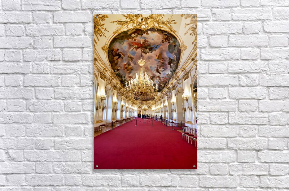 Get this artwork "Ornate palace hall with chandeliers painted ceiling and red ca" in a framed print.