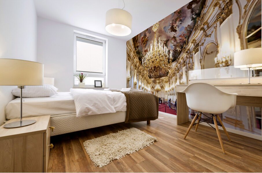 Tourists explore the opulent Great Gallery of Schönbrunn Palace in Vienna Austria admiring its grand chandeliers and ceiling frescoes.