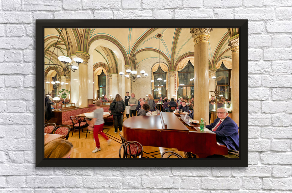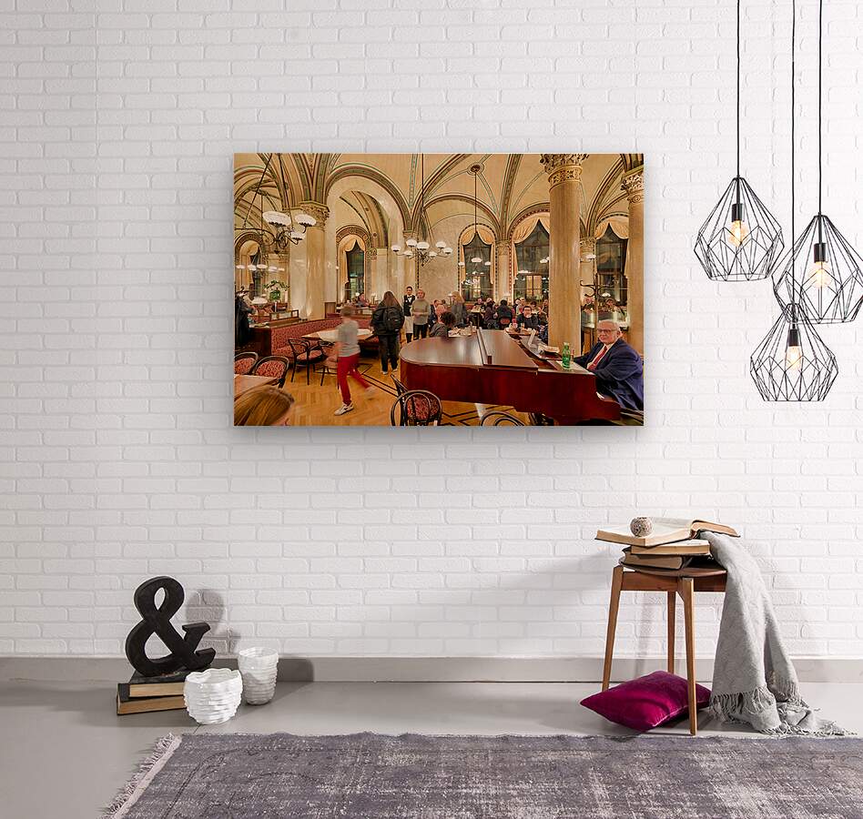 People dine and socialize in a historic ornate cafe possibly Cafe Central in Vienna with a pianist at a grand piano.
