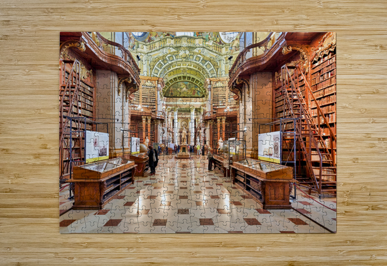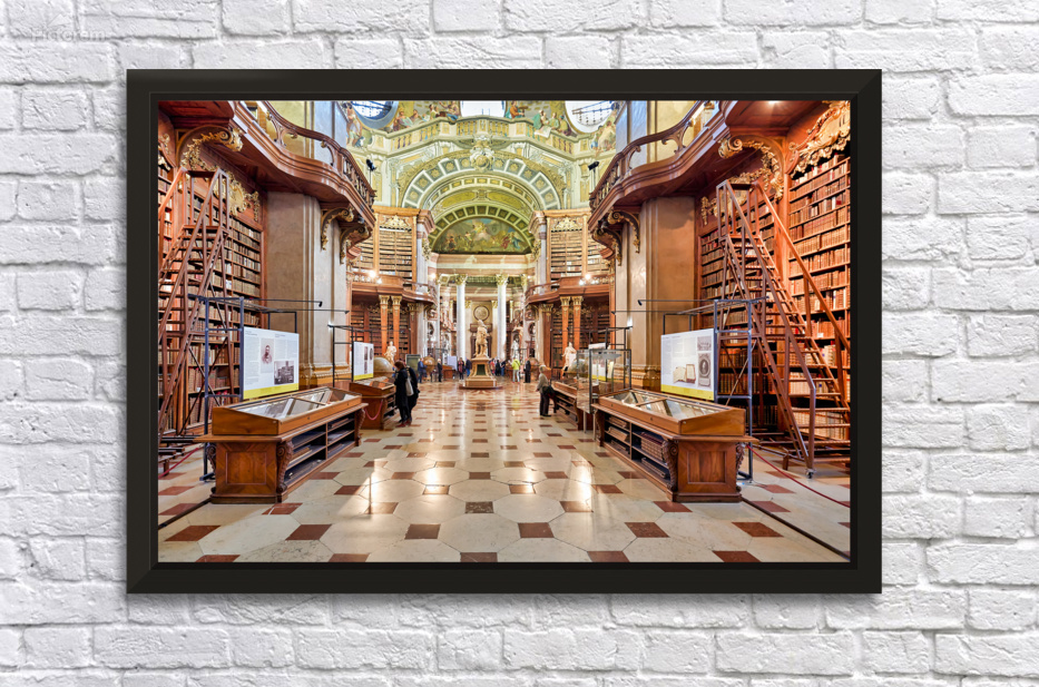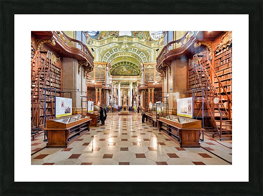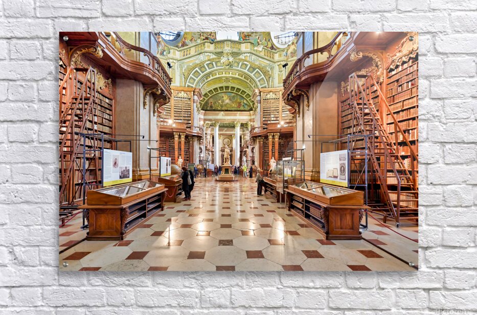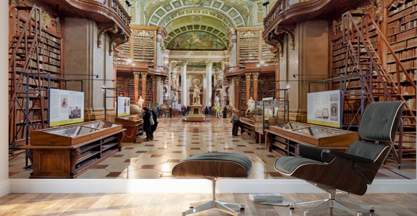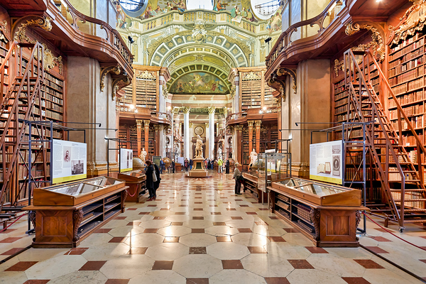 Visitors explore the magnificent Baroque State Hall of the Austrian National Library in Vienna admiring its vast collection of books and historical ex