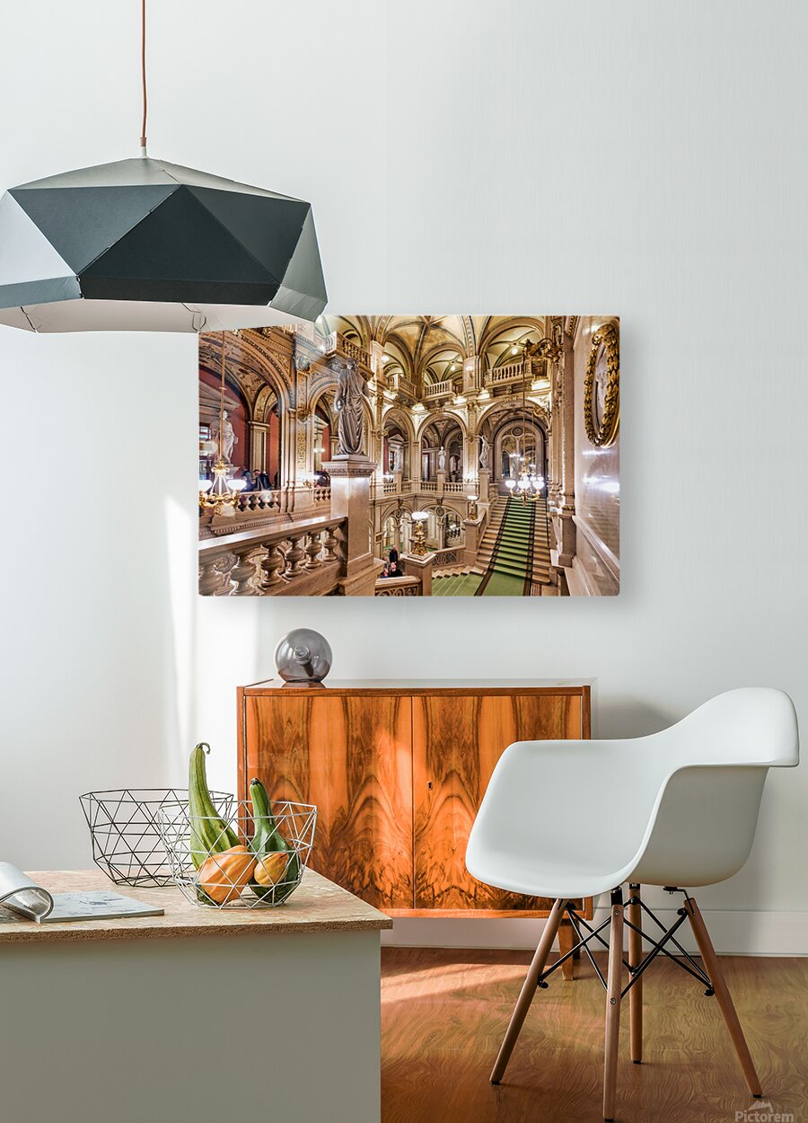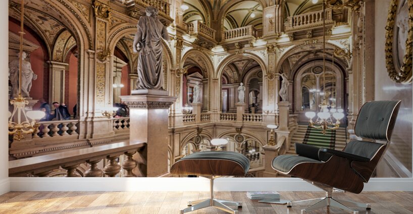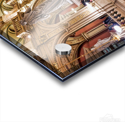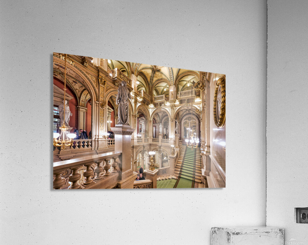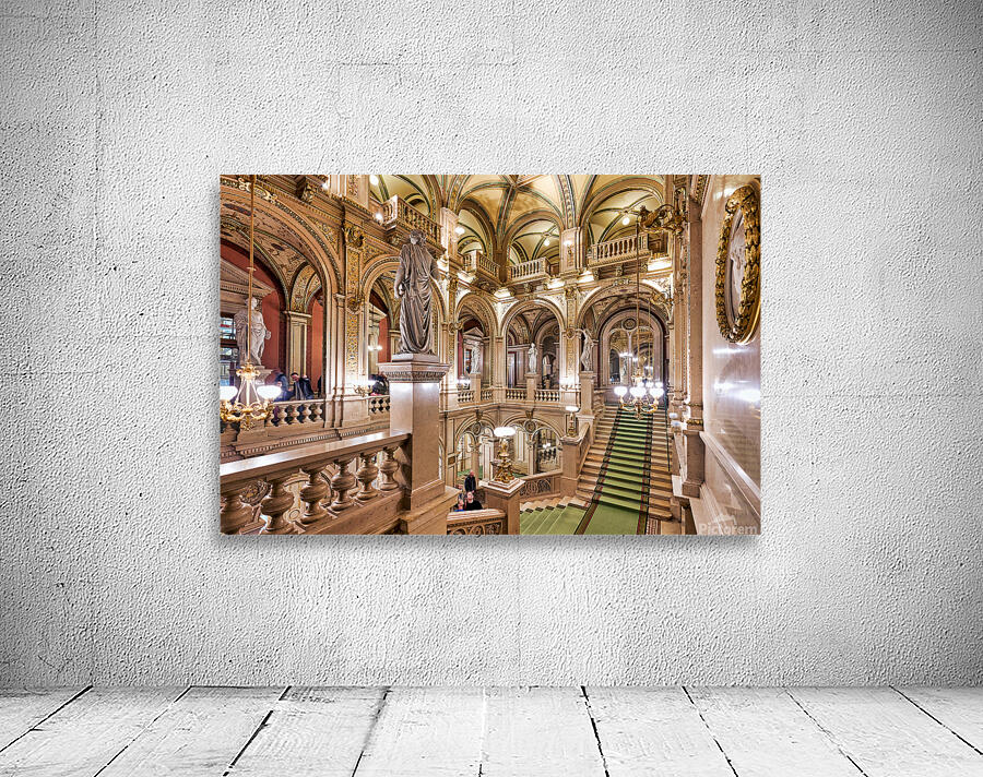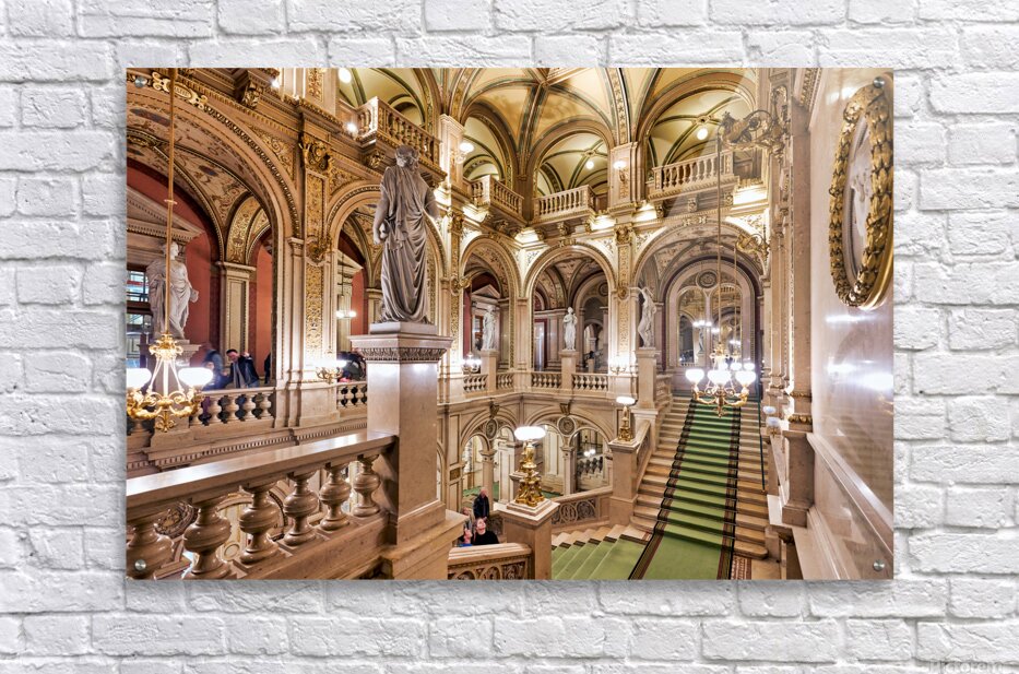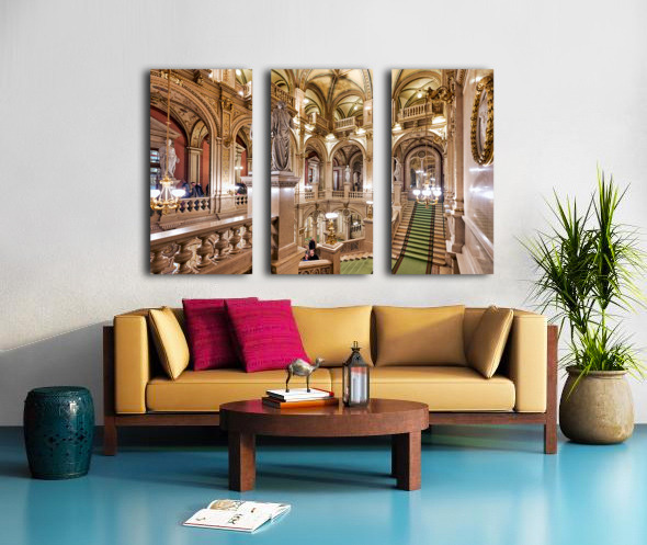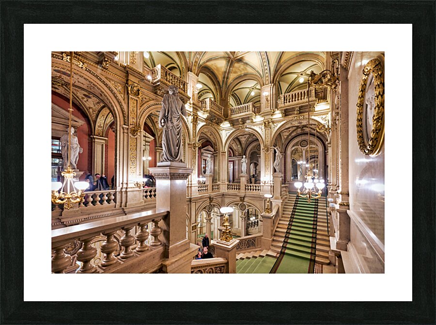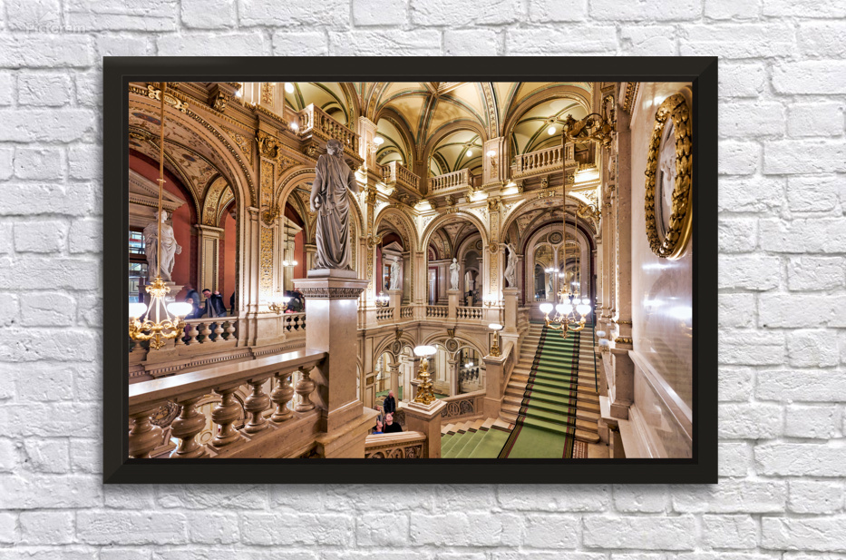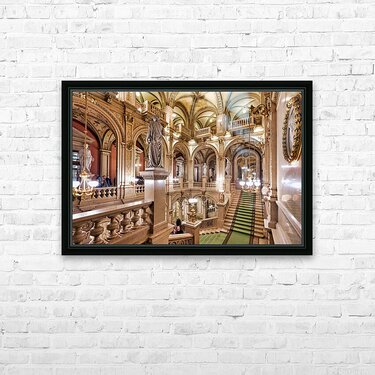 "Luxurious opera house interior with grand staircase and statues." in a framed print.