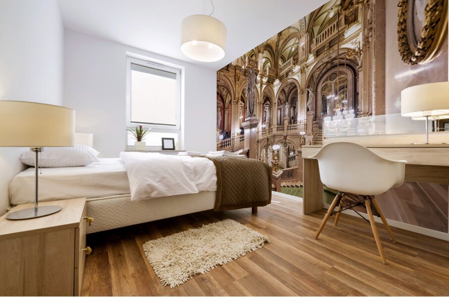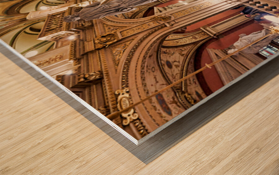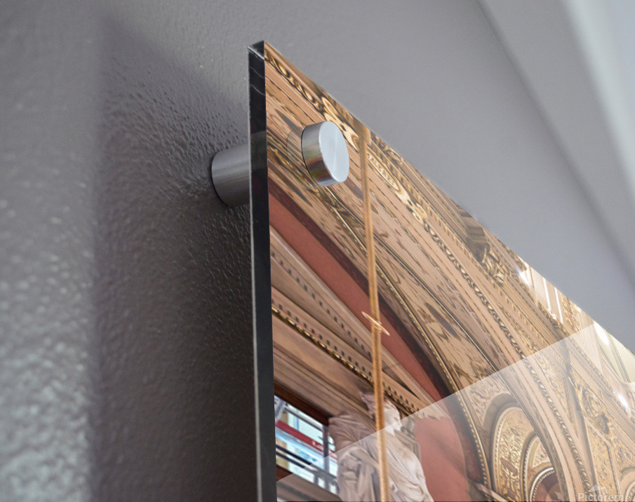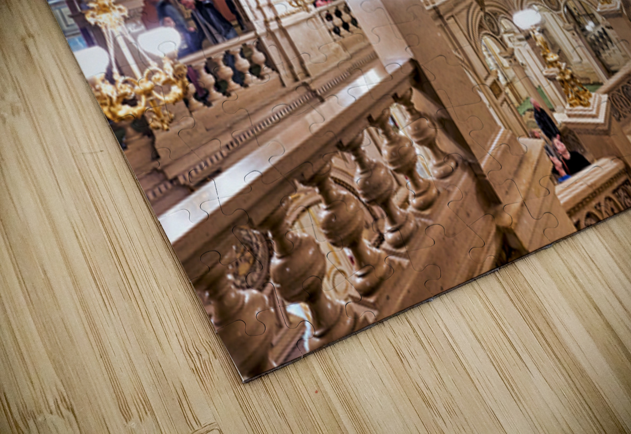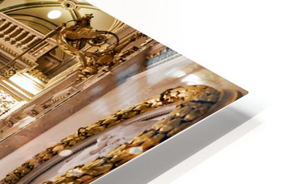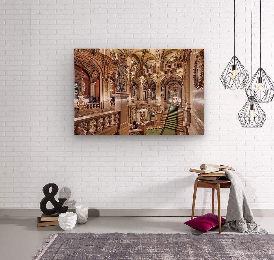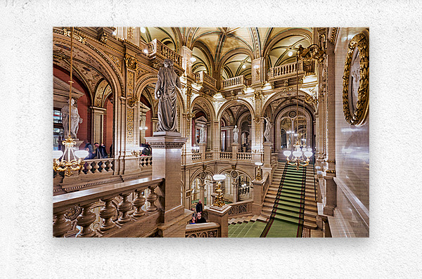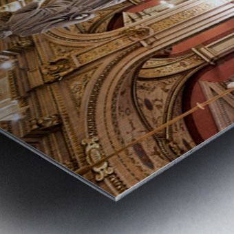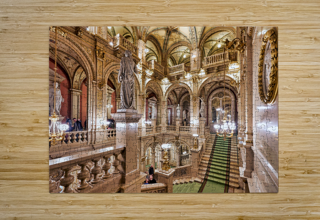 "Luxurious opera house interior with grand staircase and statues." in a framed print.