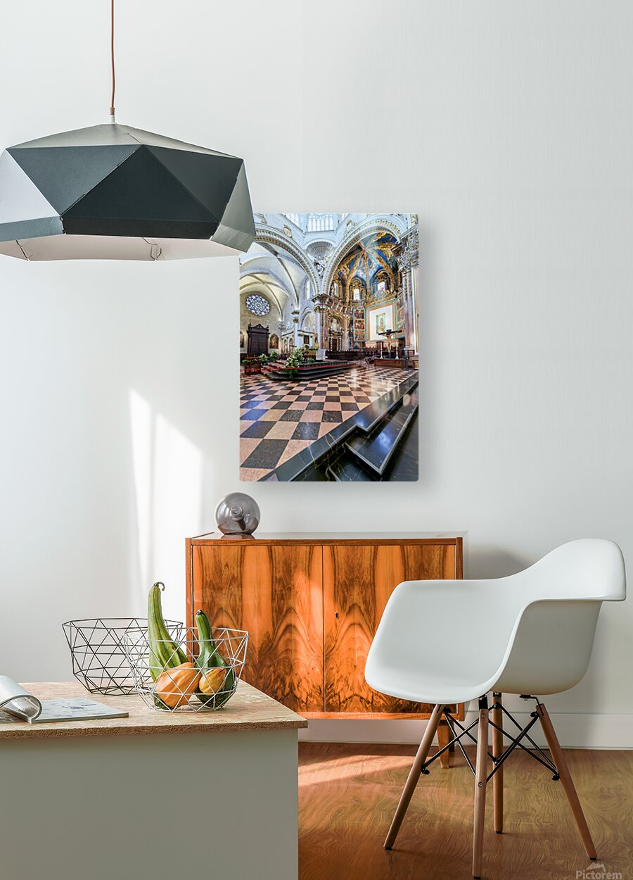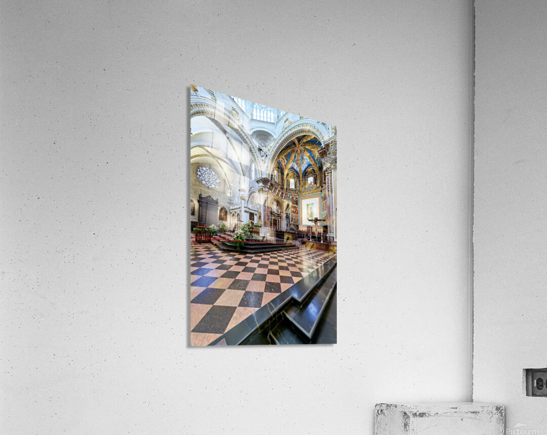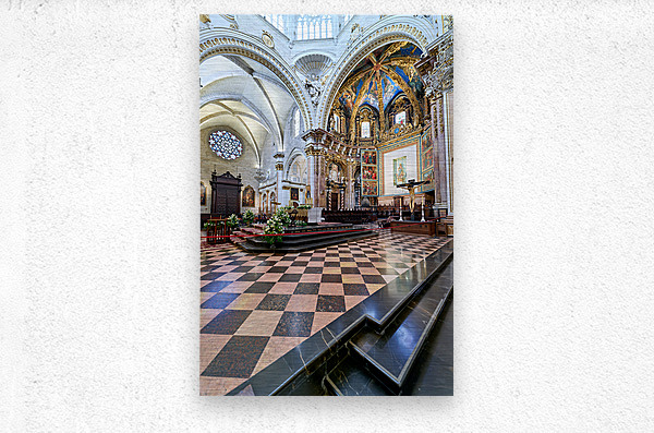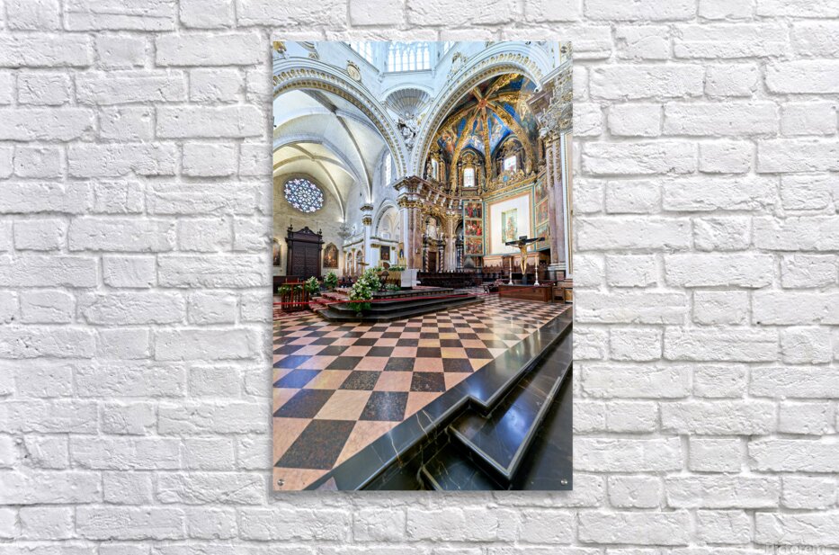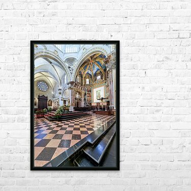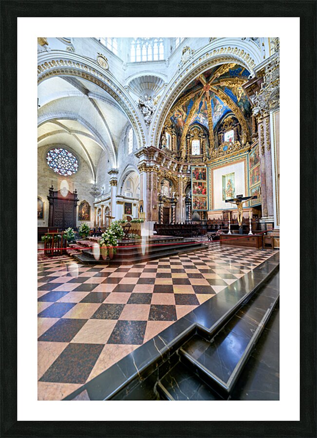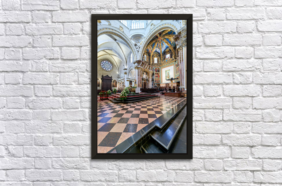 "Valencia Cathedral interior features religious artwork" in a framed print.