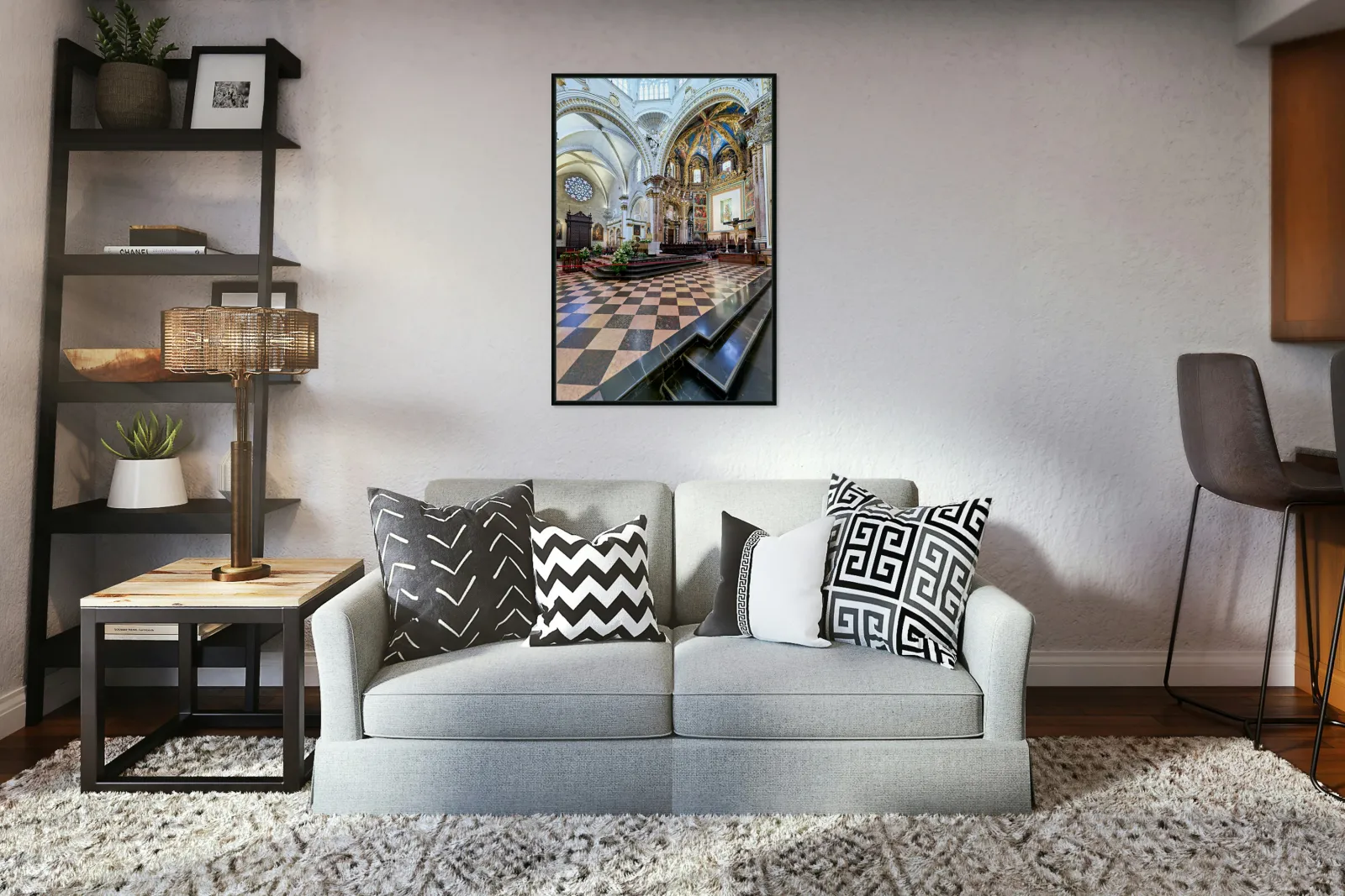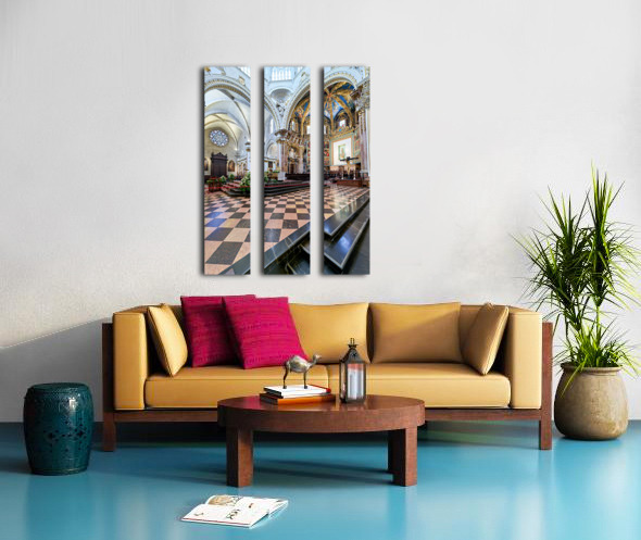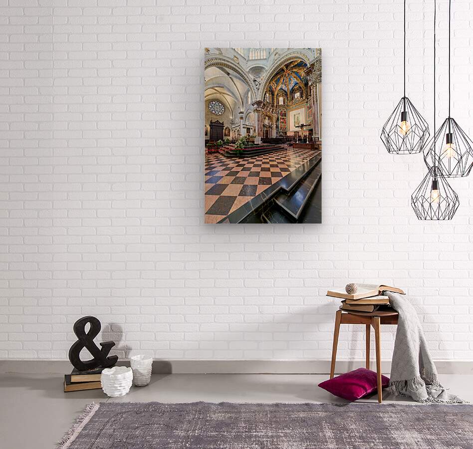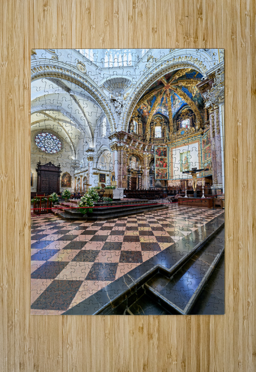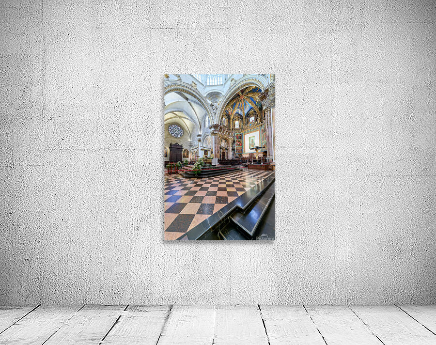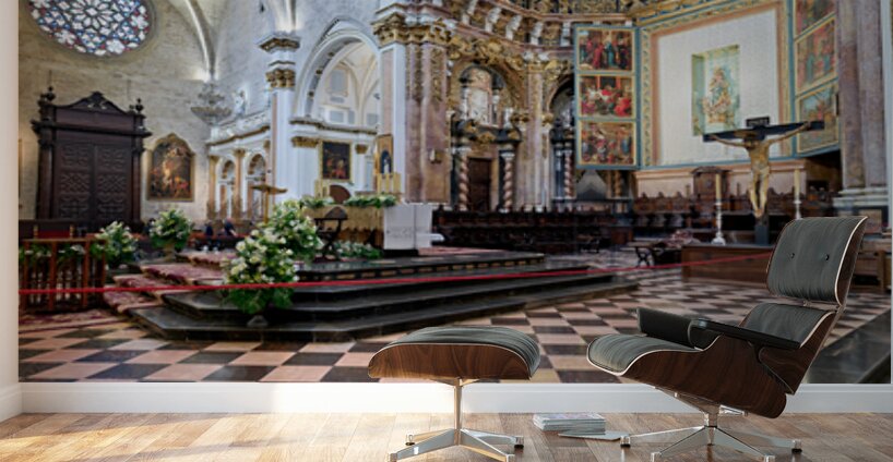 "Valencia Cathedral interior features religious artwork" in a framed print.