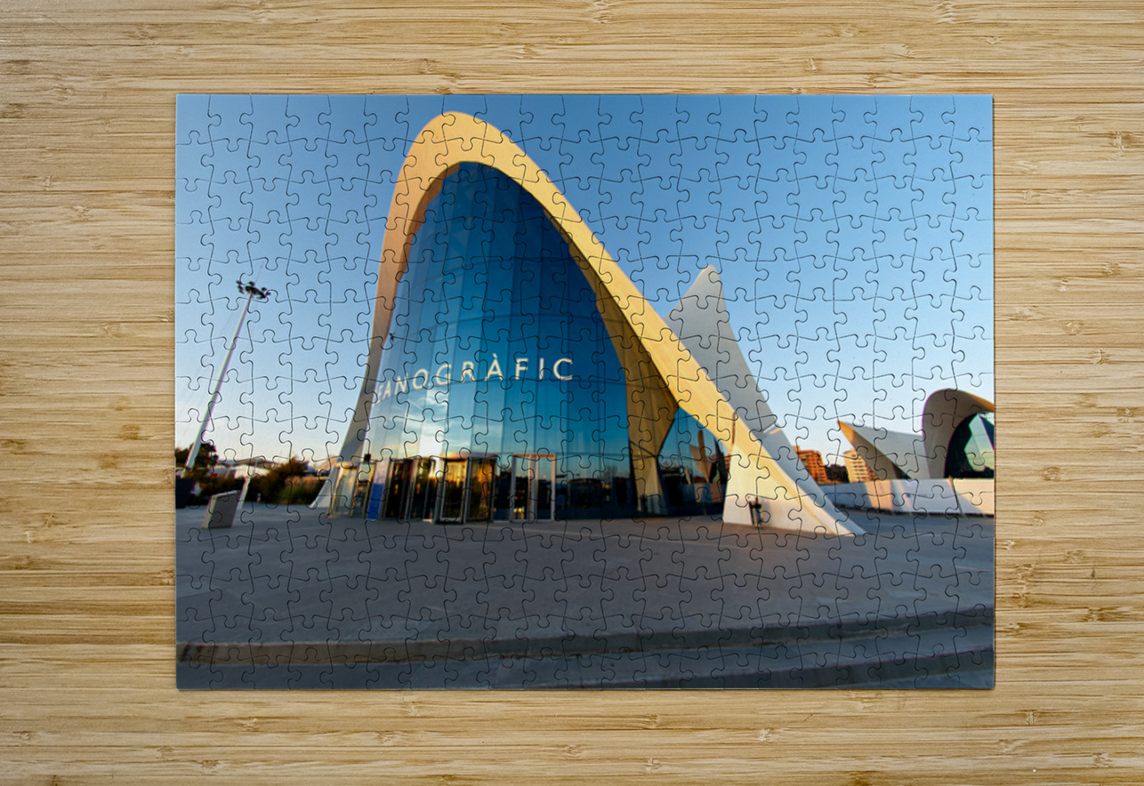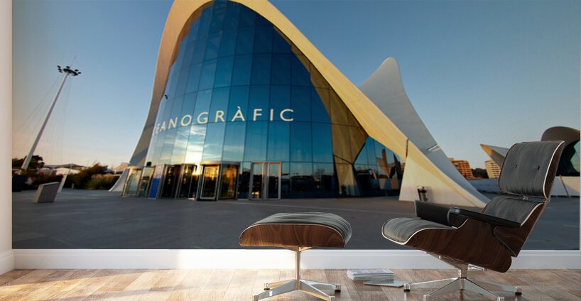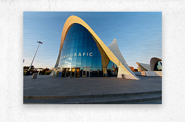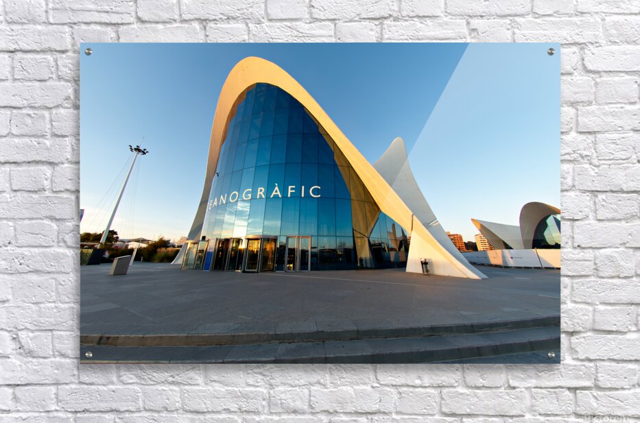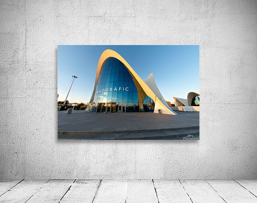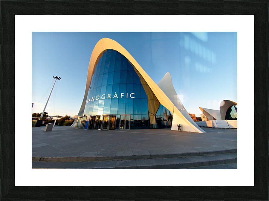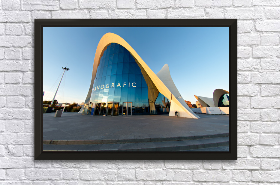 "Valencia shows Oceanografic oceanarium at sunset time" in a framed print.