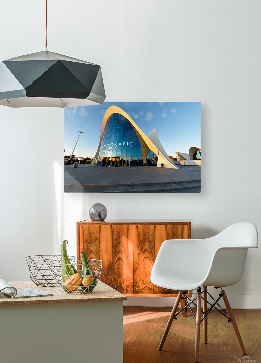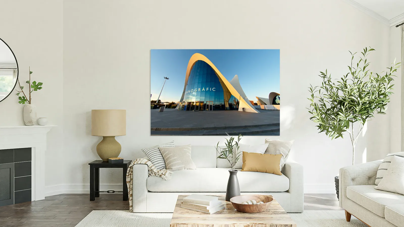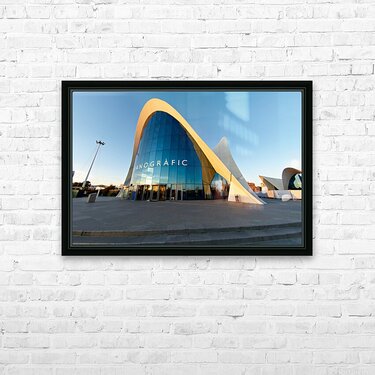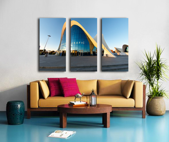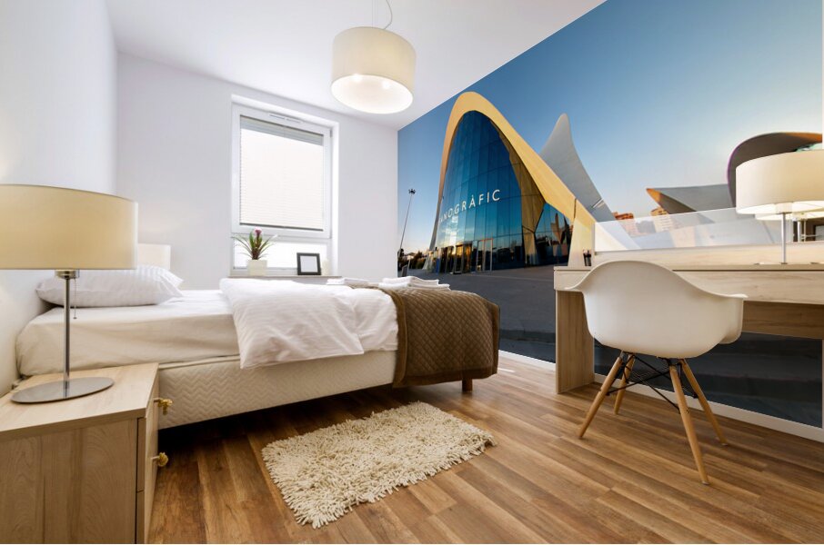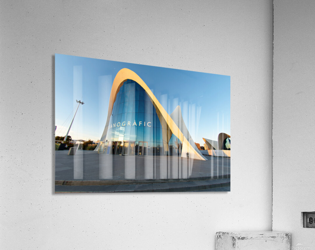 "Valencia shows Oceanografic oceanarium at sunset time" in a framed print.