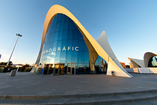 Visitors explore Oceanografic oceanarium in Valencia Spain during the evening. The modern building captures attention with its unique design.