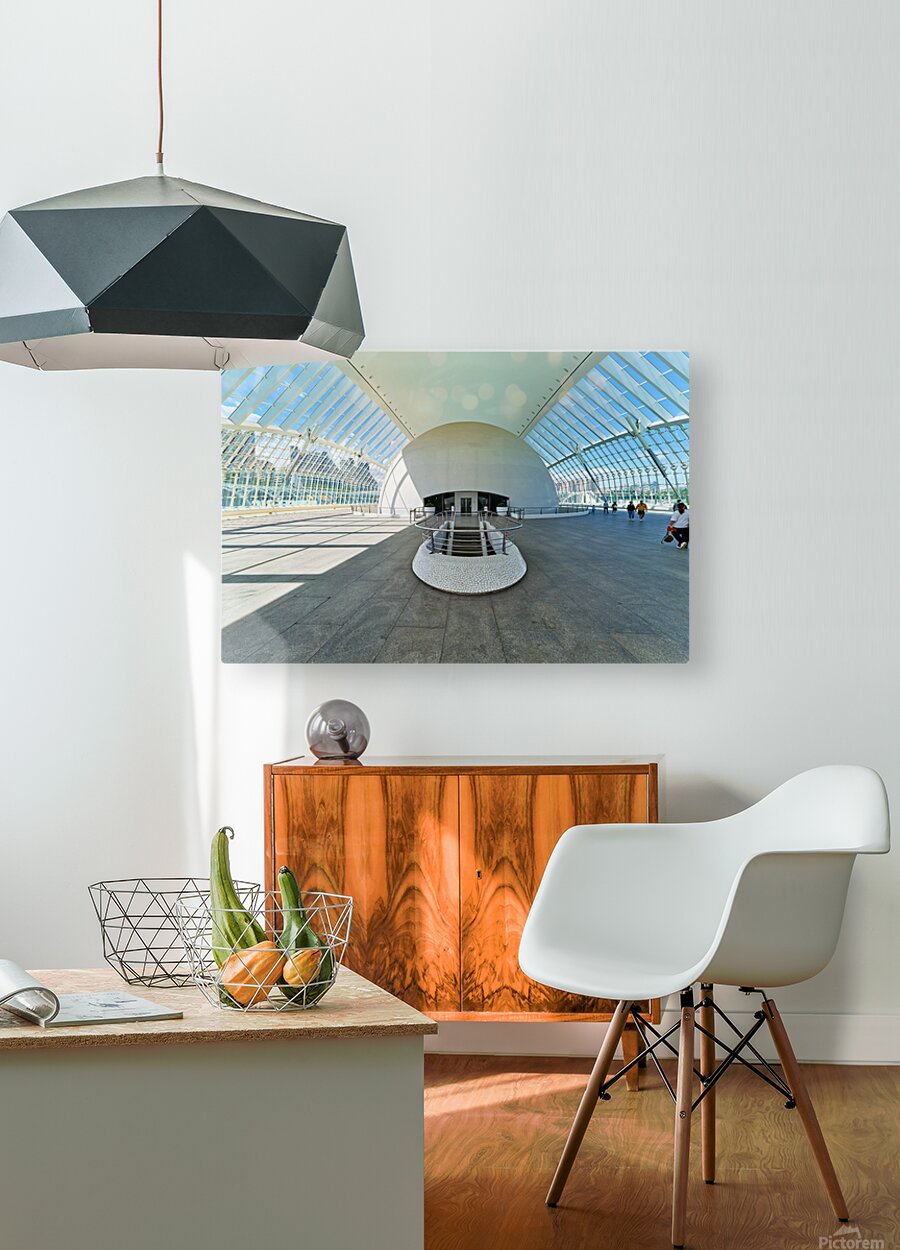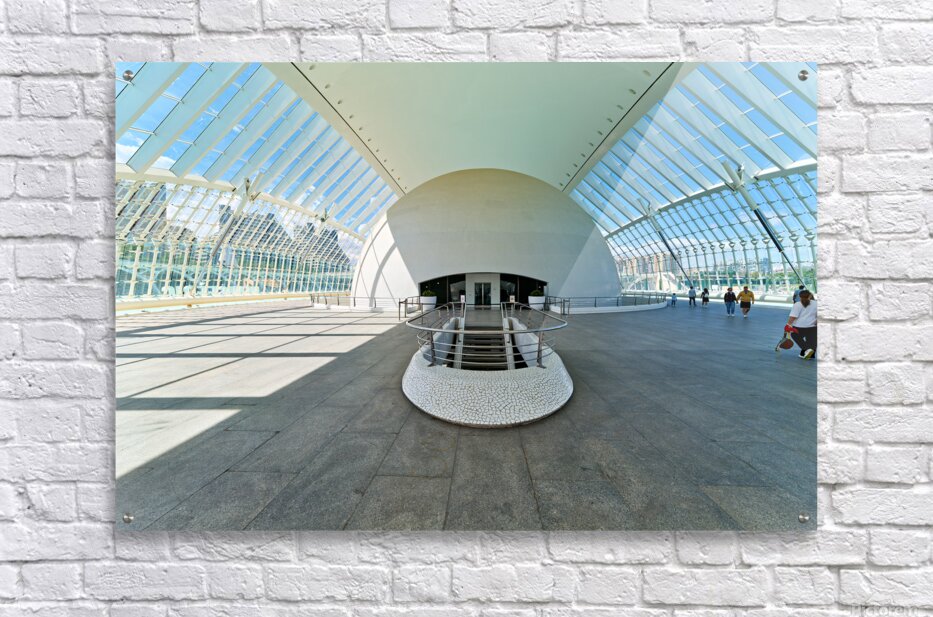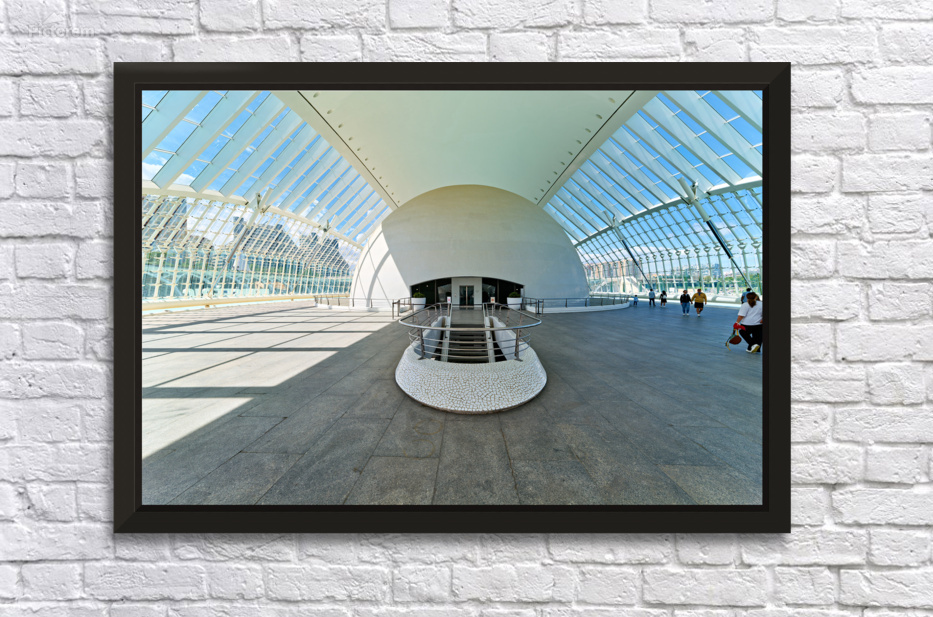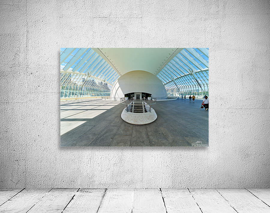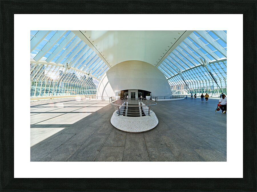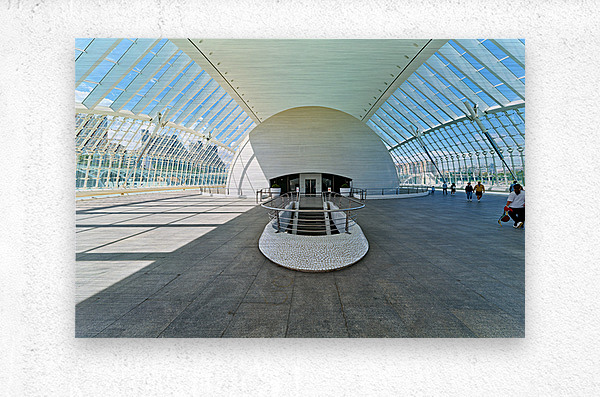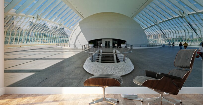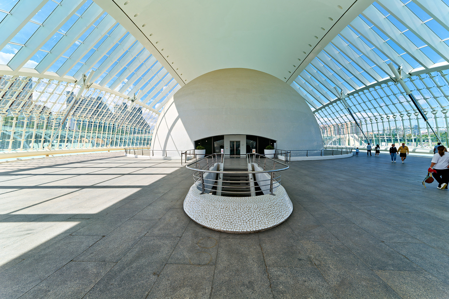 People explore the Hemisferic in Valencia Spain. The modern architecture stands out in the city landscape. Sunlight fills the space.