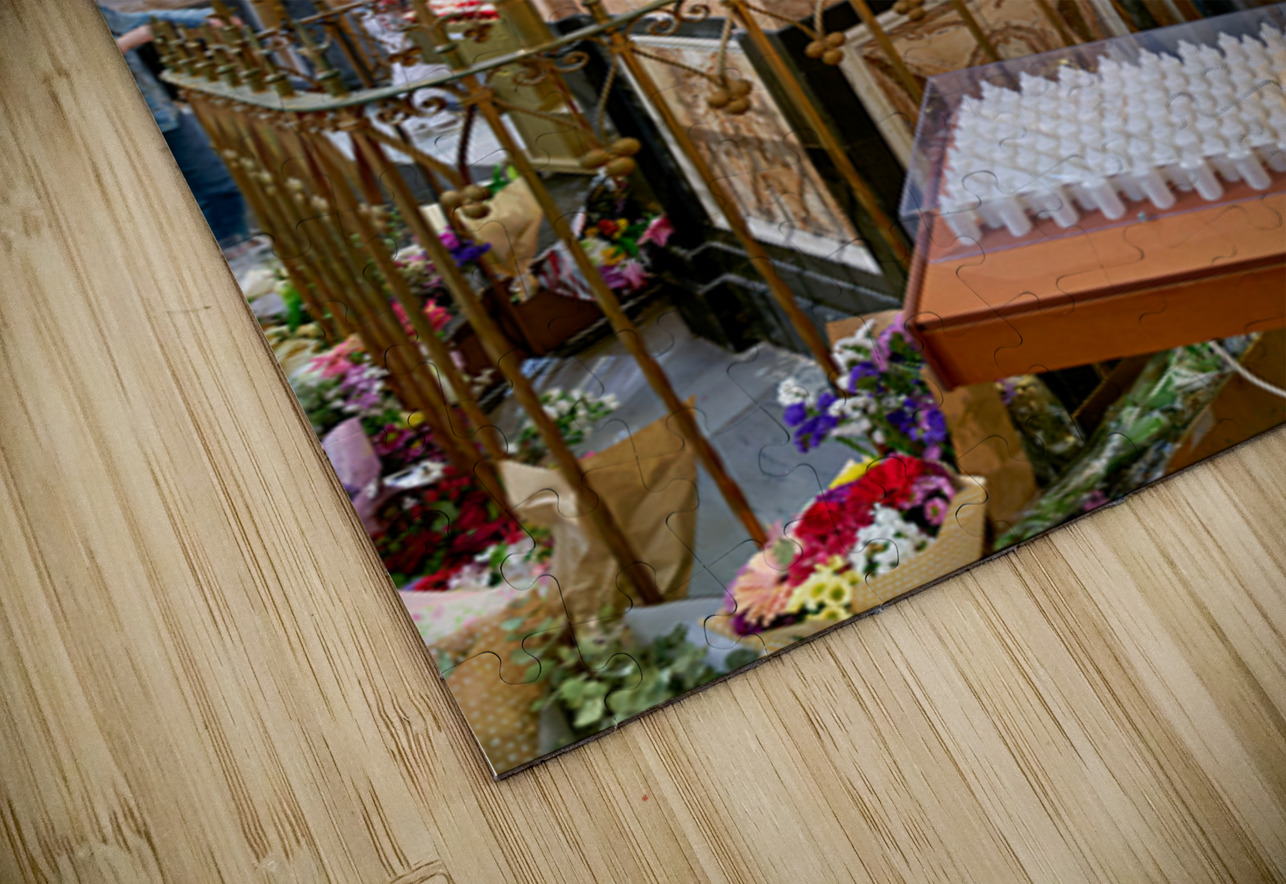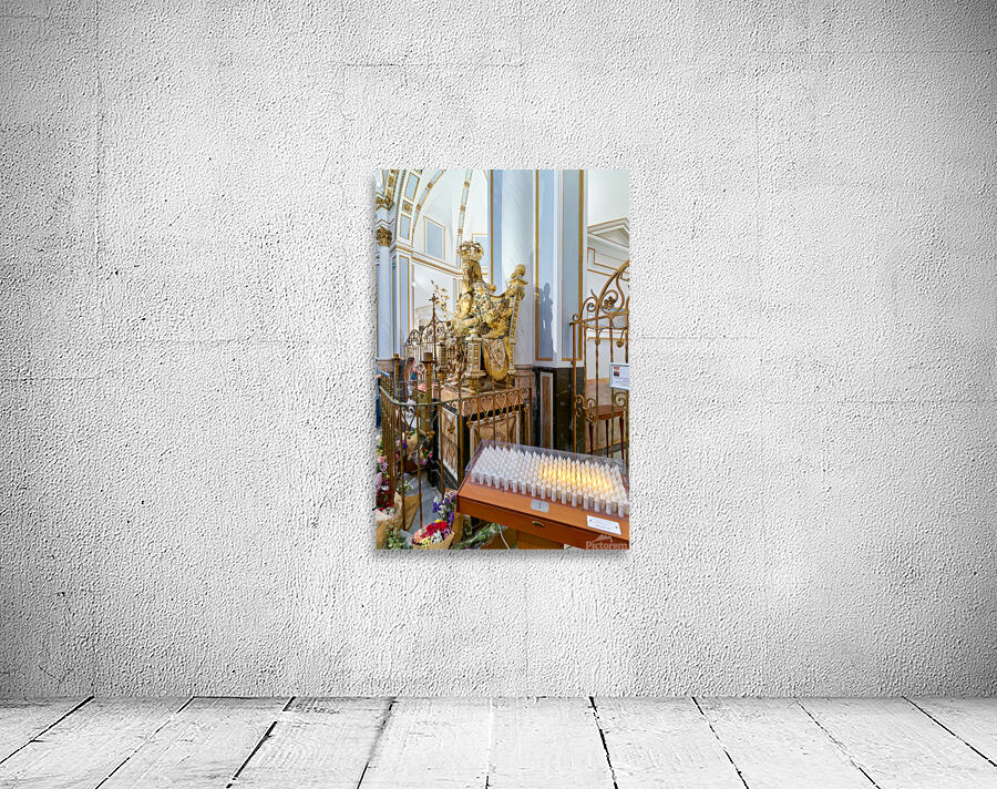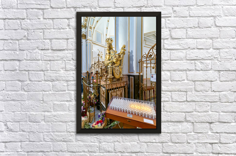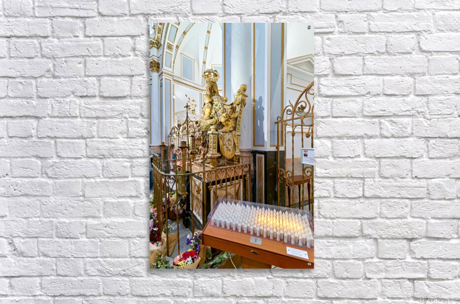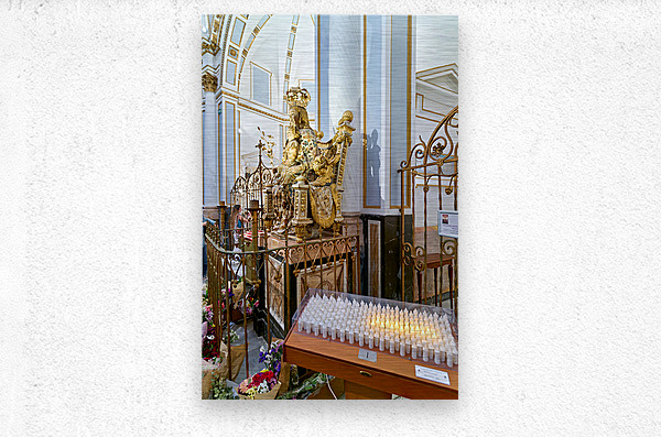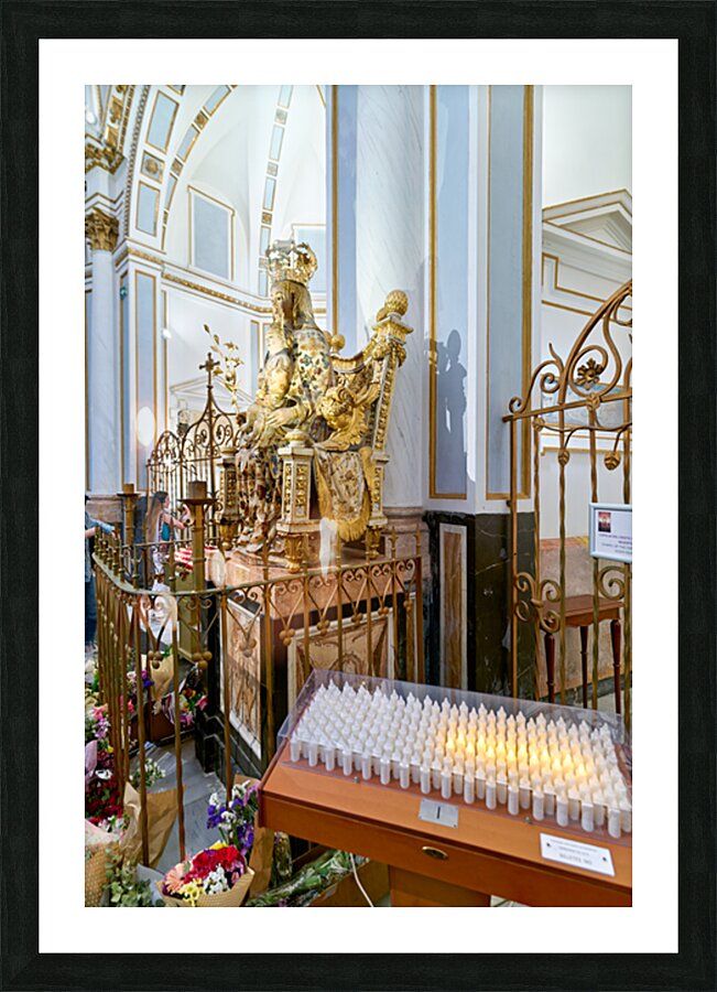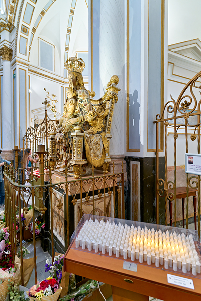 Worshippers light candles and admire the statue of the Virgin Mary inside Valencia Cathedral. The space is filled with flowers and devotion.