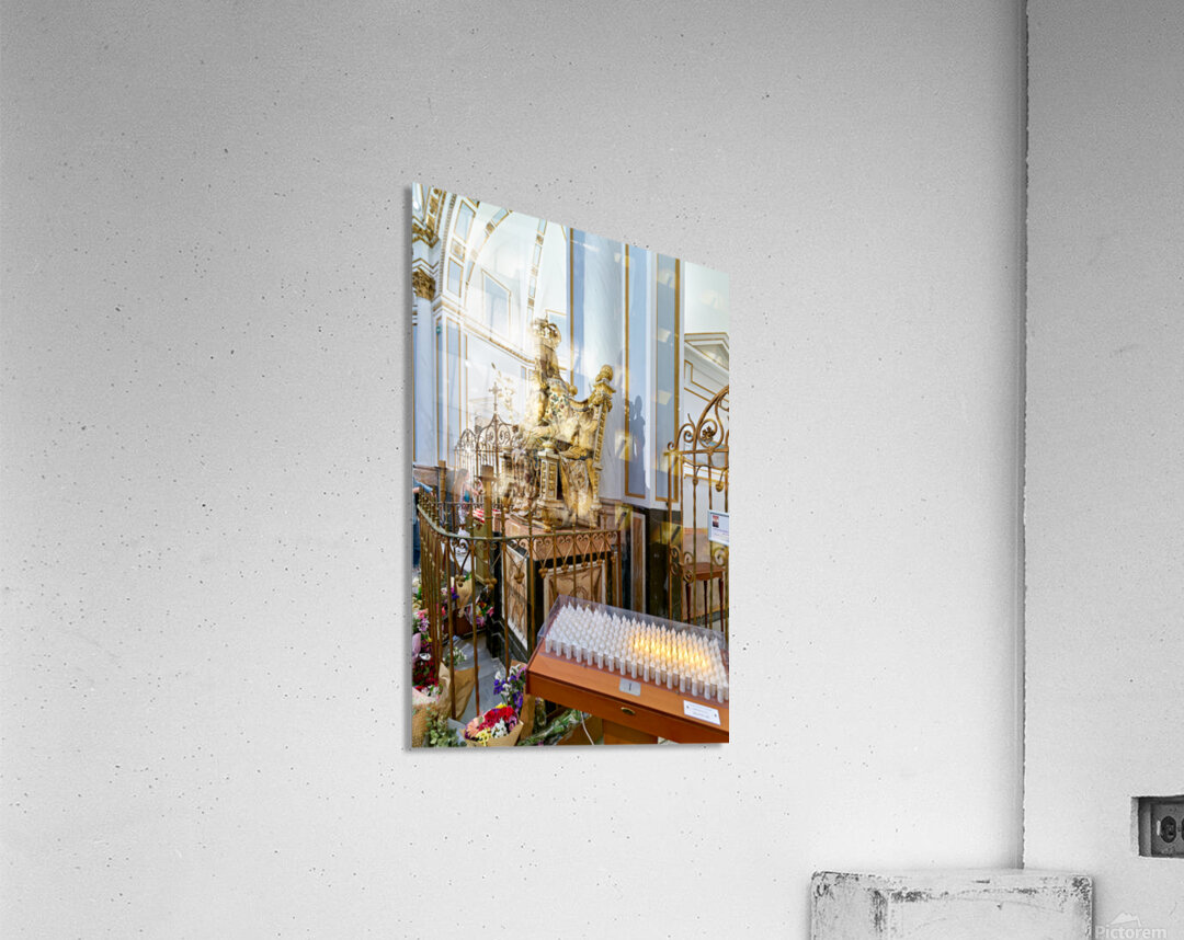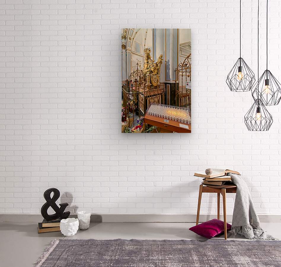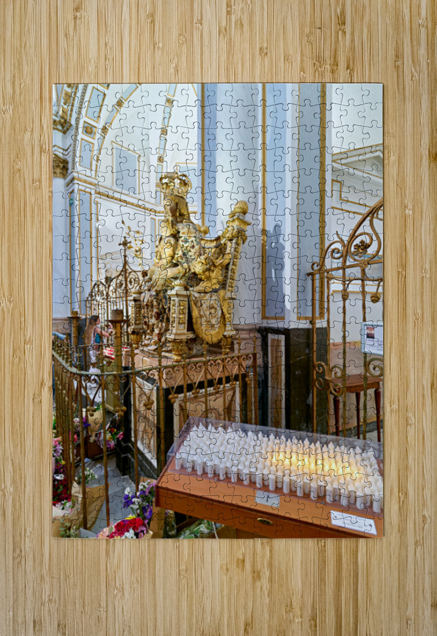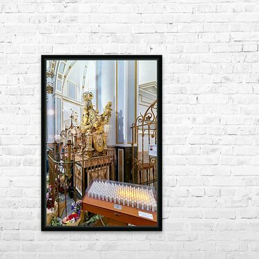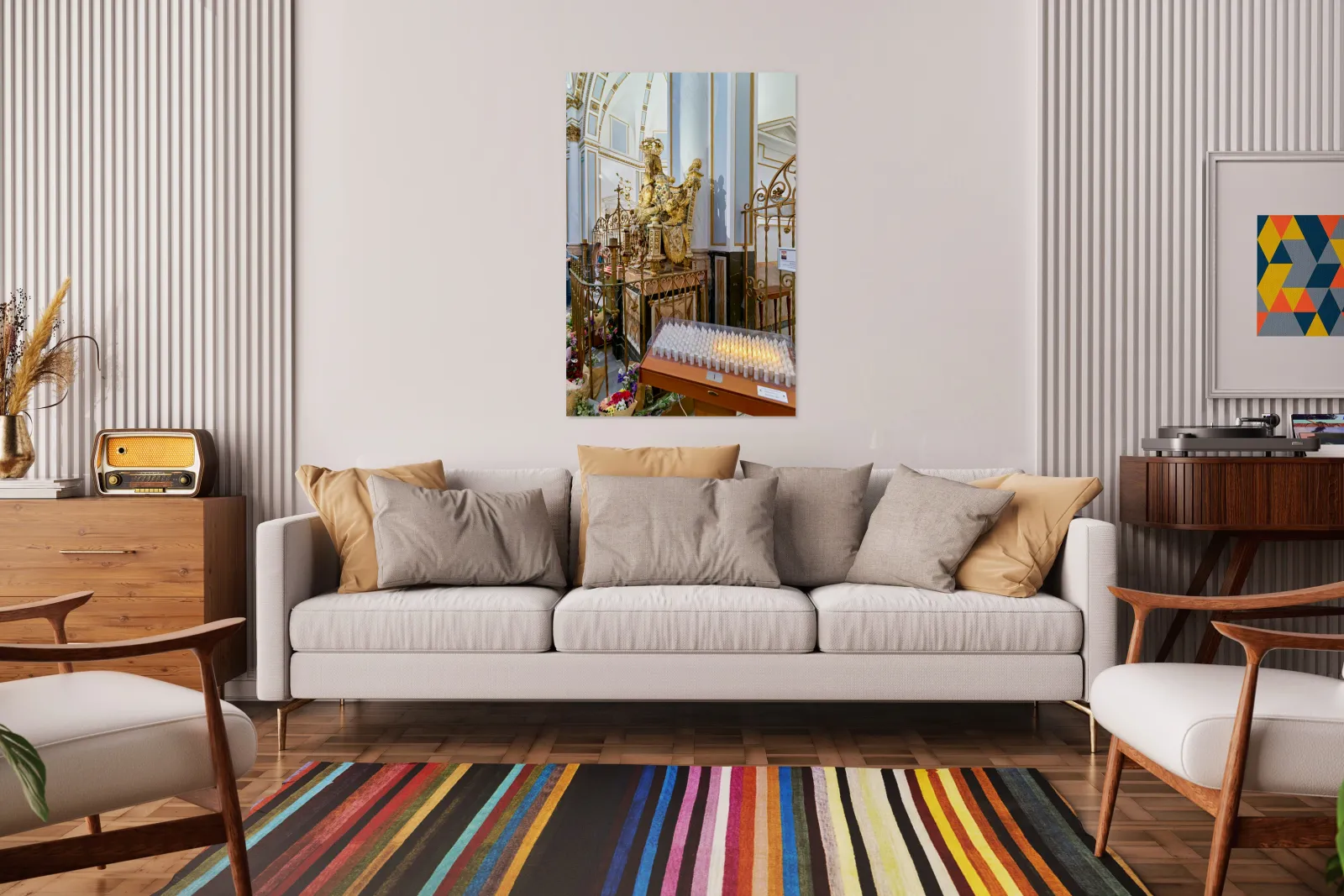 Worshippers light candles and admire the statue of the Virgin Mary inside Valencia Cathedral. The space is filled with flowers and devotion.