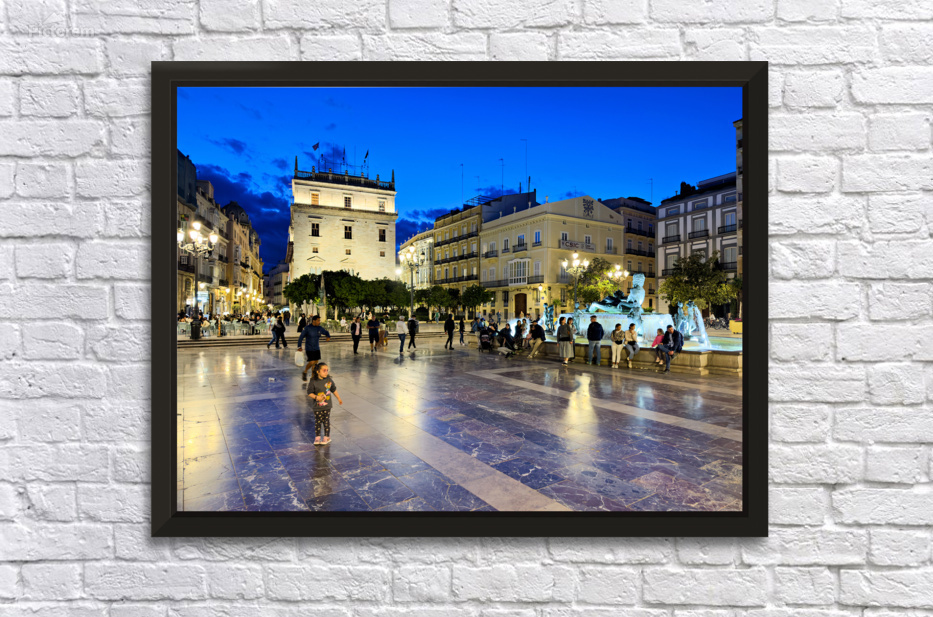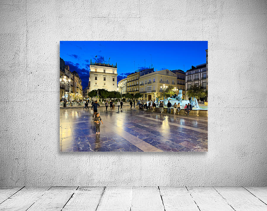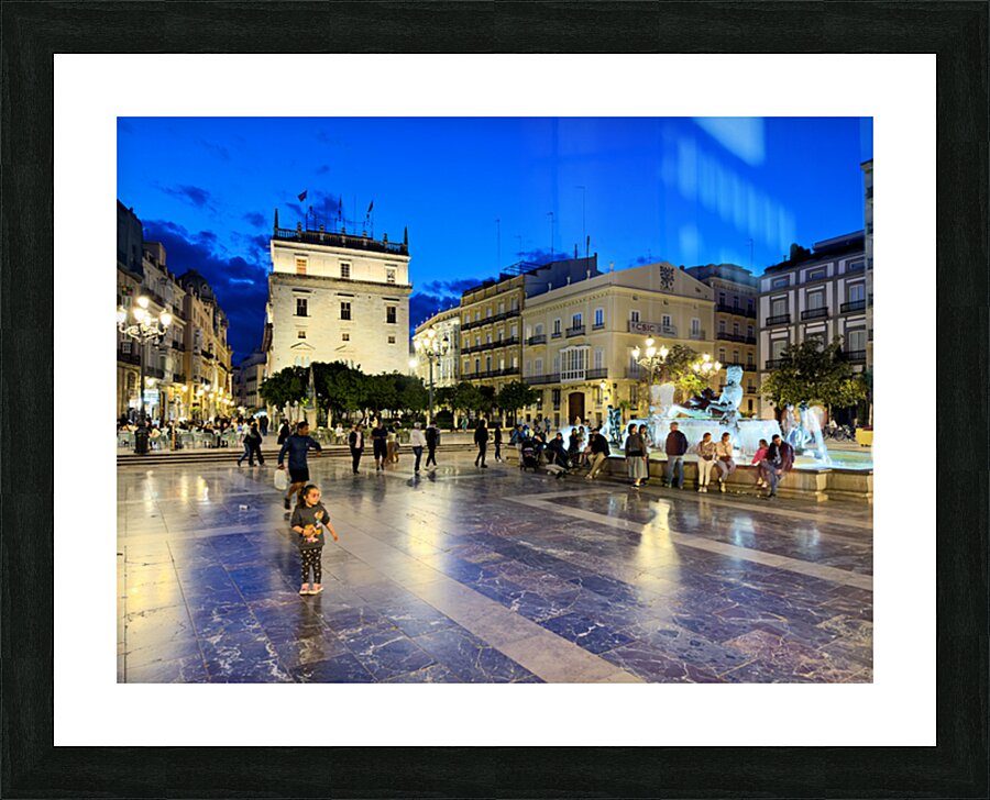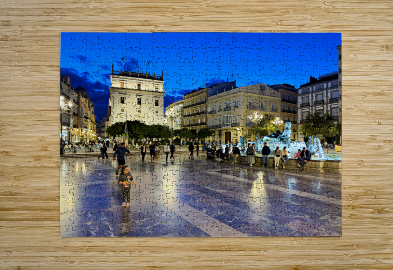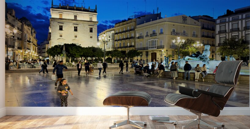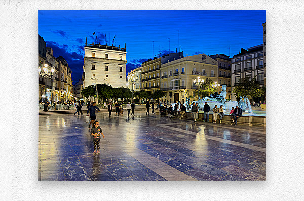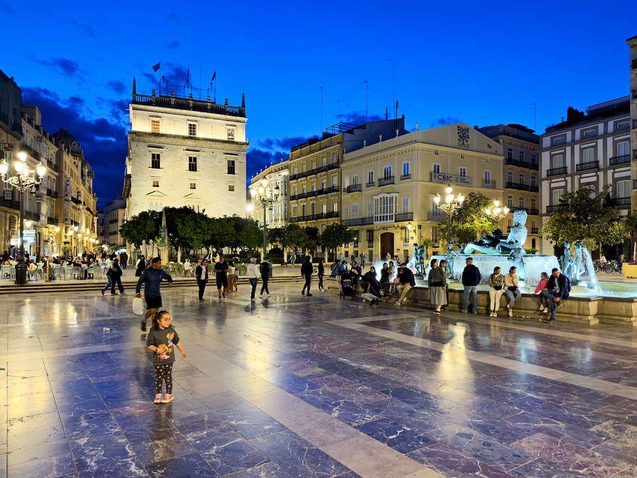 Visitors enjoy the evening in Plaza de la Virgen near the historic Palacio de la Generalitat Valenciana in Valencia Spain.