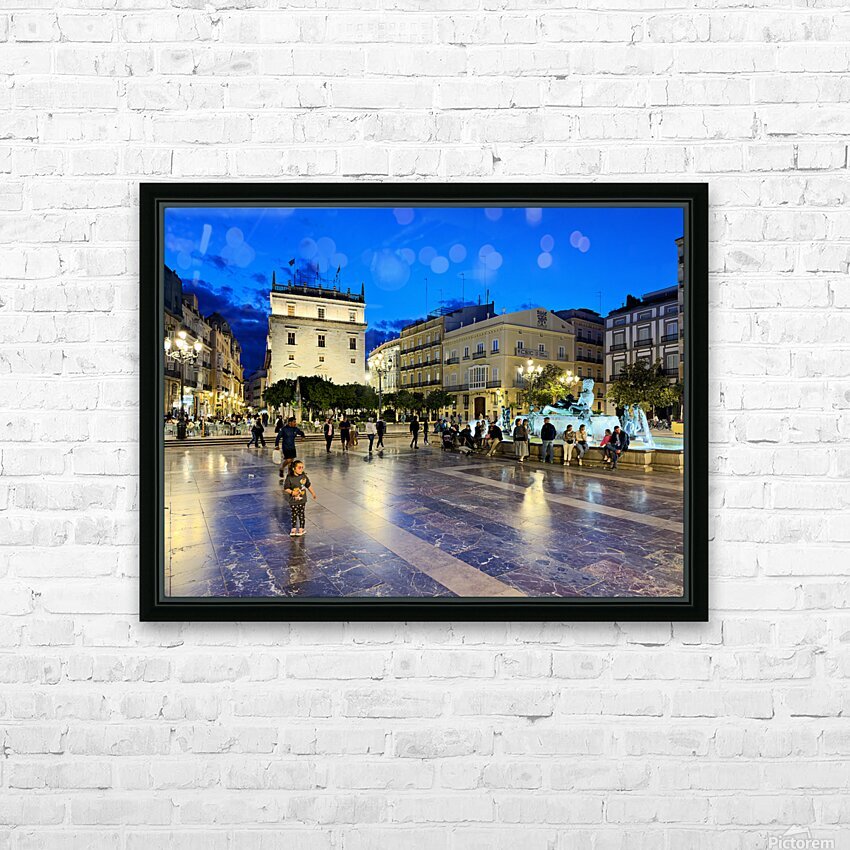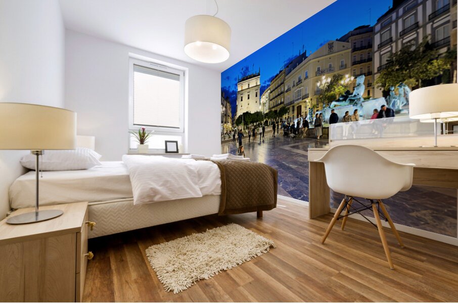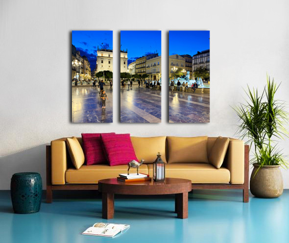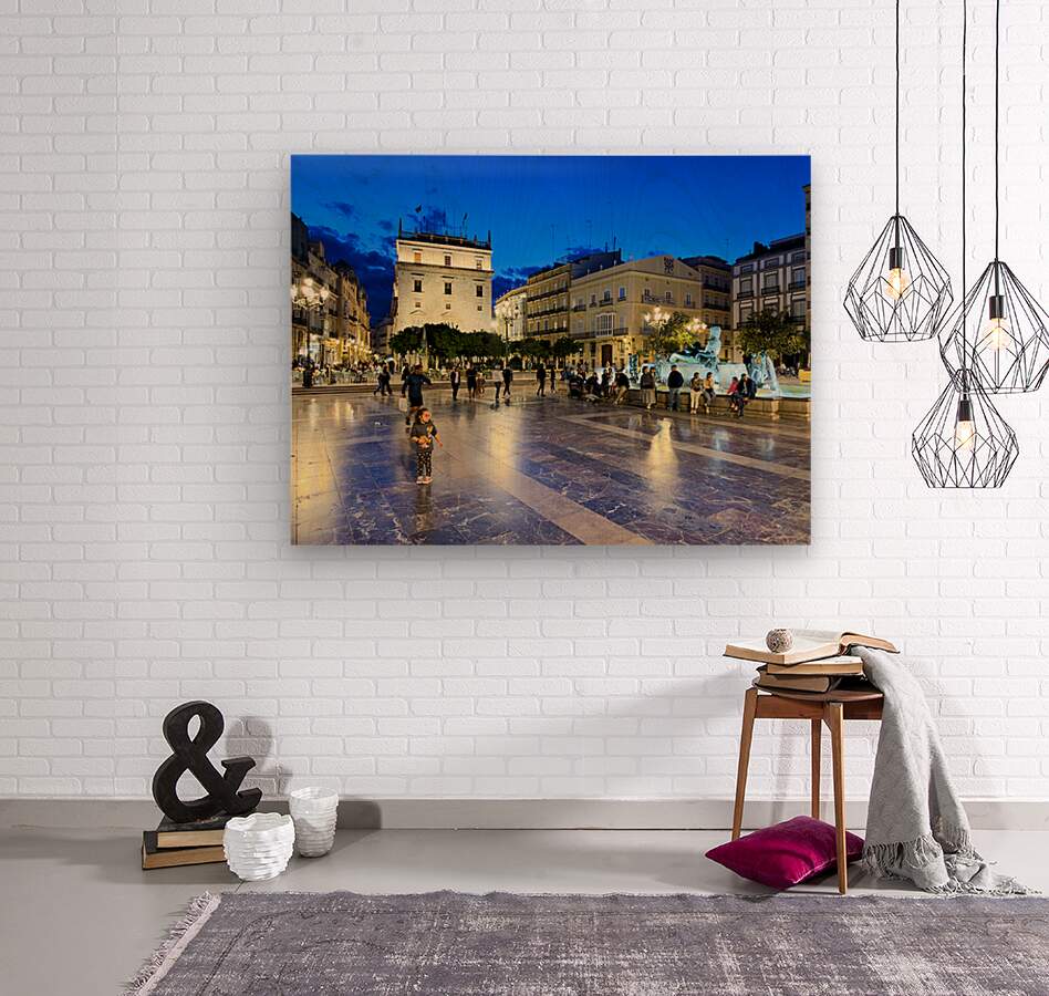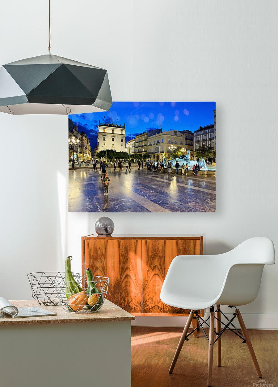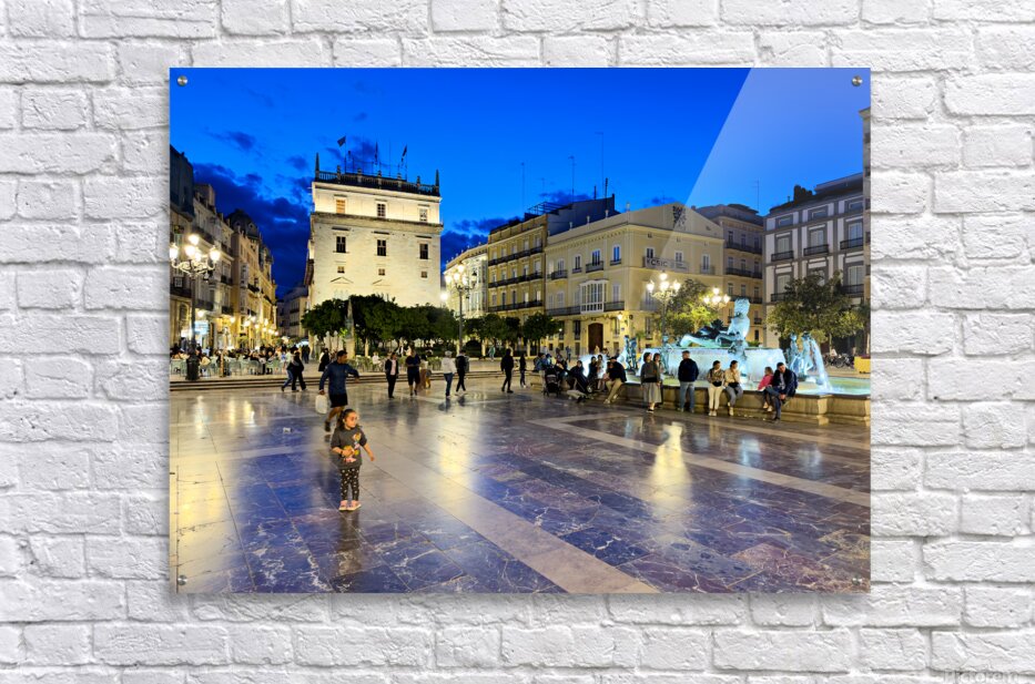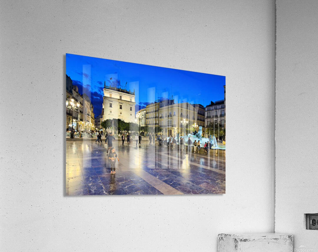 Visitors enjoy the evening in Plaza de la Virgen near the historic Palacio de la Generalitat Valenciana in Valencia Spain.