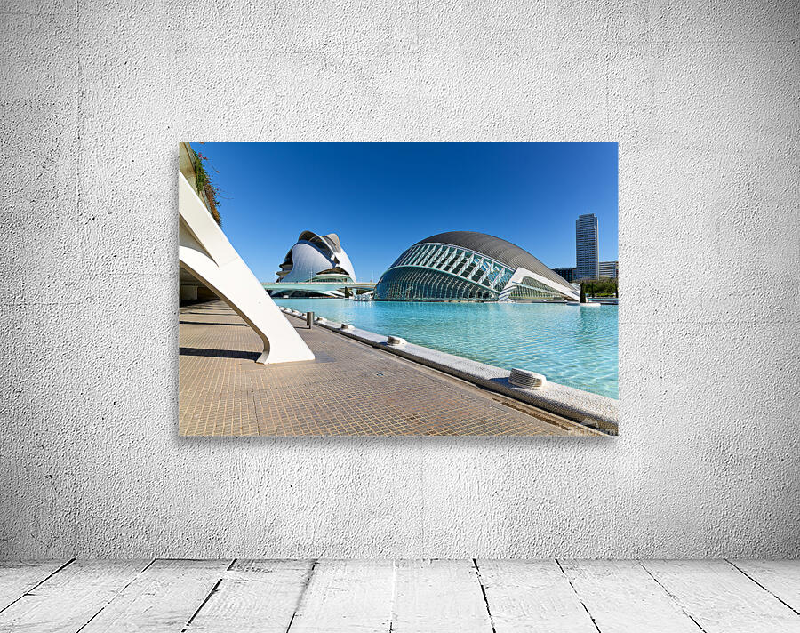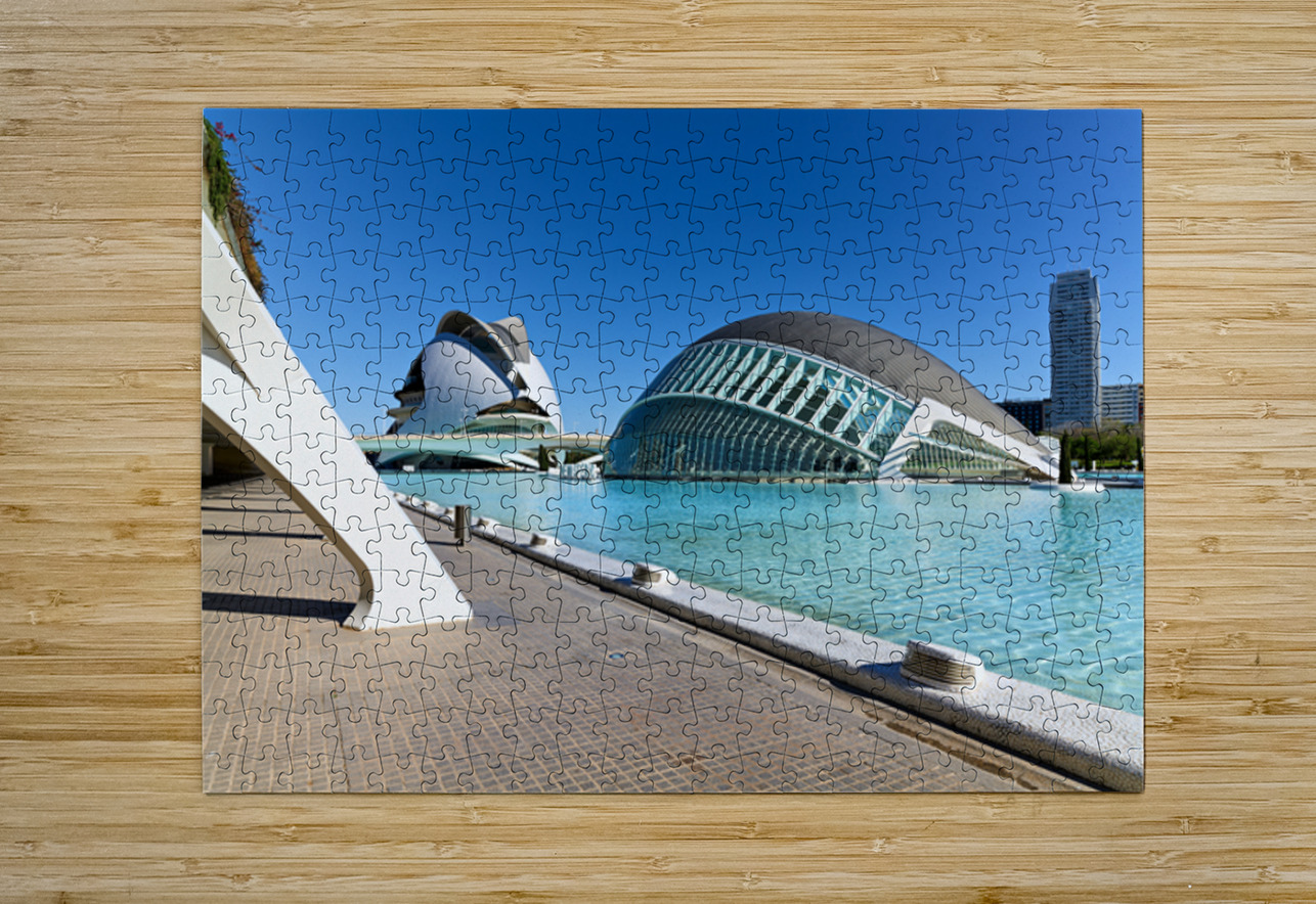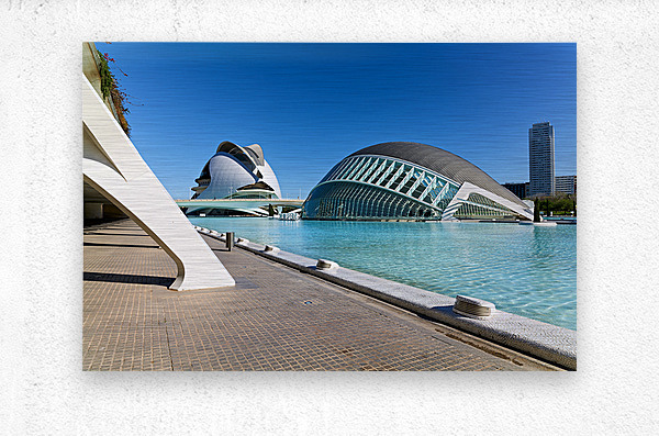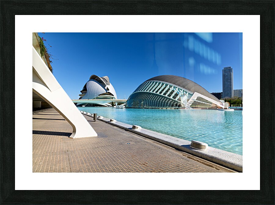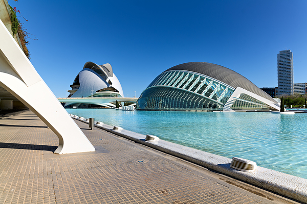 People walk by the Hemisferic in Valencia Spain with clear blue skies and calm water reflections present during the afternoon.