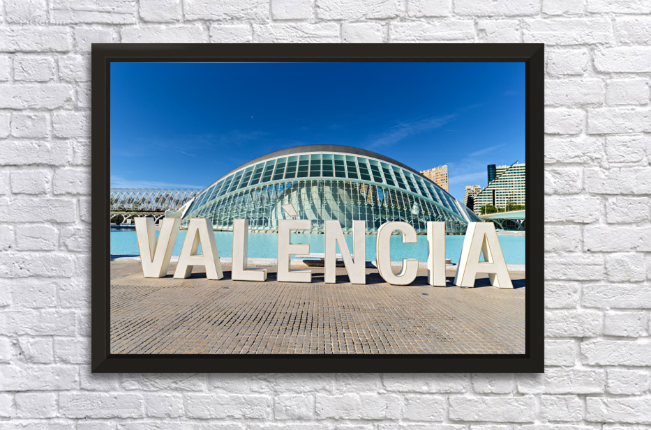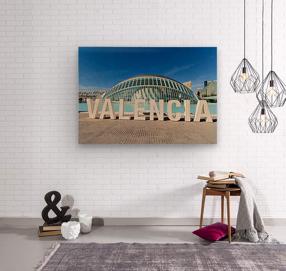 Visitors explore the City of Arts and Sciences in Valencia. The large letters spell Valencia in front of the Hemisfèric under clear skies.