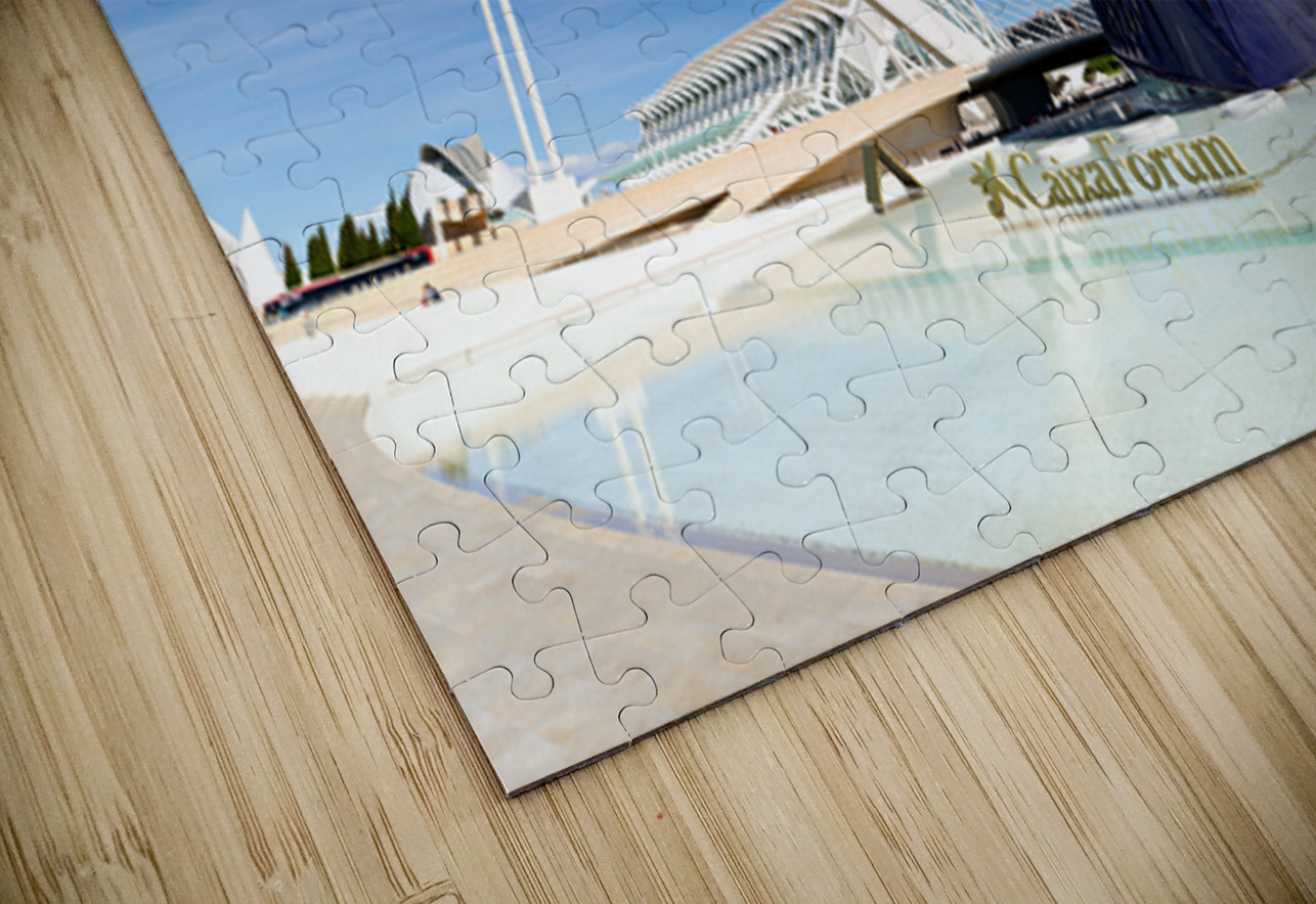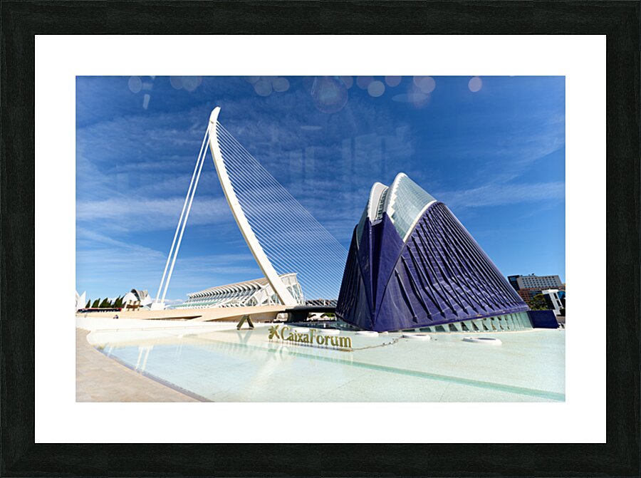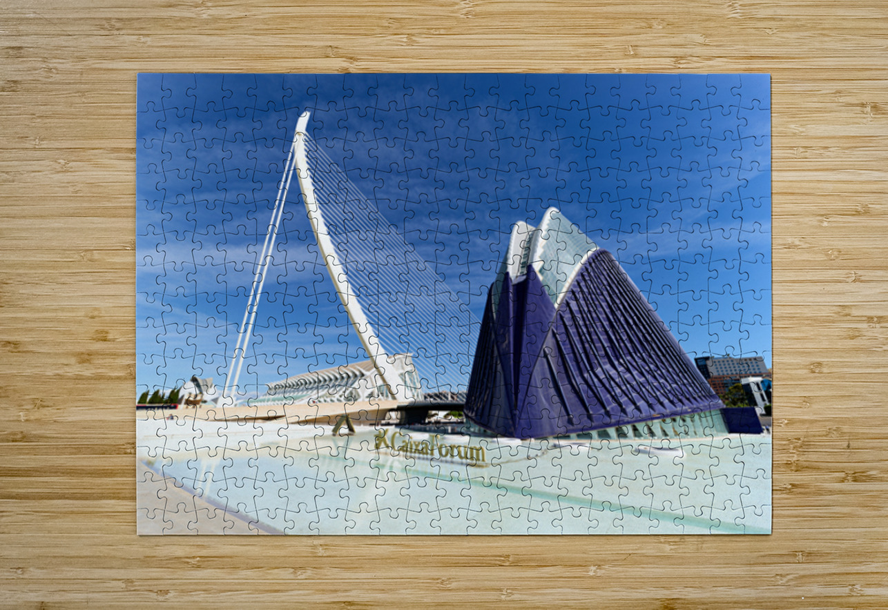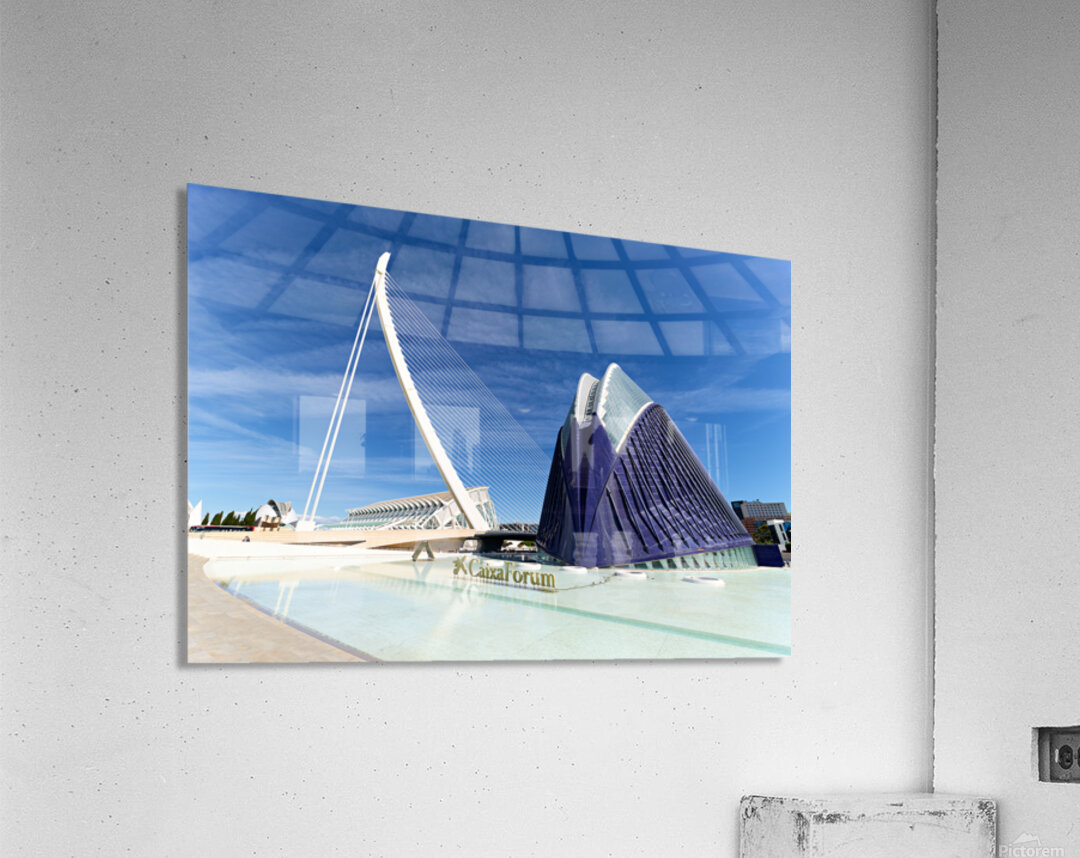 People walk near the Agora and Caixa Forum in the City of Arts and Sciences in Valencia. The sun shines brightly above during the day.