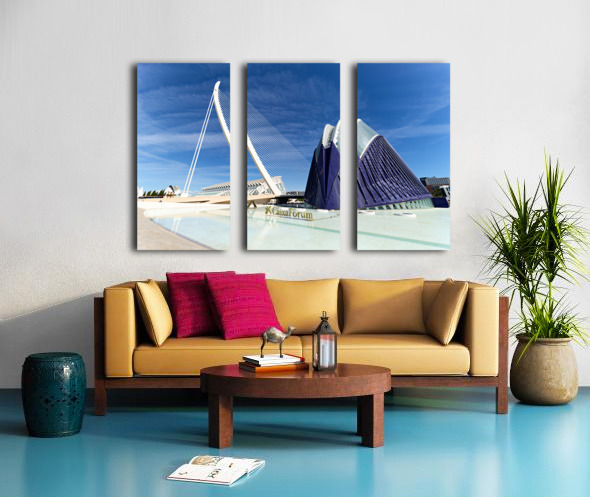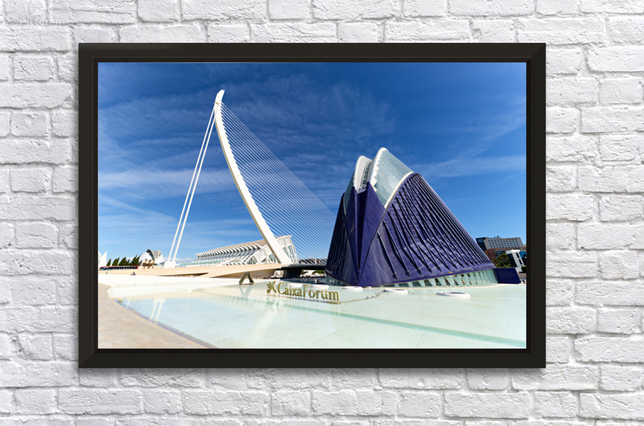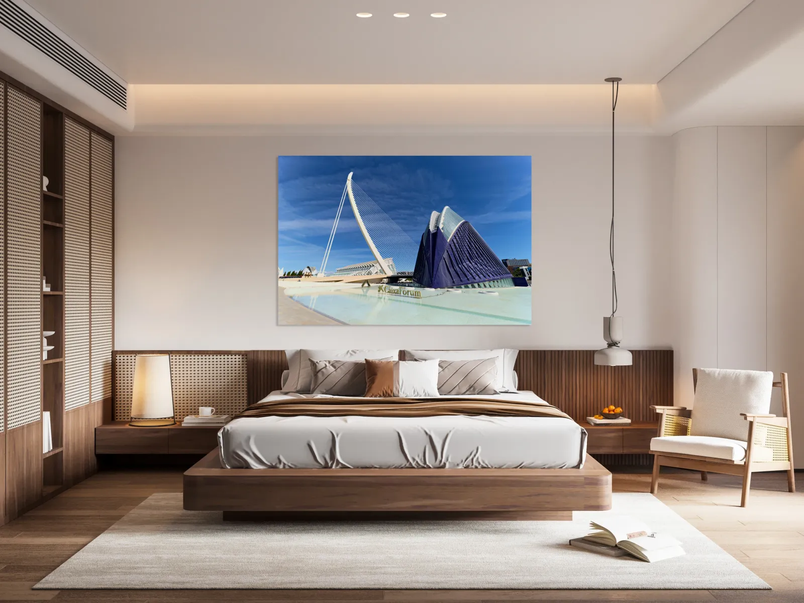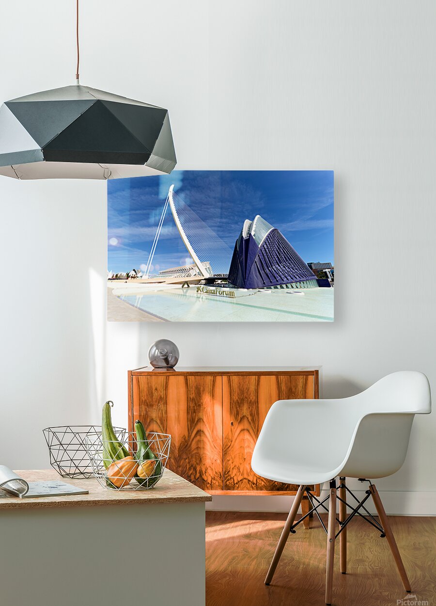 People walk near the Agora and Caixa Forum in the City of Arts and Sciences in Valencia. The sun shines brightly above during the day.