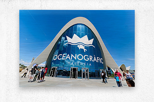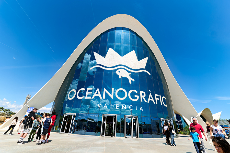 People gather outside the Oceanografic oceanarium in Valencia Spain. The structure showcases modern architecture under a clear blue sky.